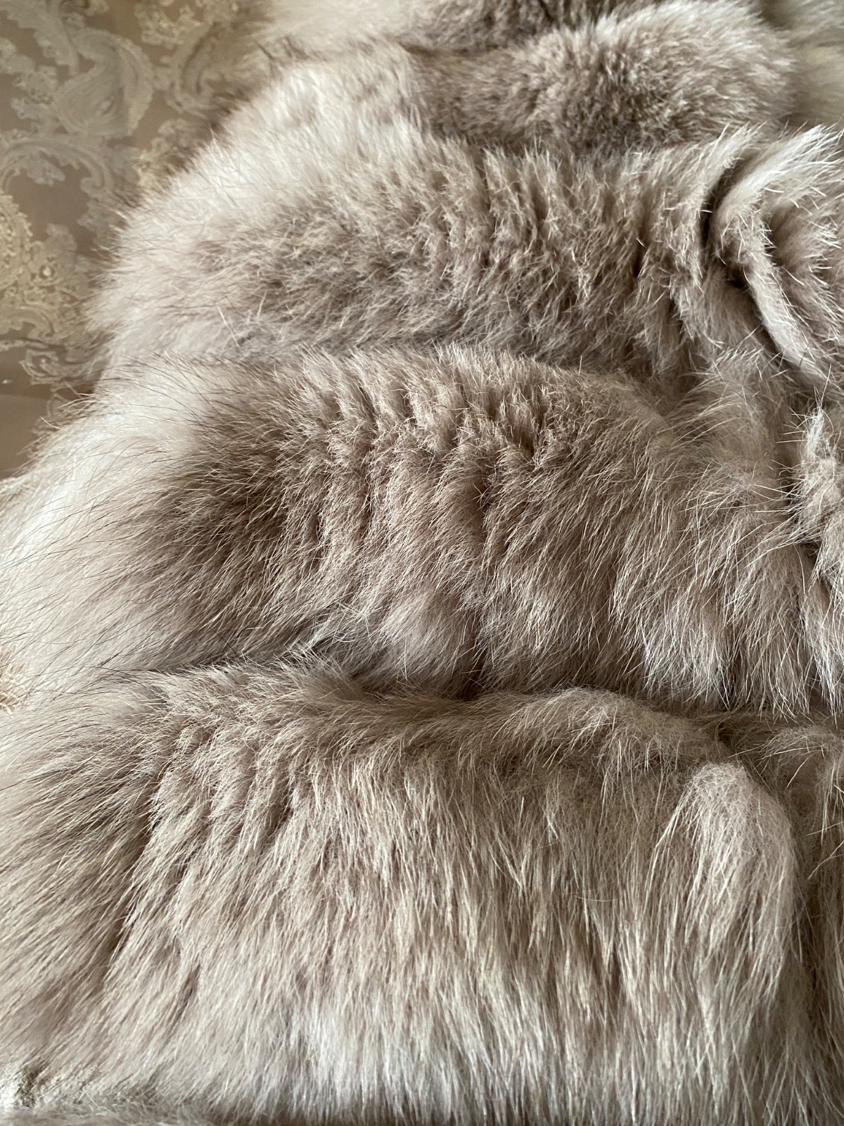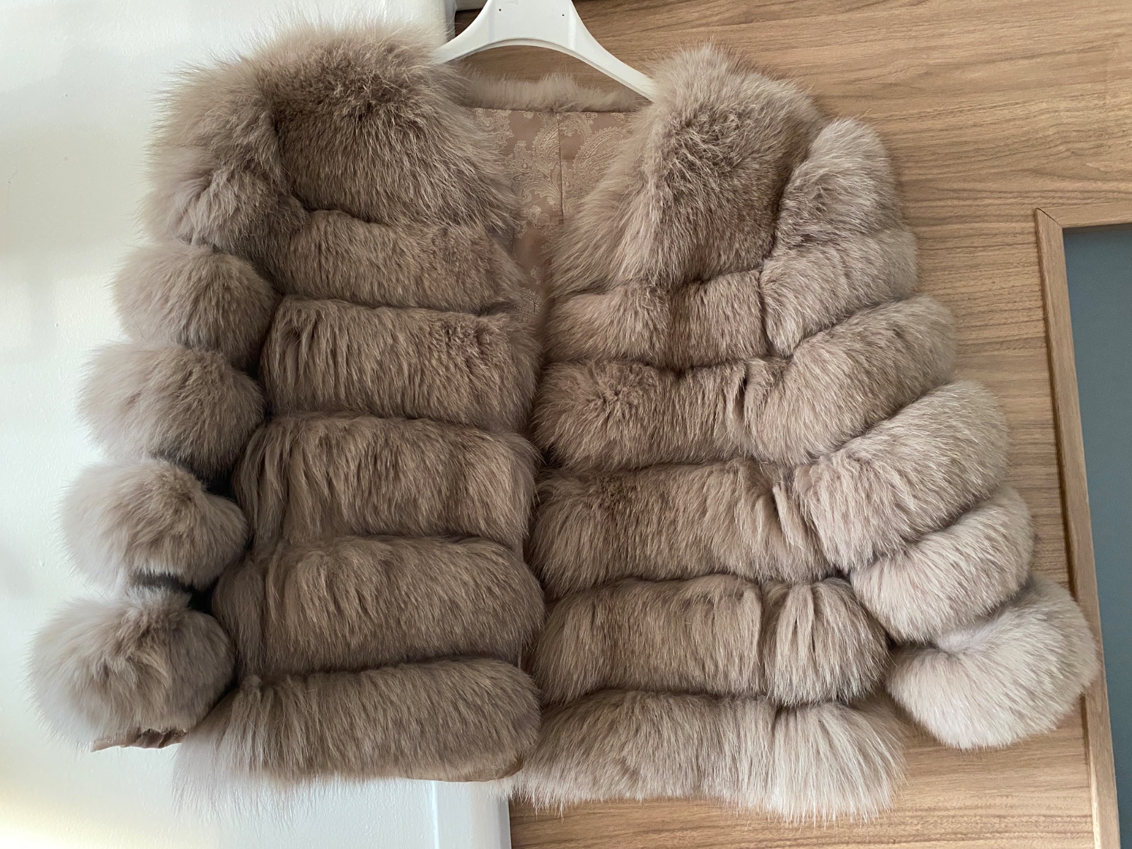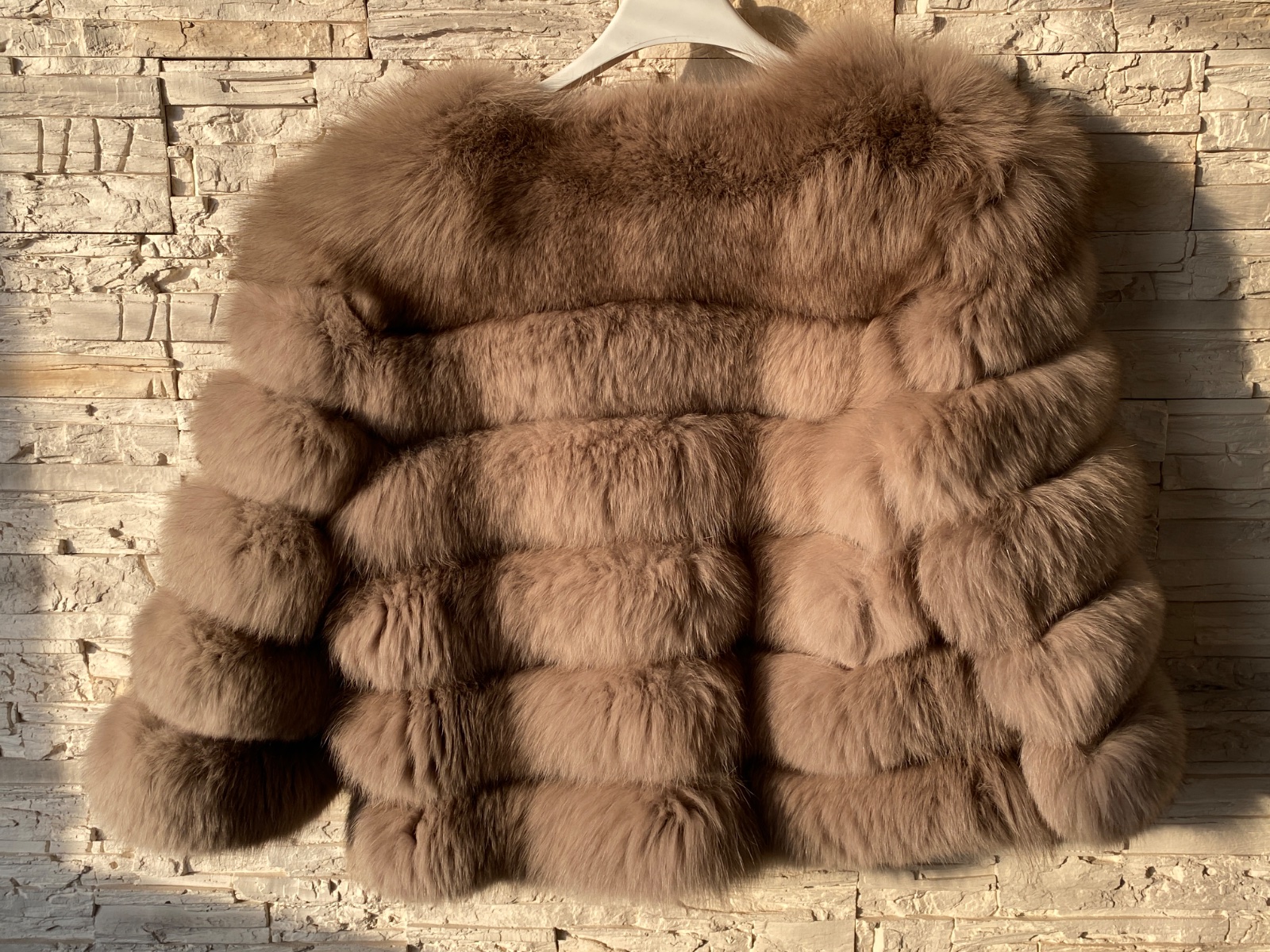 Predám krásny, elegantný kožuch v jemnej béžovo-hnedej (taupe) farbe. Ide o praktický model 2v1, ktorý môžeš nosiť ako klasický kožuch s rukávmi alebo po ich odopnutí ako štýlovú vestu.