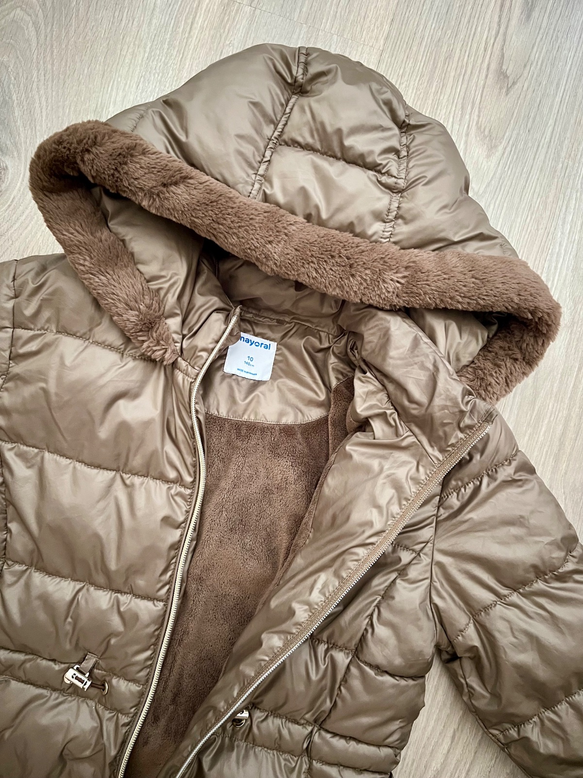 Vynikajúca zimná bunda Mayoral, krásna béžová farba, s odopinateľnou kapucňou. Kapucňa je olemovaná kožušinou, ktorá sa dá tiež samostatne odopnúť. Dve vrecká, v páse vypasovaná, rukávy ukončené ...