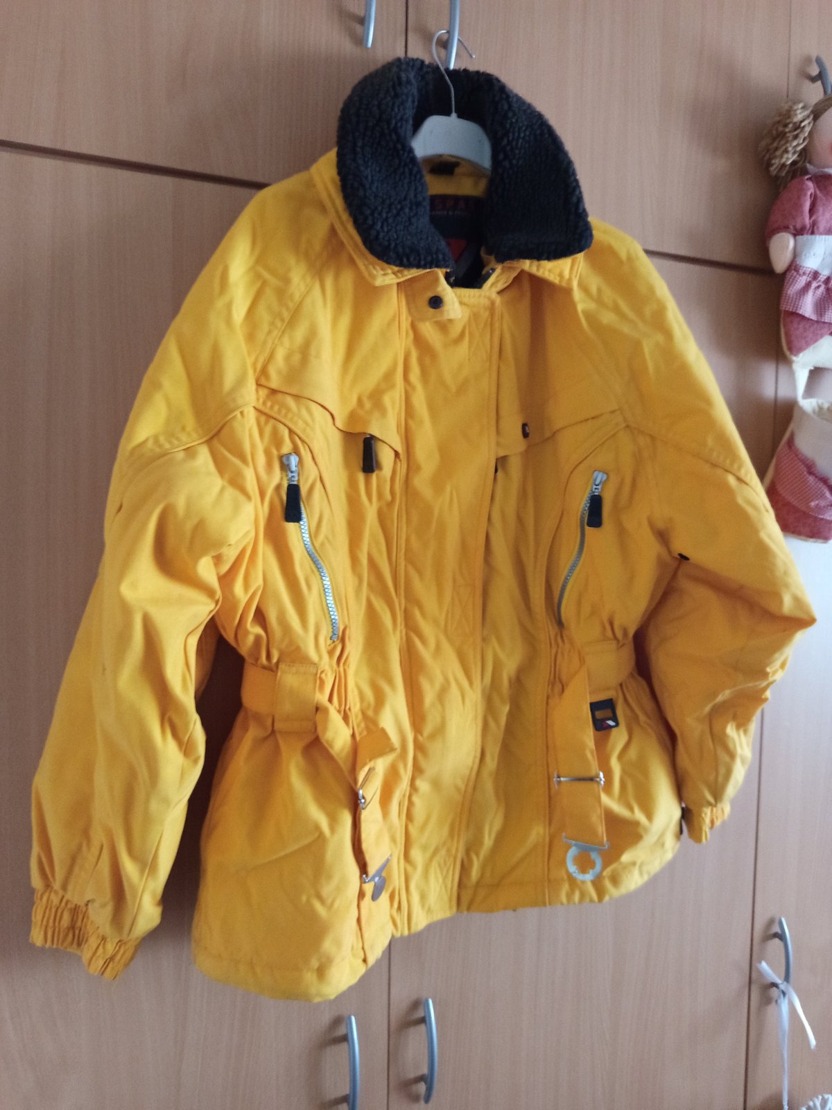 Luxusná značková bunda nádhernej teplej horčicovo žltej farby s pravou kožušinou na golieri a zirkónmi na zipse... 👌. Jemne A-čkový strih. Dlzka 63cm, šírka cez prsia 51cm, šírka v páse 46cm, dĺžka...