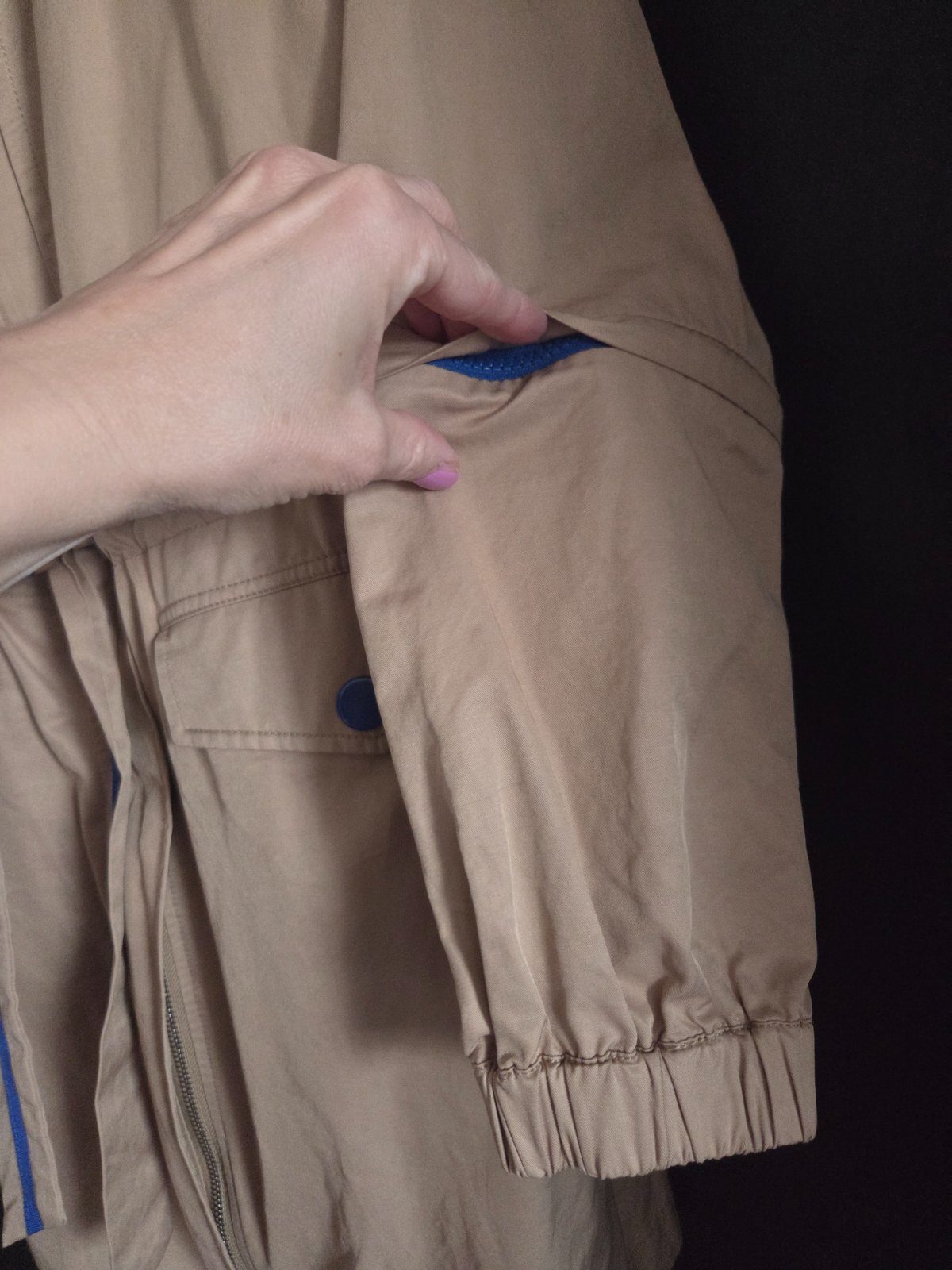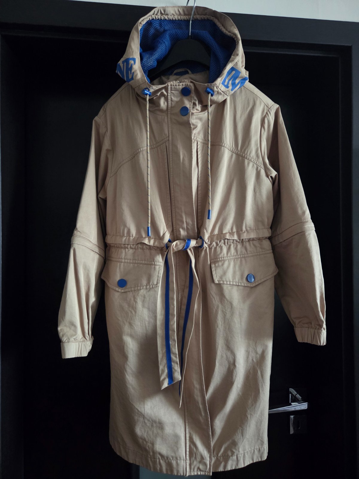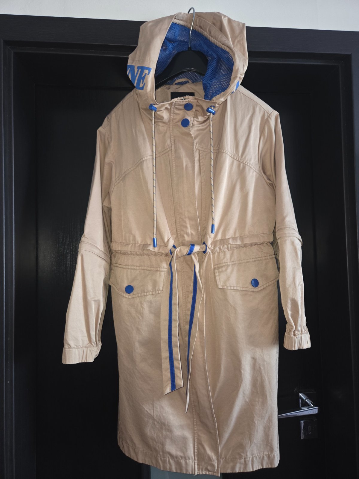 Štýlový trenčkot, možnosť skrátiť rukávy na 3/4, písaná veľkosť XS, ale určite sedí na S