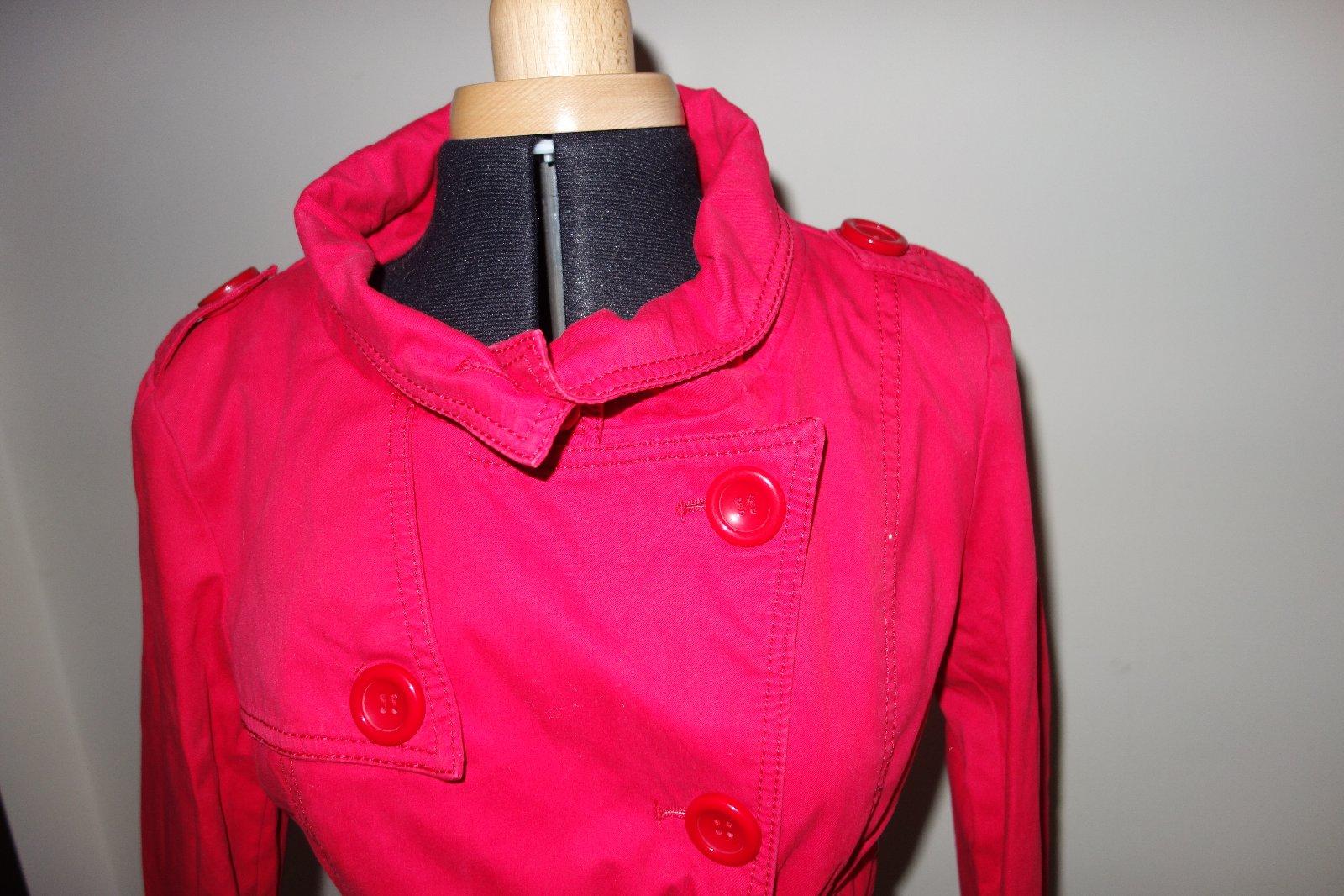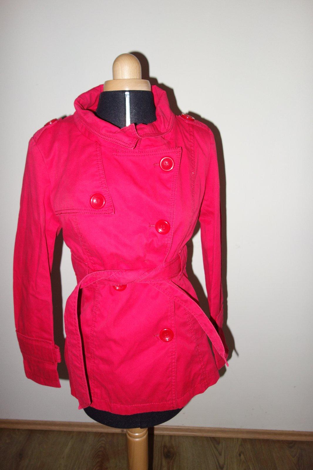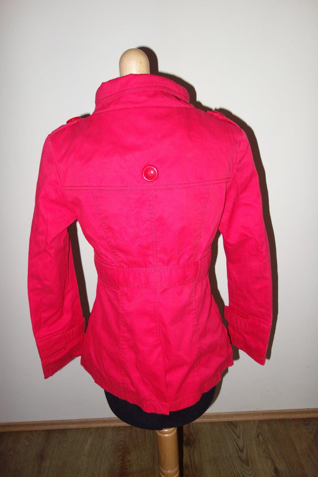 Pekny tensi kabatik vo velmi dobrom nosenom stave (chyba vpredu jeden gombik- ale da sa nahradit tym, co je vzadu a tam dat iny). Velkost je pisana 1- podla mna je to taka 34. Na obrazku vyzera byt ruzovy, ale je cerveny.