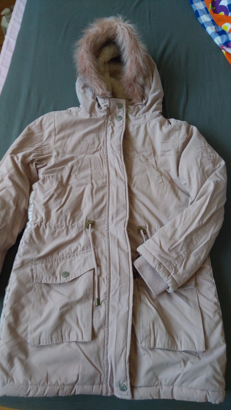 Bunda skôr na teplejšiu zimu. Jedinú chybu má že na zipse chýba koliečko ale dá sa zapnúť aj bez toho. Pozri foto. Od krku rukav 63cm, pod pazuchou 39cm,, dĺžka 73cm