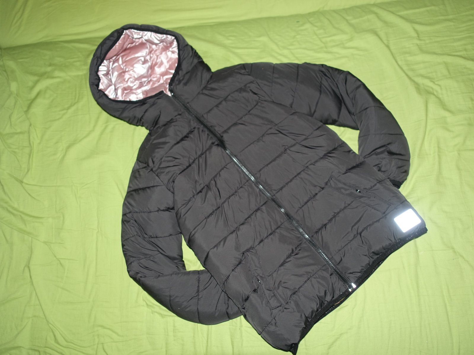 Krasna obojstranna zimna bundicka- nova, s visackami. Z jednej strany je leskla ruzova, z druhej tmavoseda/cierna.2