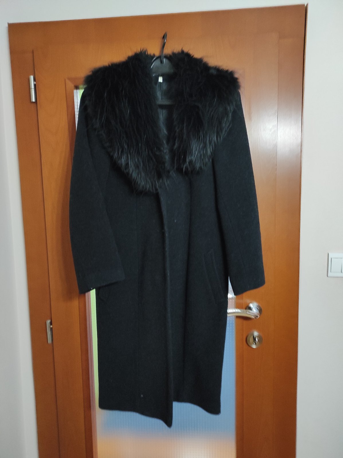 Predám dlhý čierny kabát, veľkosť 36. Kabát je v bezchybnom stave z kvalitného materiálu. Je hrubší. Zapínanie na 3 gombíky, má odnímateľnú kožušinu. Dĺžka rukávov 63cm, Vzadu je rozparok dlhý 60cm...