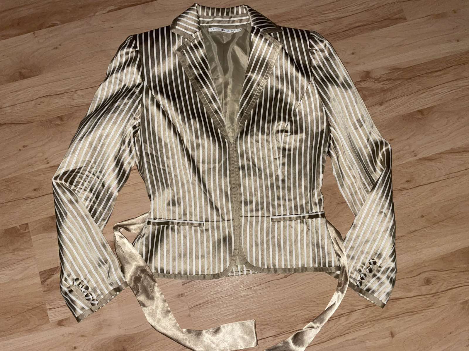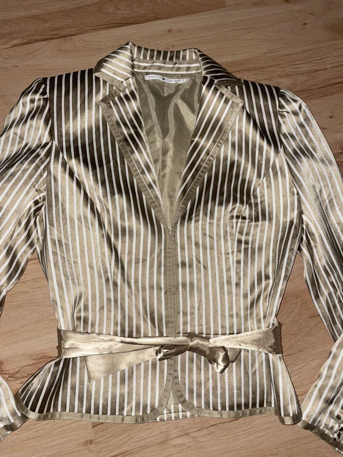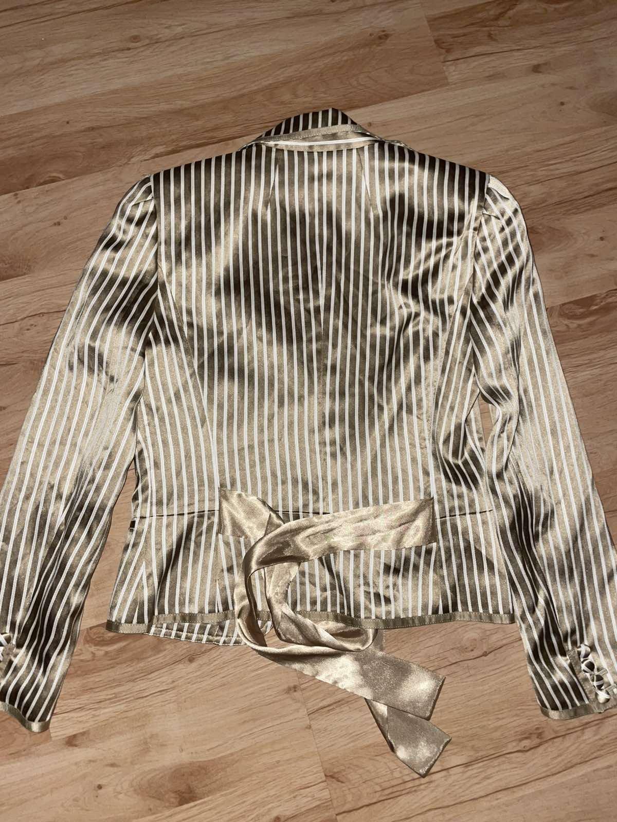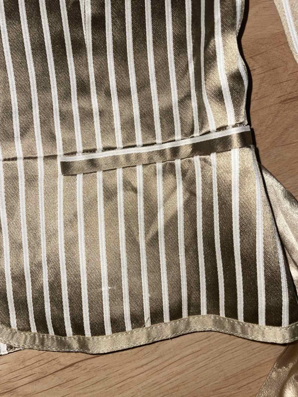 Nádherné, kvalitne vypracované, béžovo-hnedo-zlate, hodvábny satén, uvazuje sa vpredu alebo vzadu, veľkosť US 6,sedí na S, šírka pod pazuchami cca 45-46 cm, dĺžka 54 cm