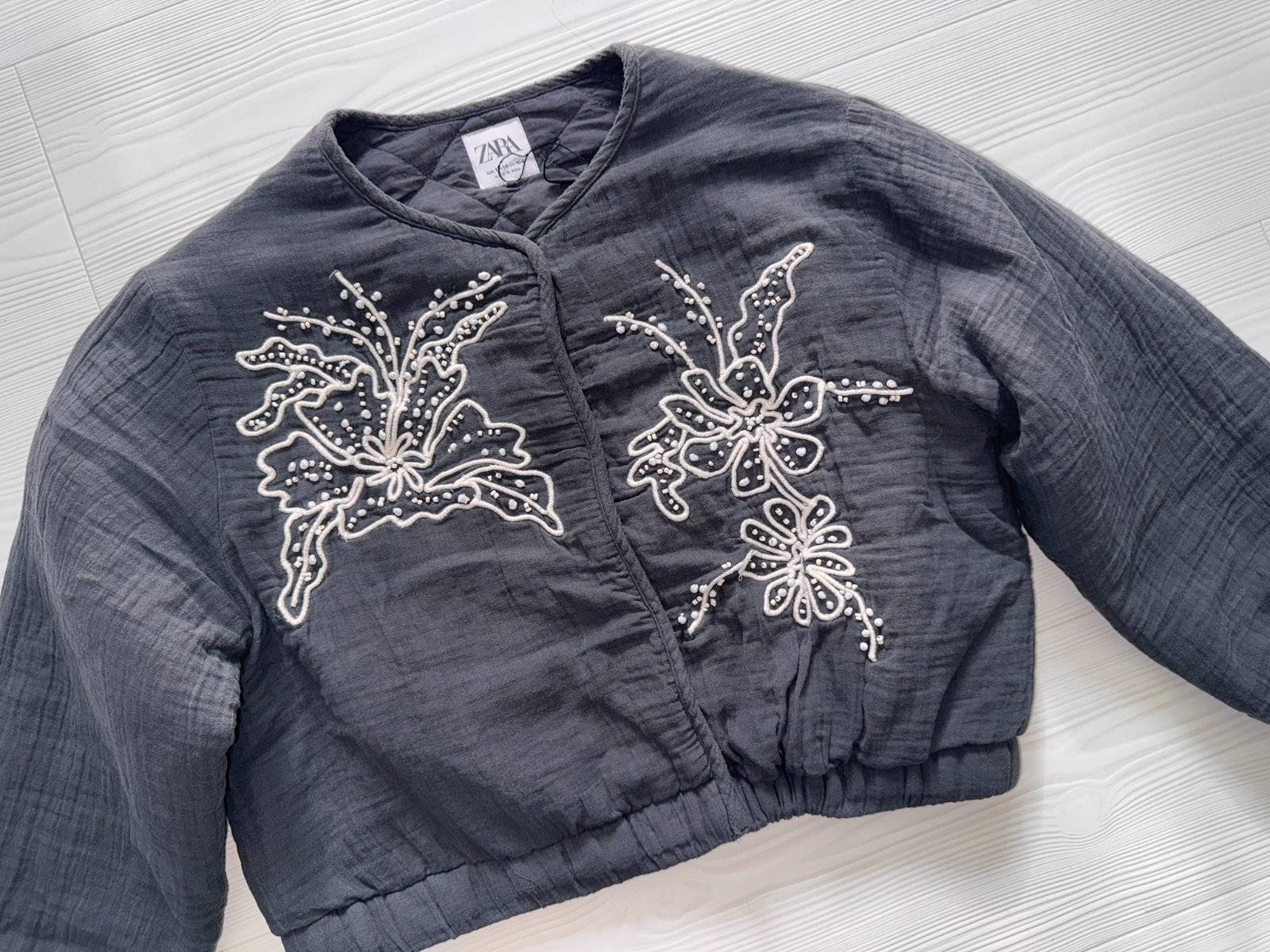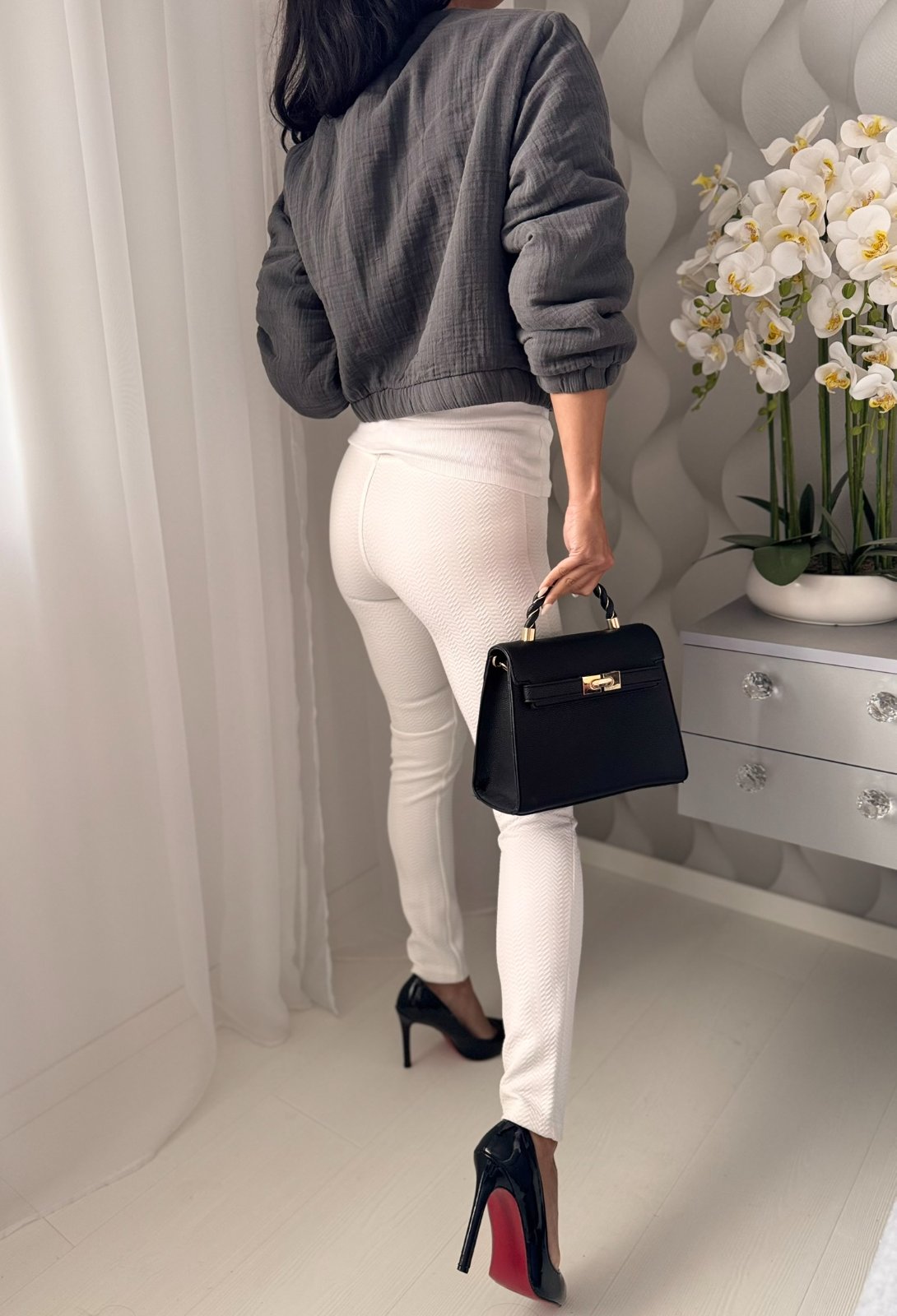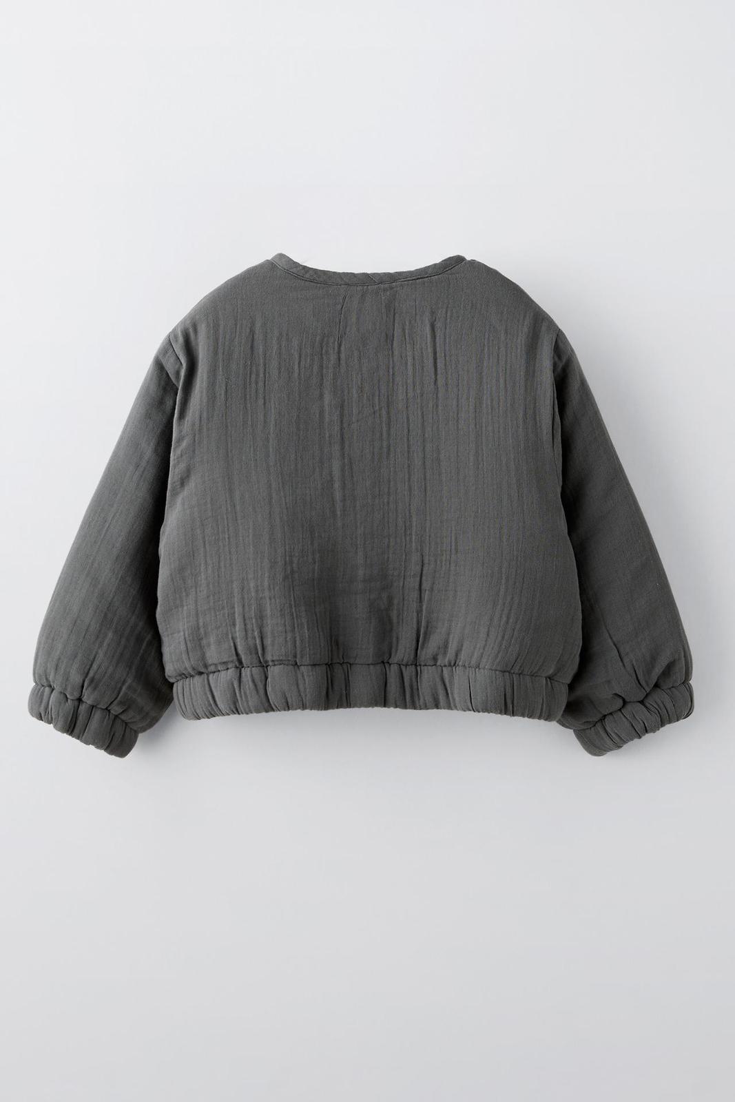 Krátka bunda bomber s okrúhlym výstrihom a dlhými rukávmi.