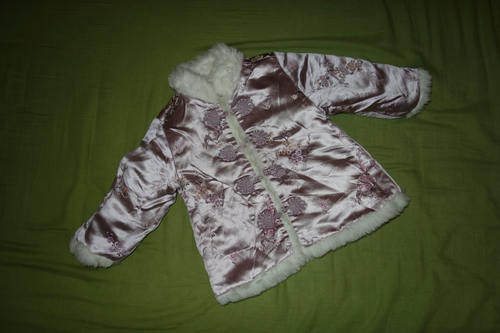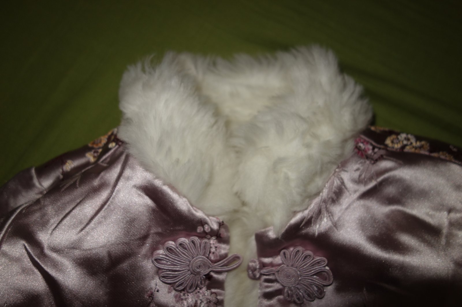 Krasny obojstranny umely kozusok vo velmi dobrom stave. Satenova strana ma par zatiahnuti. Z kozusinkovej strany su stitky, ktore treba odstrihnut.