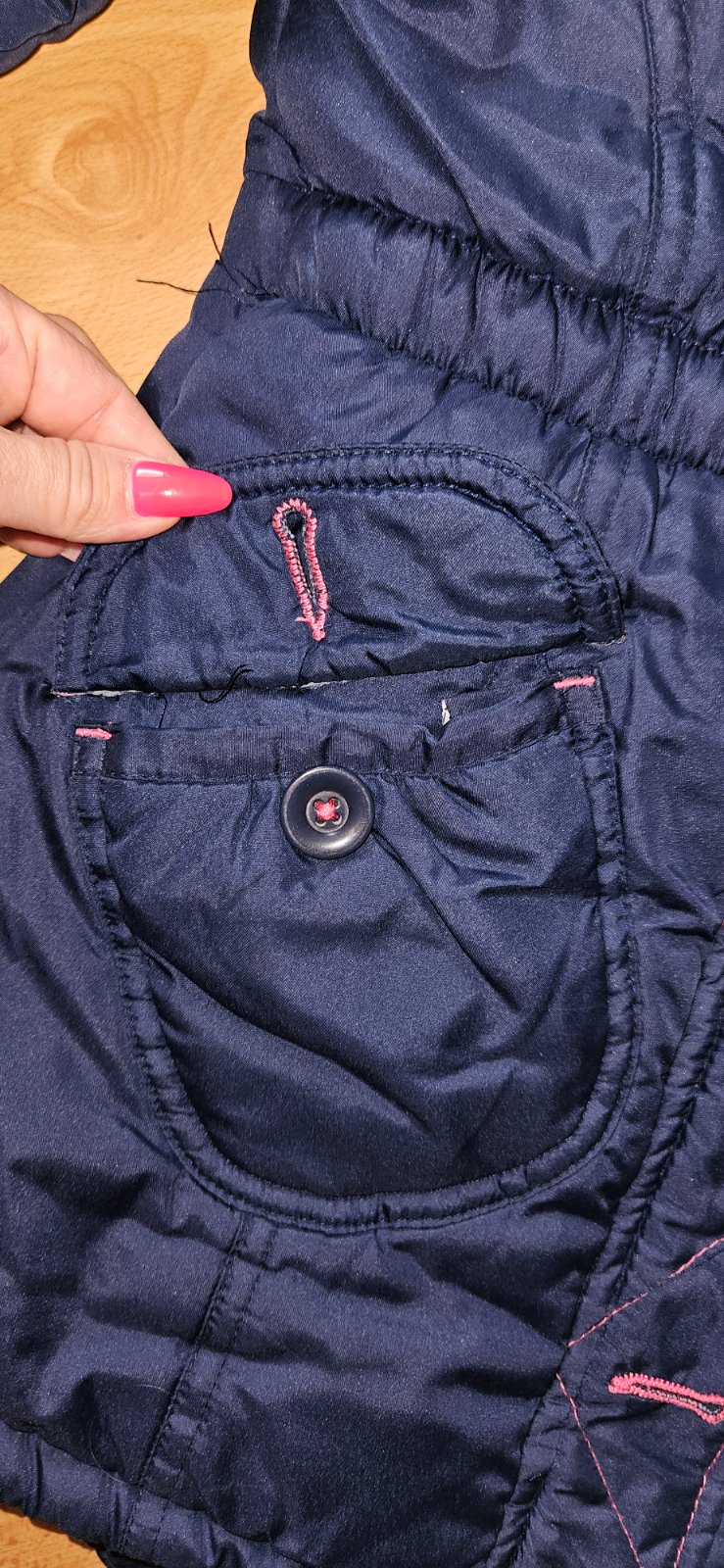 Predám dievčenskú vetrovku s kapucňou. Kapucňa i vnútro vetrovky sú zateplené hrejivou podšívkou. Vetrovka má 2 vonkajšie vačky. Zapínanie: zips a gombíky Farba: tmavomodrá v kombinácii s ružov...