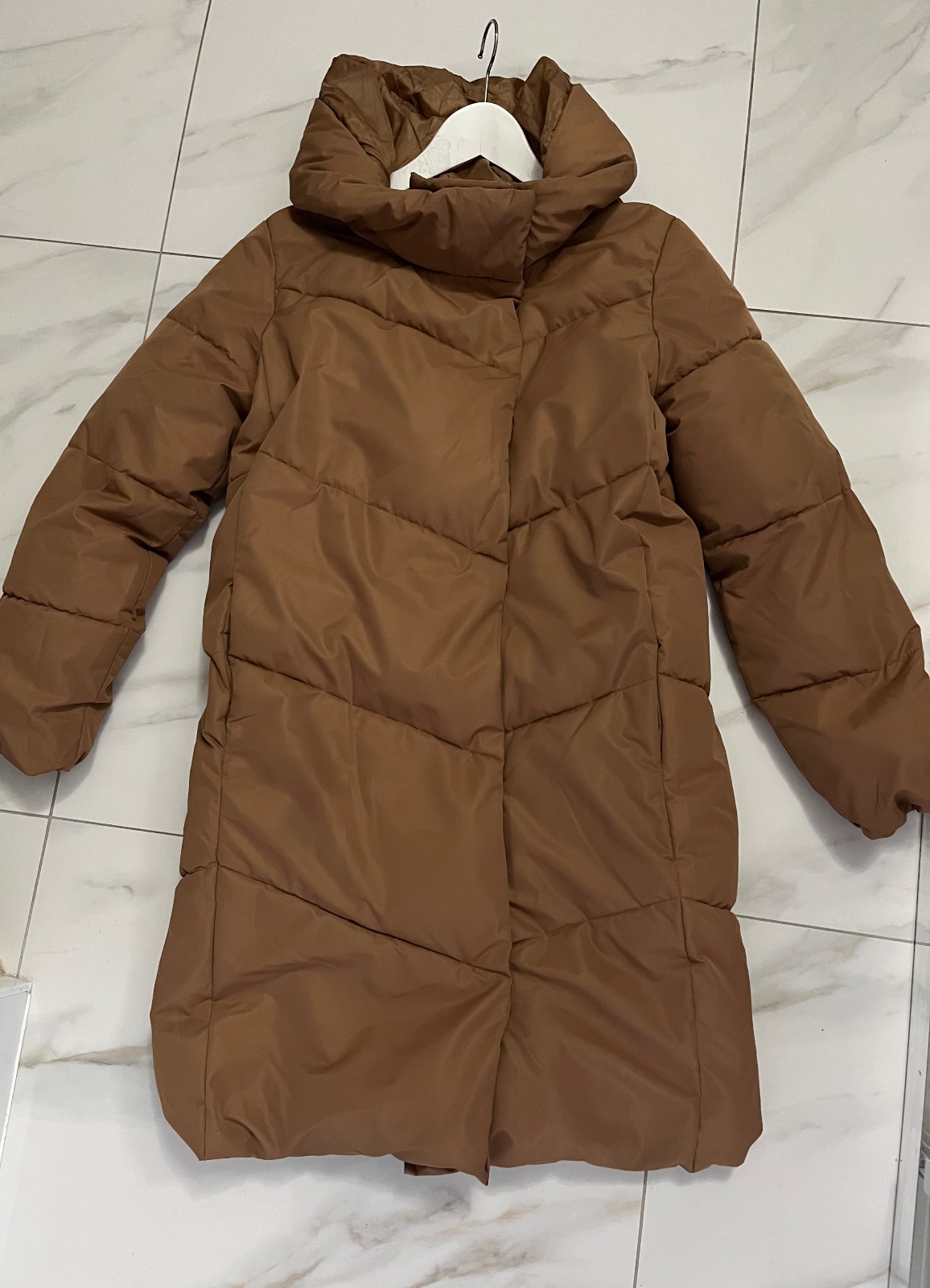 Dlžka 84 cm, prsia 2x47 cm, rukáv 69 cm. Piesková farba. Fantasticky prepracovaný golier, dvojitý + kapucňa v zipse v golieri. Zlaté kovové doplnky, trošilinka vidieť nosenie na koncoch rukávov, al...