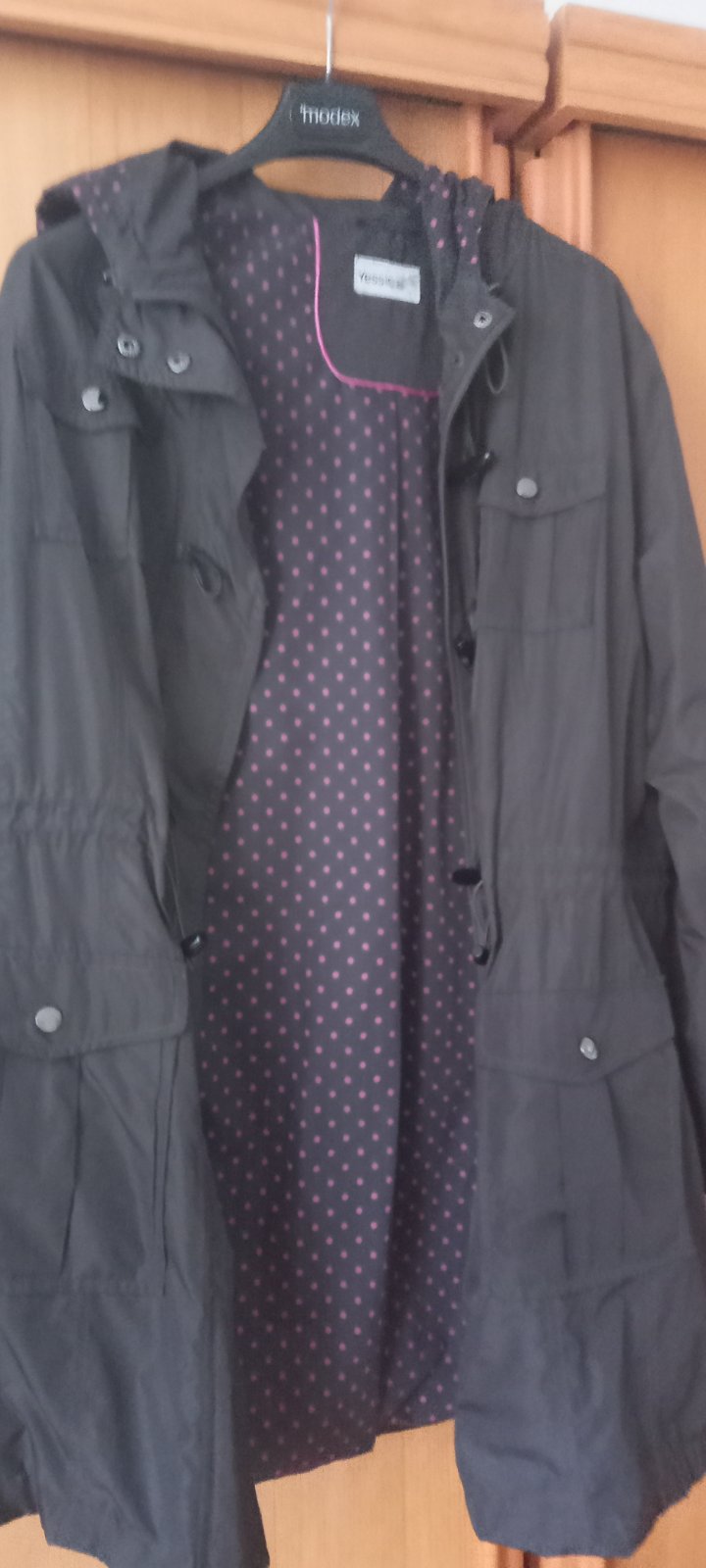Bundička má peknú olivovo zelenú farbu, veľkosť 44. Rozmery pod pazuchami 56 cm, dĺžka 65 cm, dĺžka rukáva je 64 cm. Bundička je s vreckami, z vnútornej strany má šnúrky a dá sa stiahnuť v páse, j...
