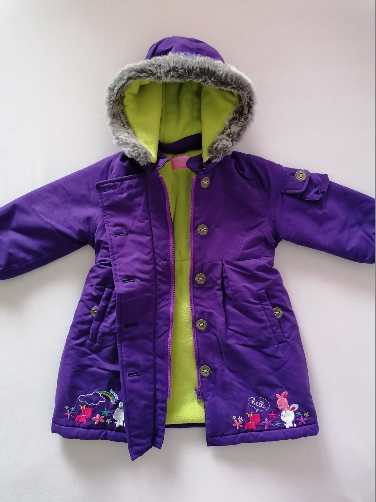 Pekna, prakticka, tepla zimna bundička, predlzeneho strihu, s vyšitými farebnymi obrazkami na spodku :) Znacka LC Waikiki. Velmi dobry stav.