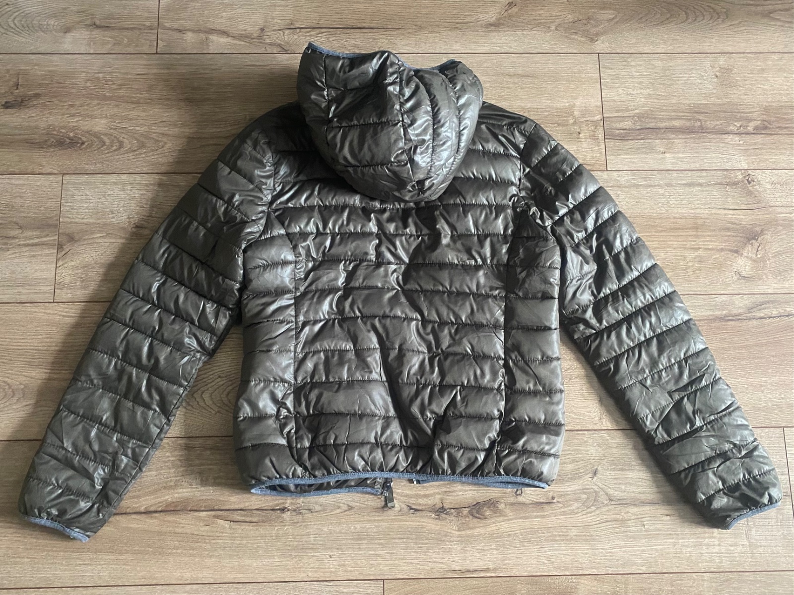 Posuniem ďalej túto olivovú bomberku. Veľmi príjemný materiál, idealna na chladnejšie letné dni. Veľkosť sedí. Bundička je bez poškodení