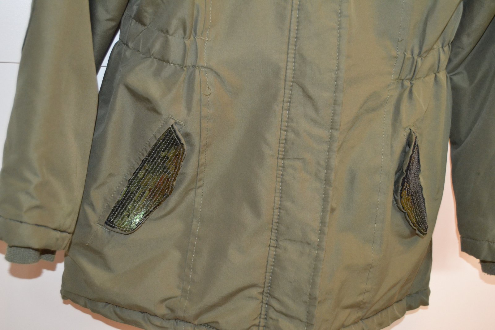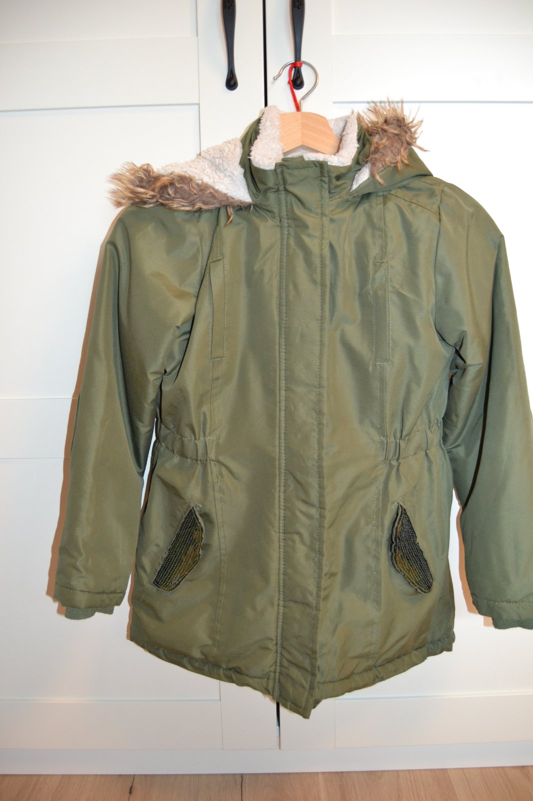 Dievčenská zimná bunda s kapucňou zelenej farby, vrecká sú ozdobené zelenými flitrami, vnútro je zateplené, veľkosť 134/140, obvod cez hrudník 44x2 cm, rukávy 55 cm, dĺžka 62 cm, TOP STAV