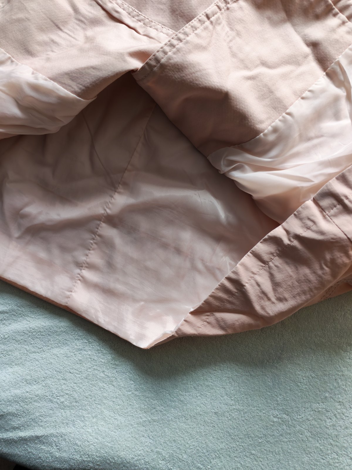 Farba pudrová, namna úzke uz. Velkost M/L, Dlzka 78cm, sirka pod prsami 49cm, pás 41cm, rukàv od pleca 56cm. Na chrbte zašité 3cm pri šití