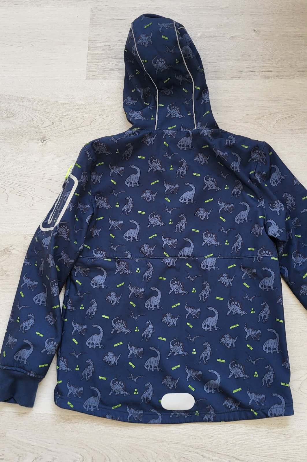 Krásna softshellová bunda s dinosaurami. Reflexné prvky na ramene, vreckách a na chrbte/kapucni. Nosená, drobné opotrebenie vidno na koncoch rukávov, vo veľmi dobrom stave. Možnosť vyskúšať BA - Karlova Ves.