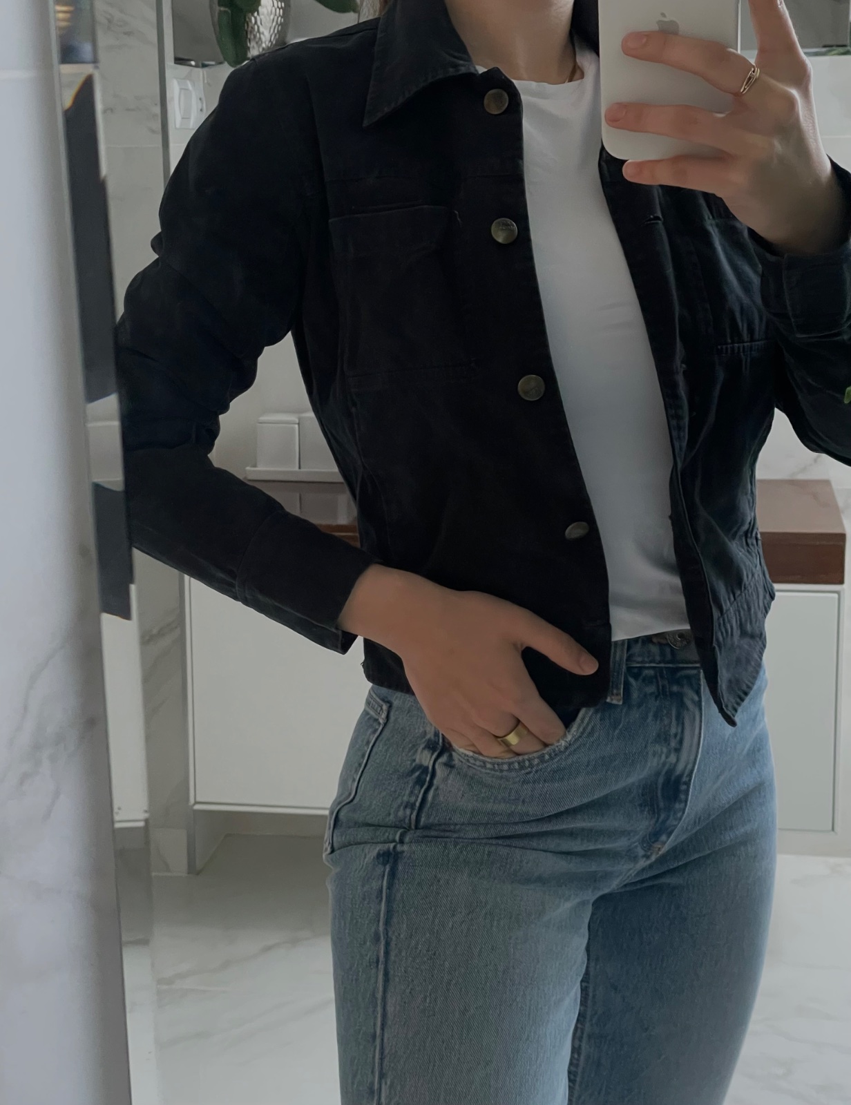 Nosená, v peknom stave. Na zadnej strane malinké poškodenie, pri nosení vôbec nevidno, ale pre istotu naň upozorňujem. Sadne aj na menšie M.