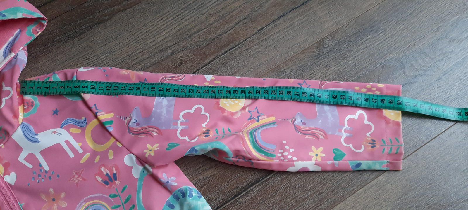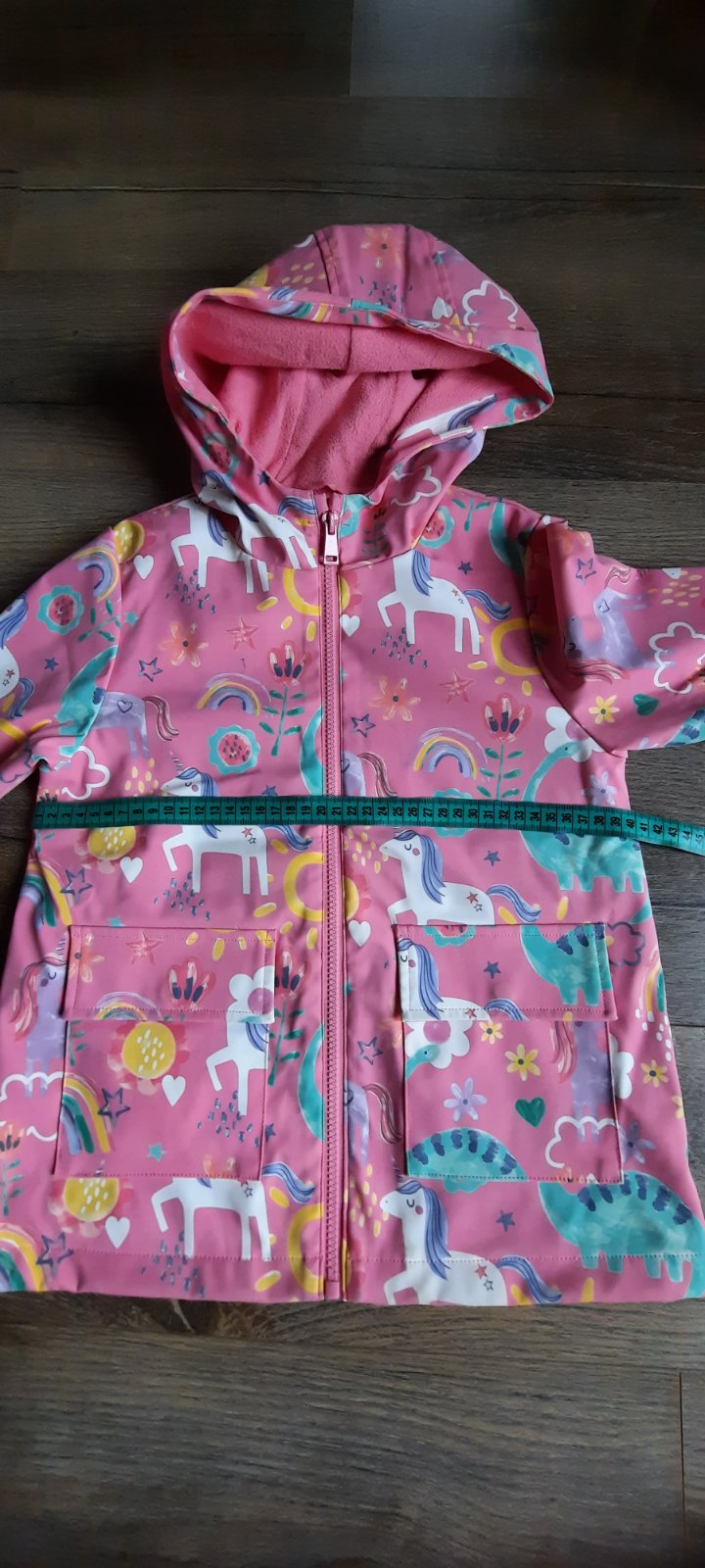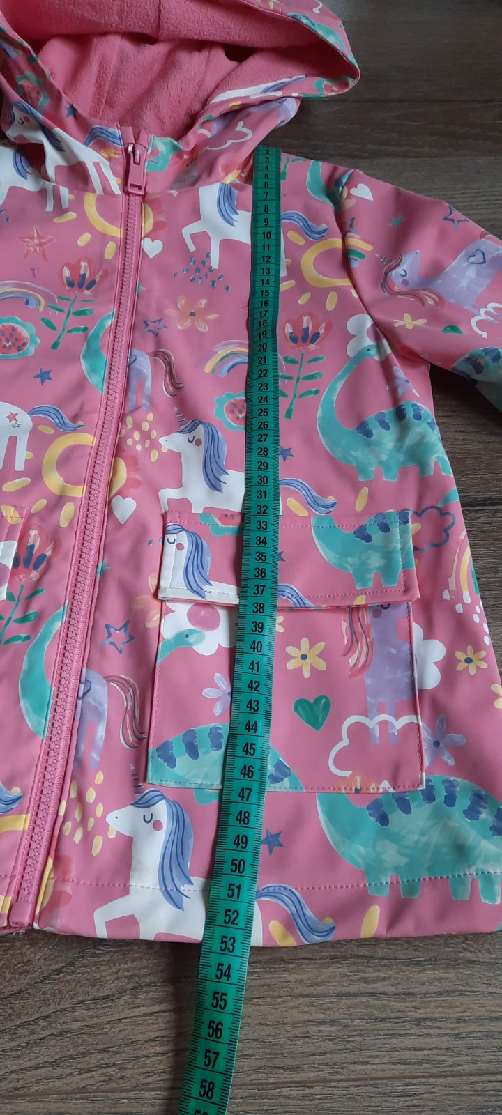 Je predĺženého strihu, kapucňa je na pevno , predné vrecká na cvočky.