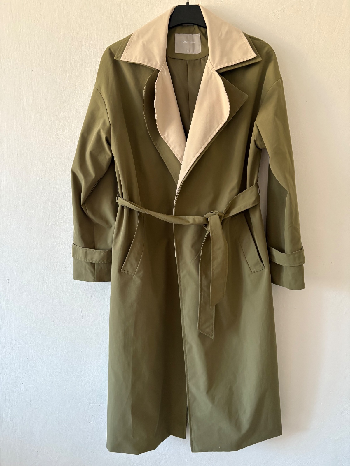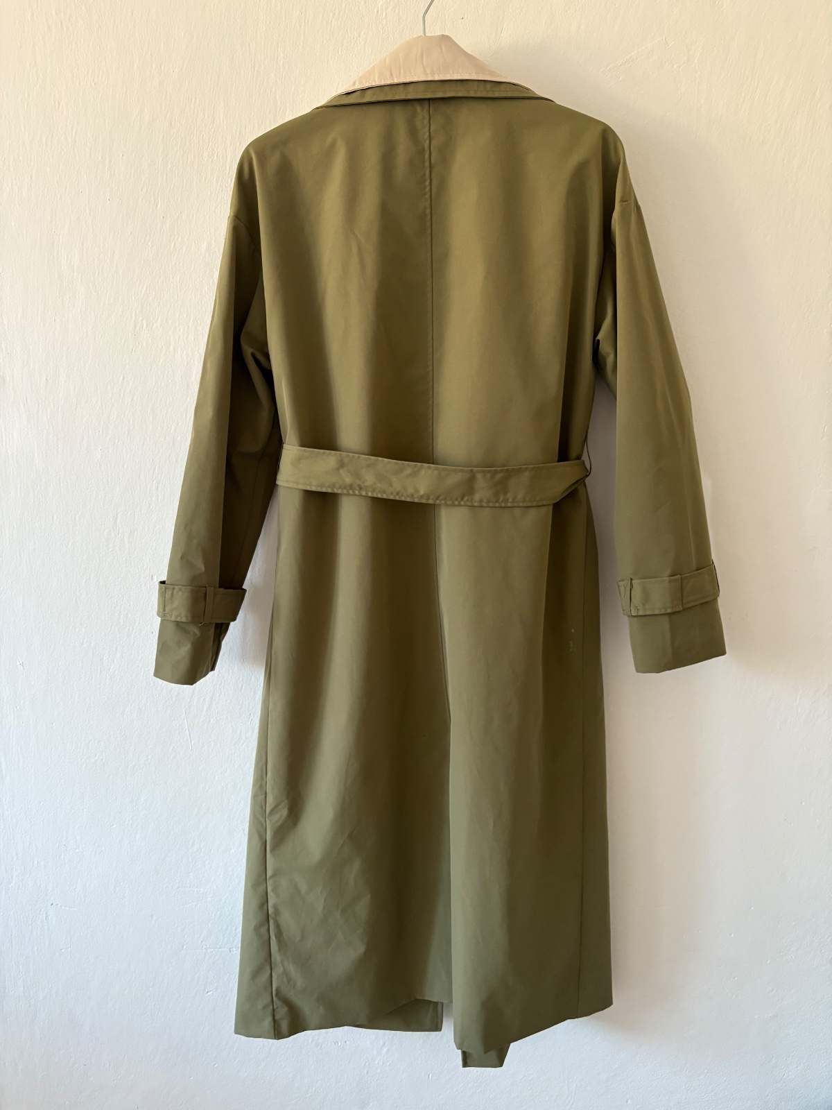 Zelený trenchcoat s kontrasnýmu prvkami. Zapína sa s opaskom. Veľkosť sadne na S-L.