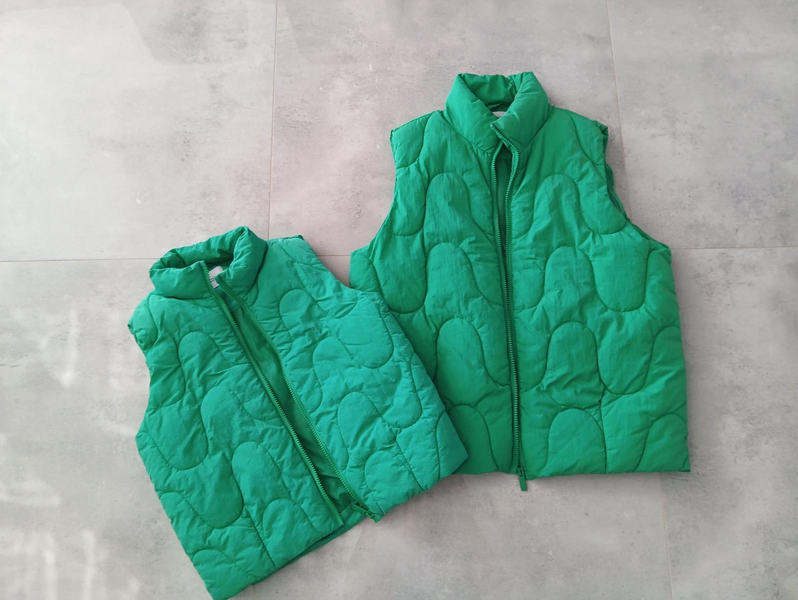 Pre dievčatko veľkosť 128 a pre maminku 164. Ja mám 177 CM a sedela super. Stav výborný. Cena spolu za obe vesty je 15 eur