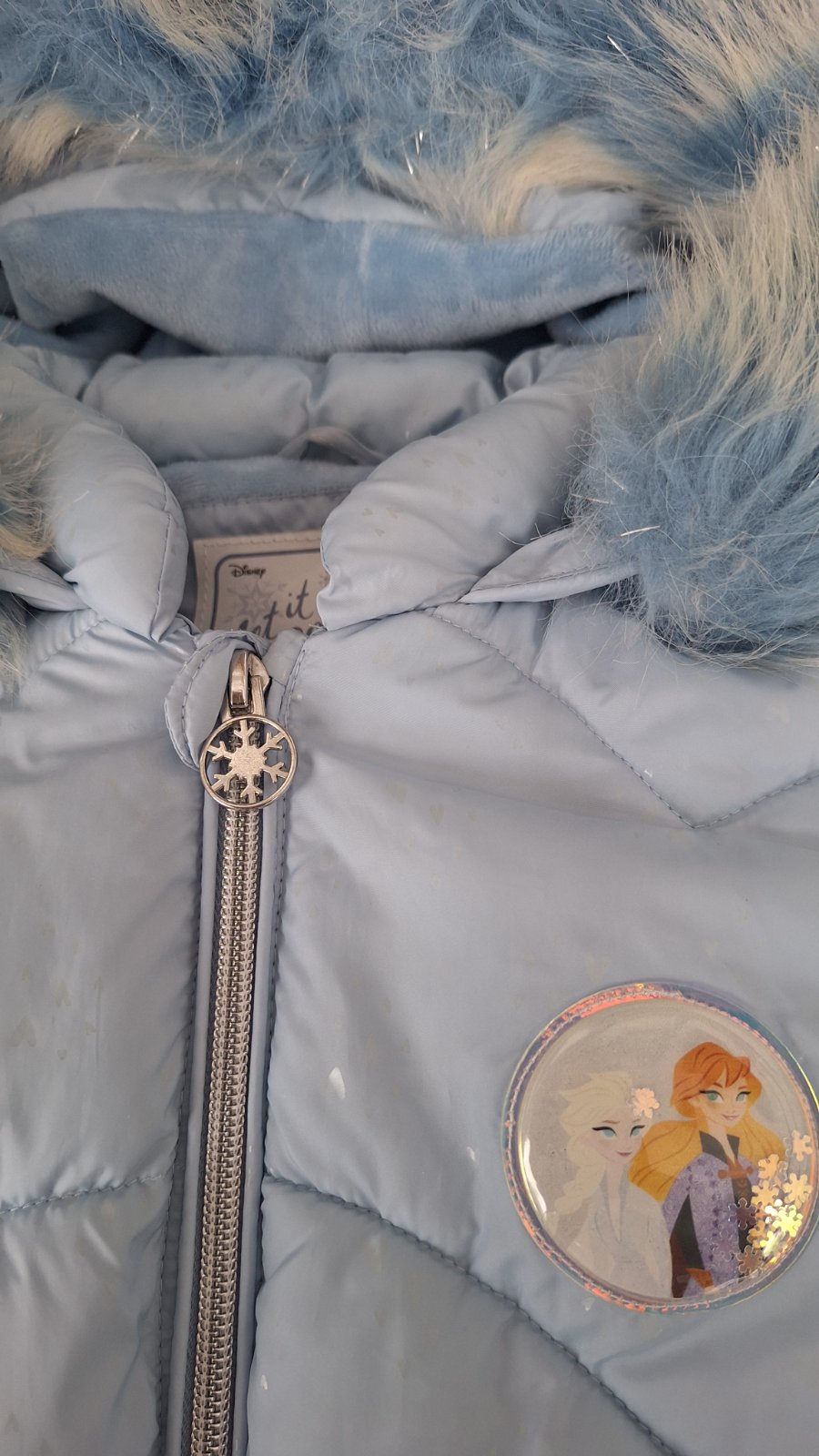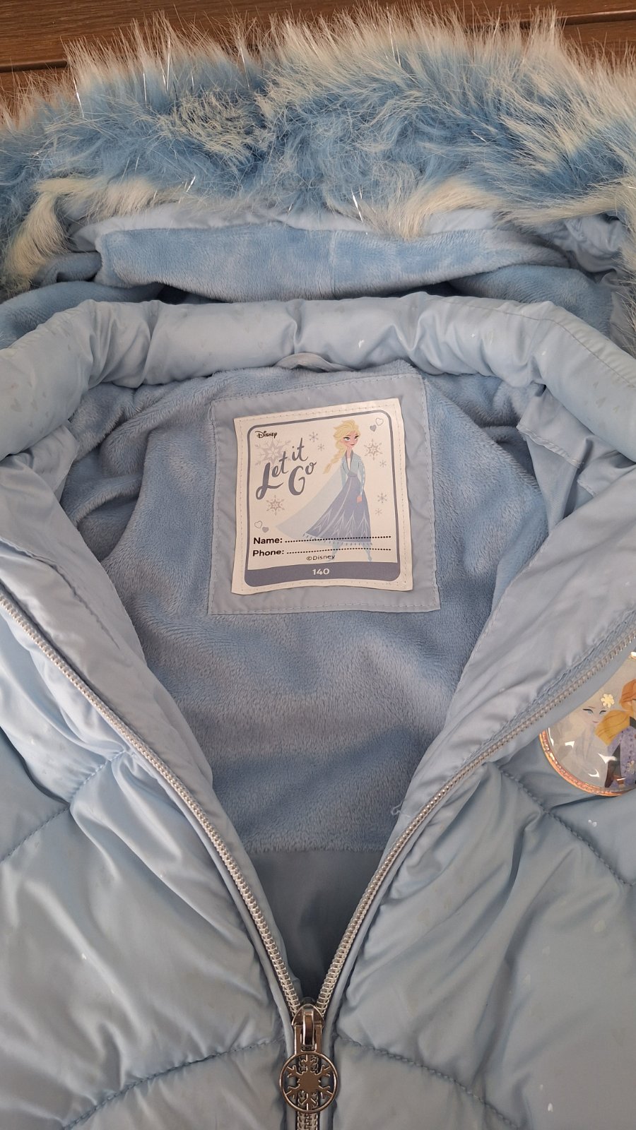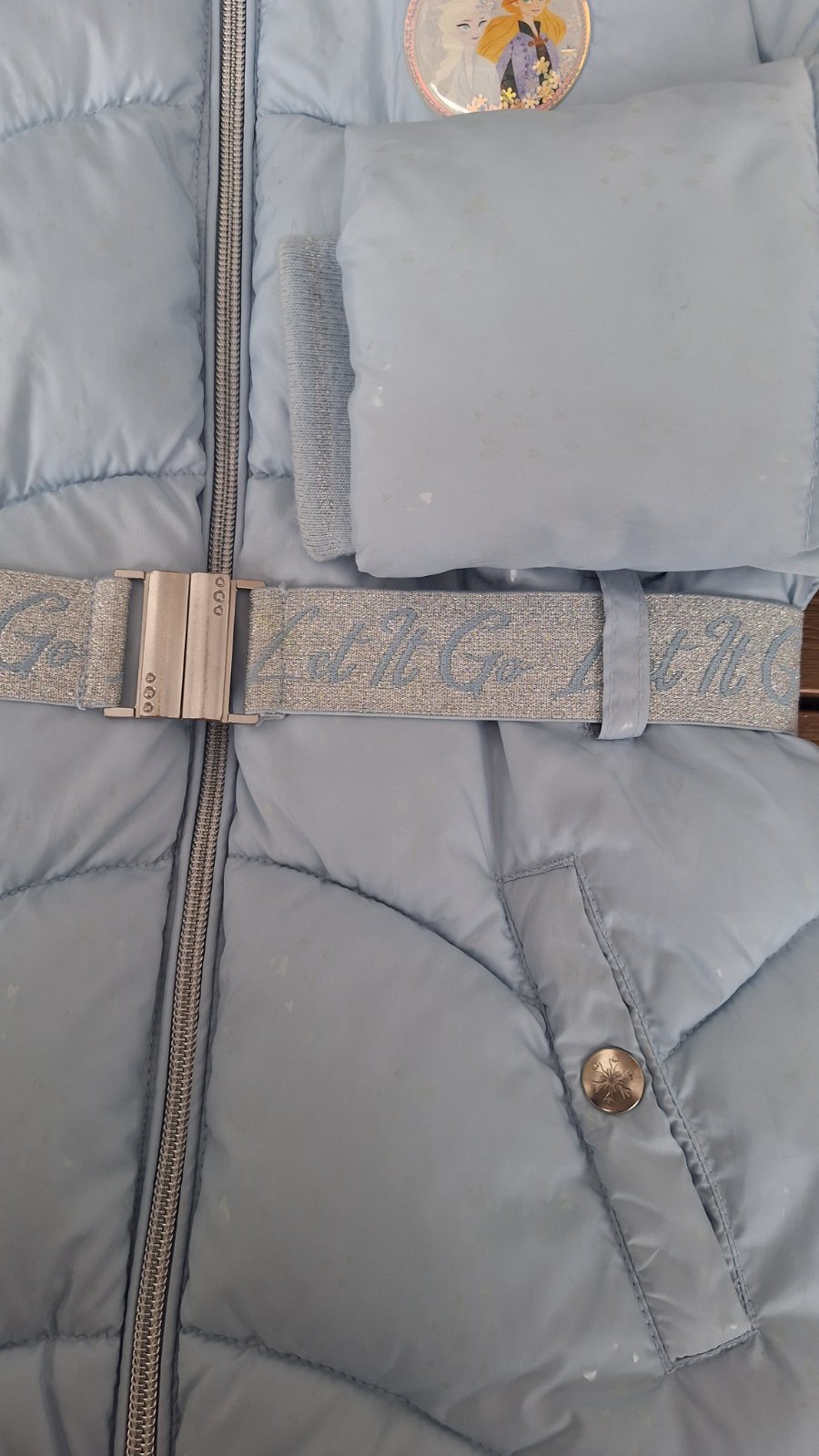 Predám zimnú bundu, veľkosť je 140, ale uvádzam 134, lebo sa mi zdá skôr 134. Veľmi pekná bledomodrá farba (nedalo sa presne odfotiť), jemne trblietavá látka. Kapucňa sa dá odopnúť, aj kožušina sa dá samostatne odopnúť, má opasok, na rukávoch elastický patent.
