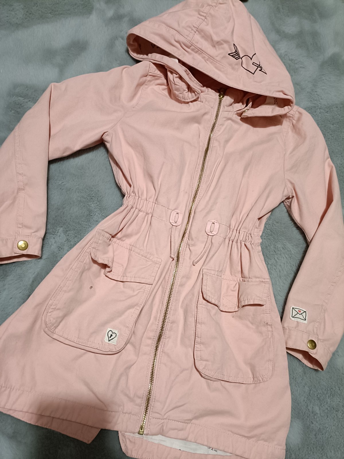 Jarná jesenná bunda,HM,134 veľkosť,pekne detaily,strih do Ačka,vnútri možné aj sťahovanie gombíkom okolo pása-gumička.pri vačku je čierna bodka,neskúšala som prostriedok na škvrny,inak bez poskodeni.cena symbolická