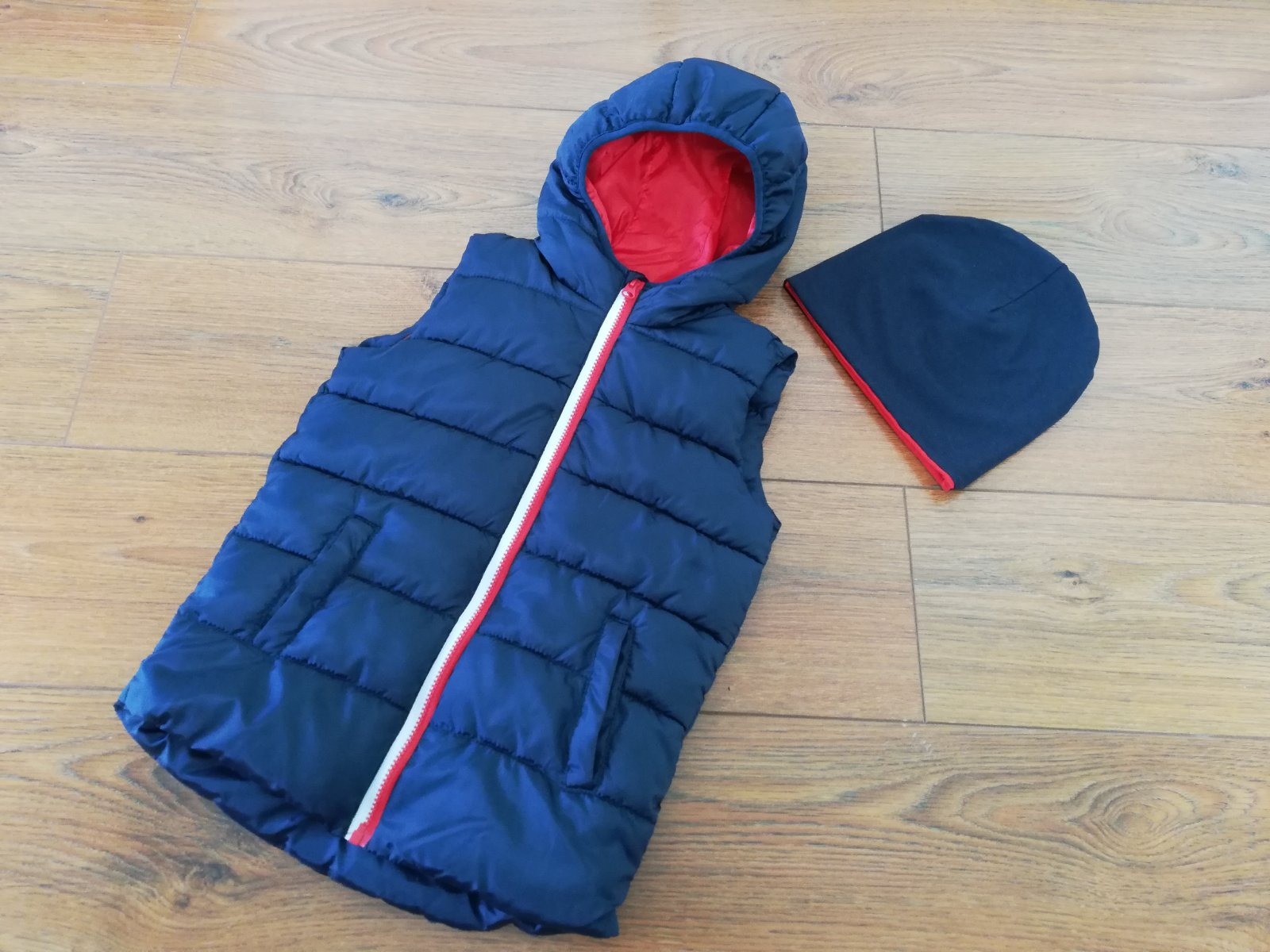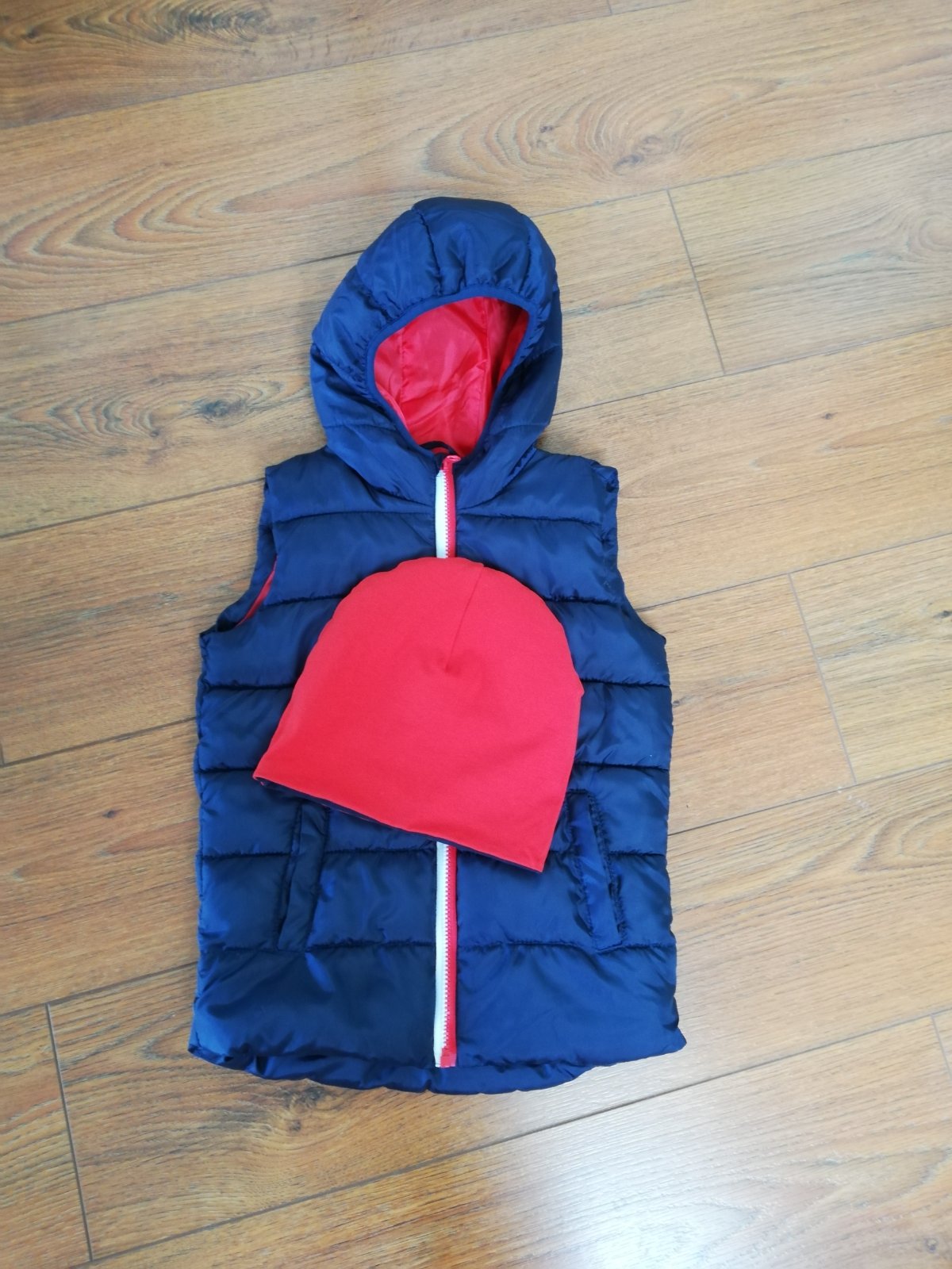Vesta s ciapkou sitou k tomu. Bavlnena obojstranna ciapka. Vsetko ako nove.