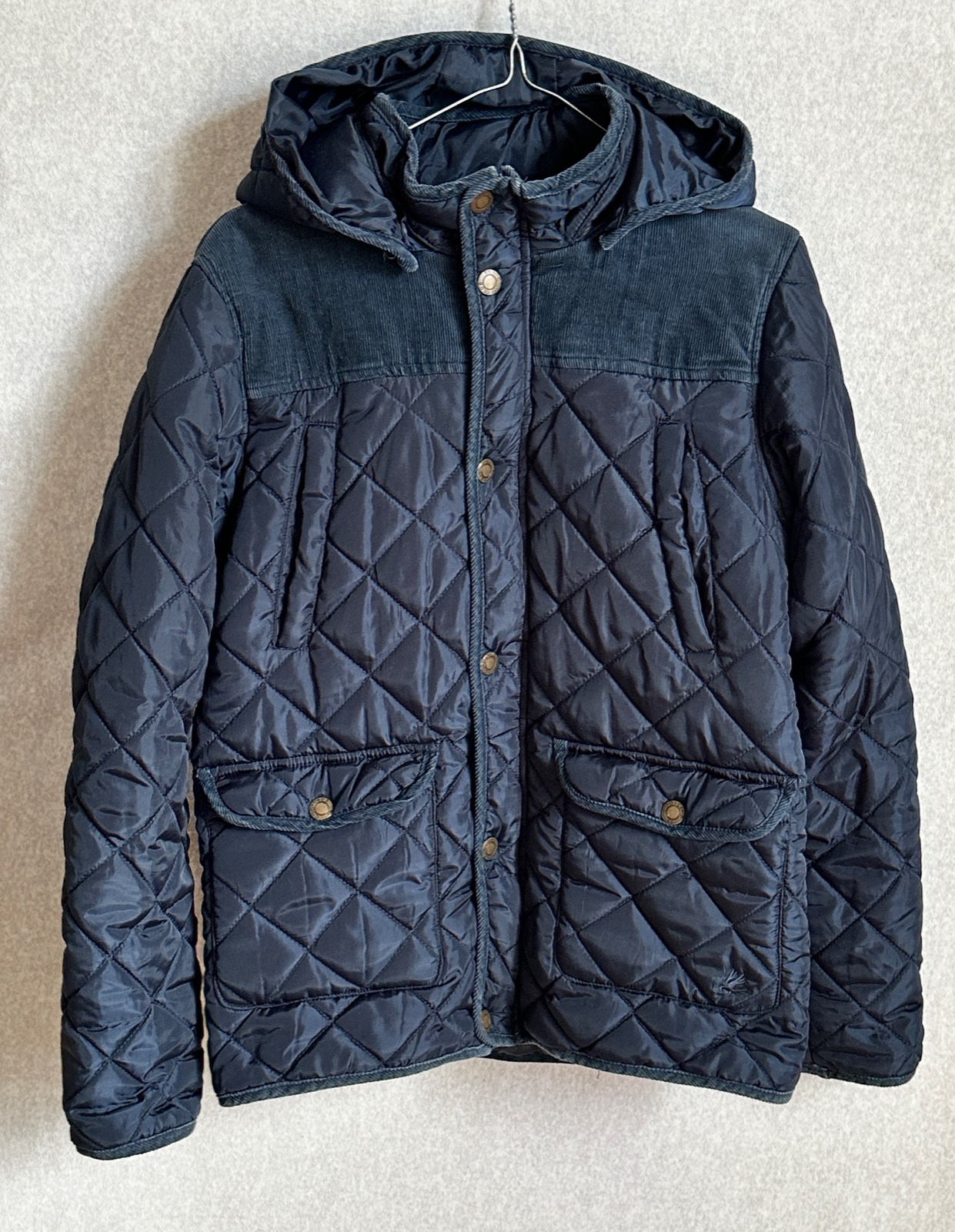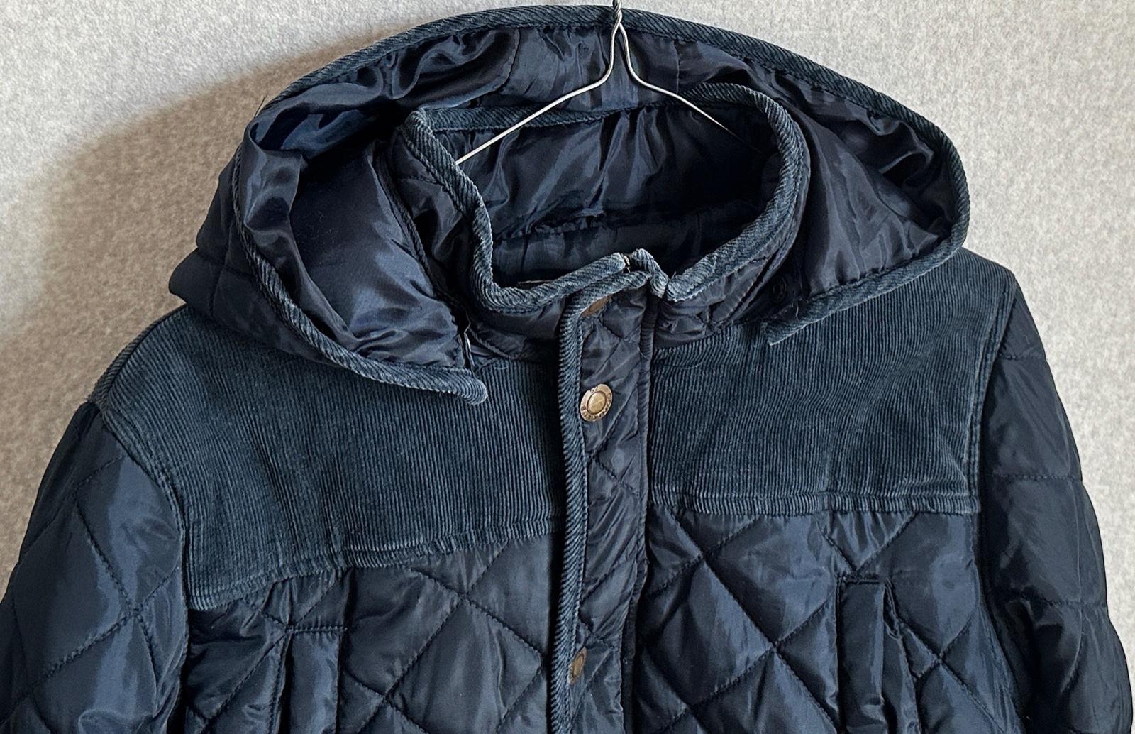 Hrejivá štýlová bunda na zimu vo veľmi peknom stave, bez poškodení, kombinovaná menšestrom. Odnímateľná kapucňa, vrecká na prsia na ruky, ploché zatváracie vrecká v predu v spodnej časti bundy. Zapínanie na zips + prekrytie zipsu na kovové pripínacie gombíky.
