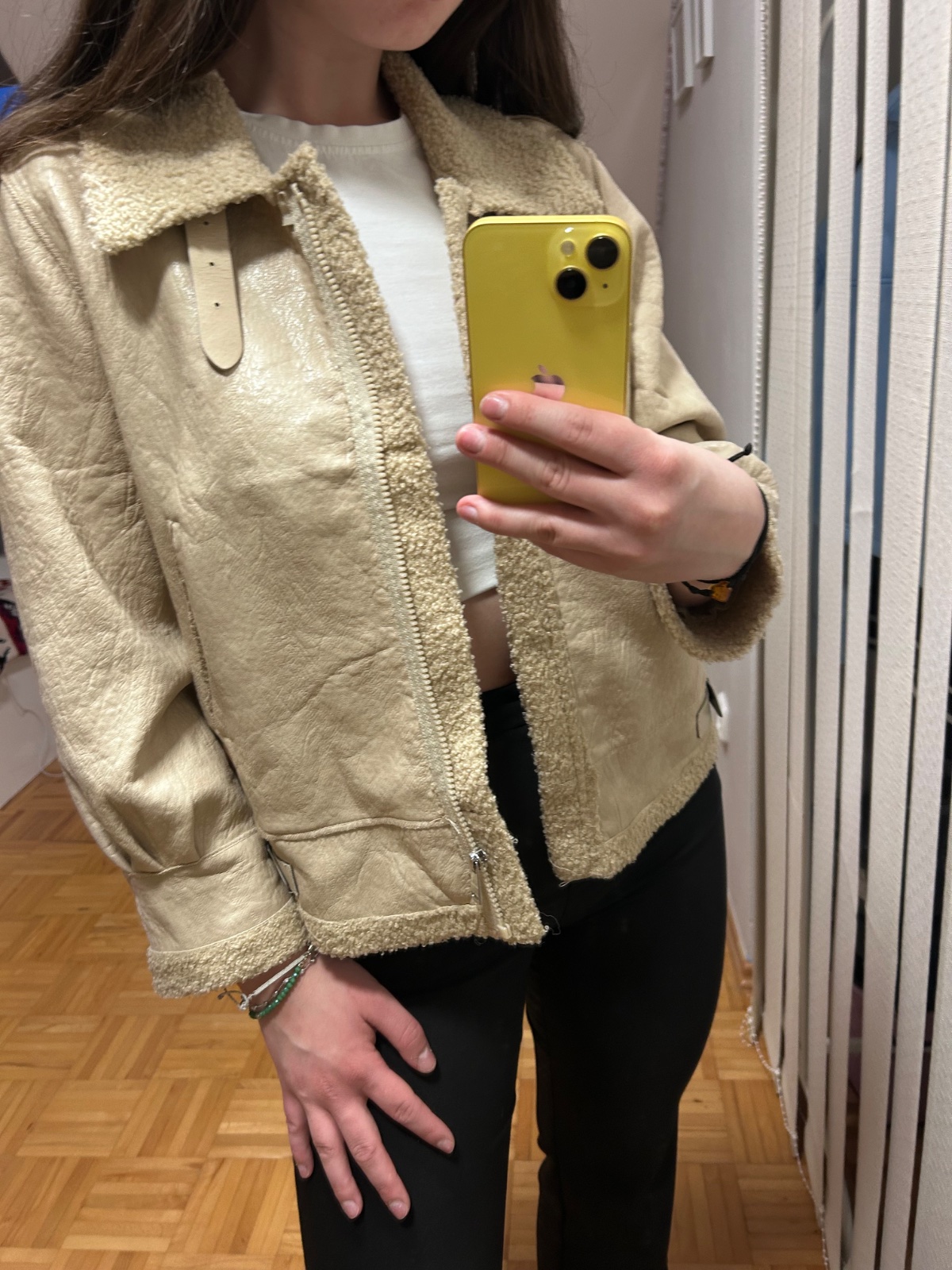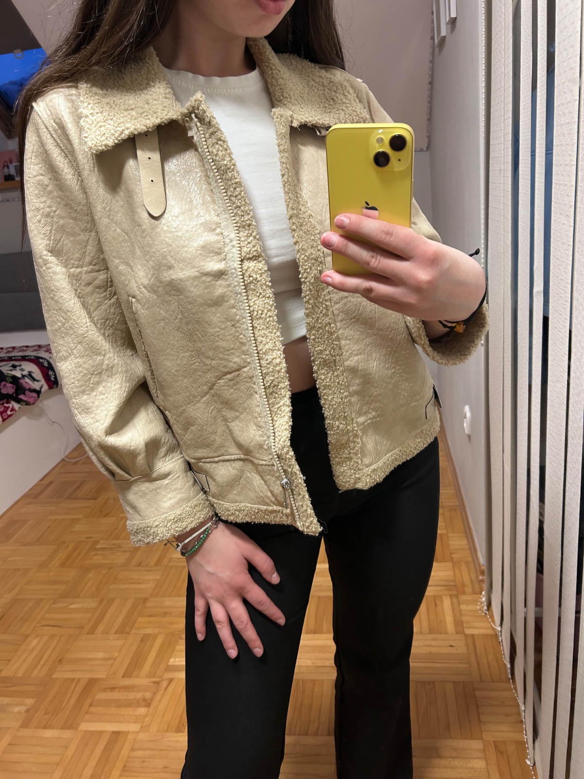 jemne kremova bunda na zips...zvyraznena cervenymi pasmi
