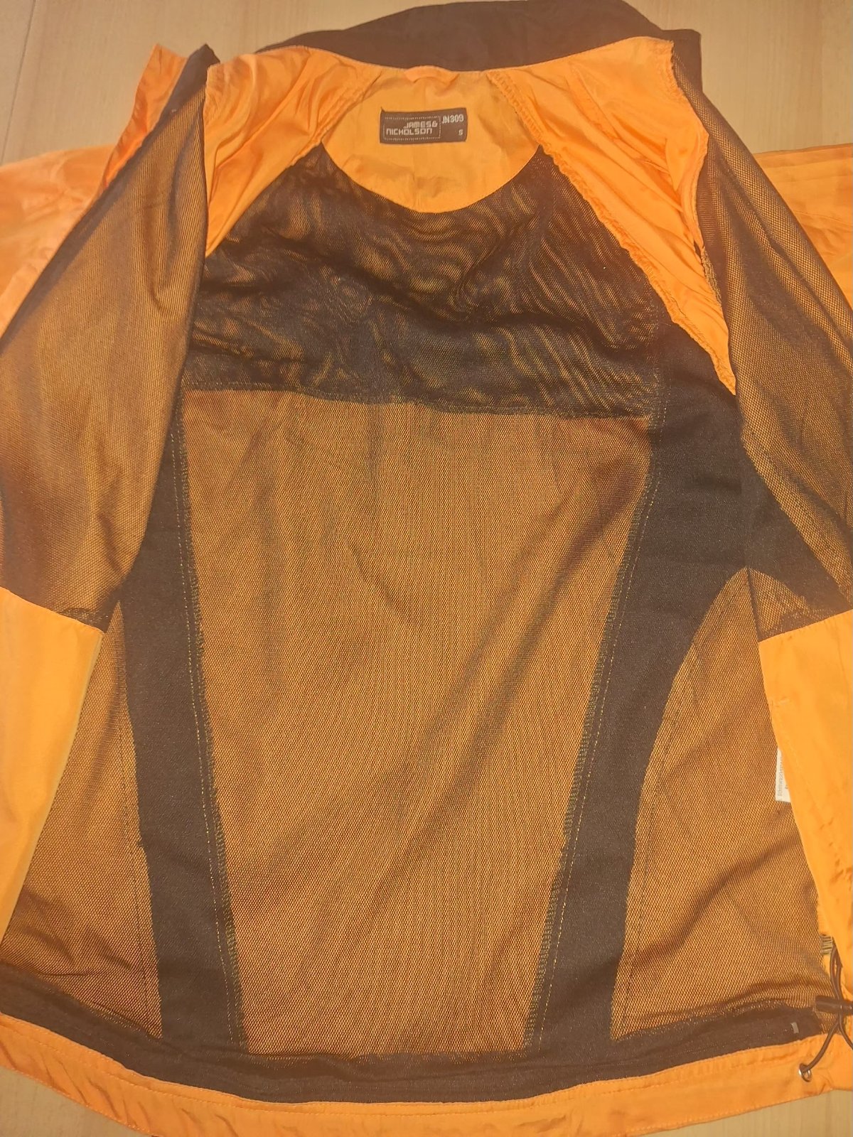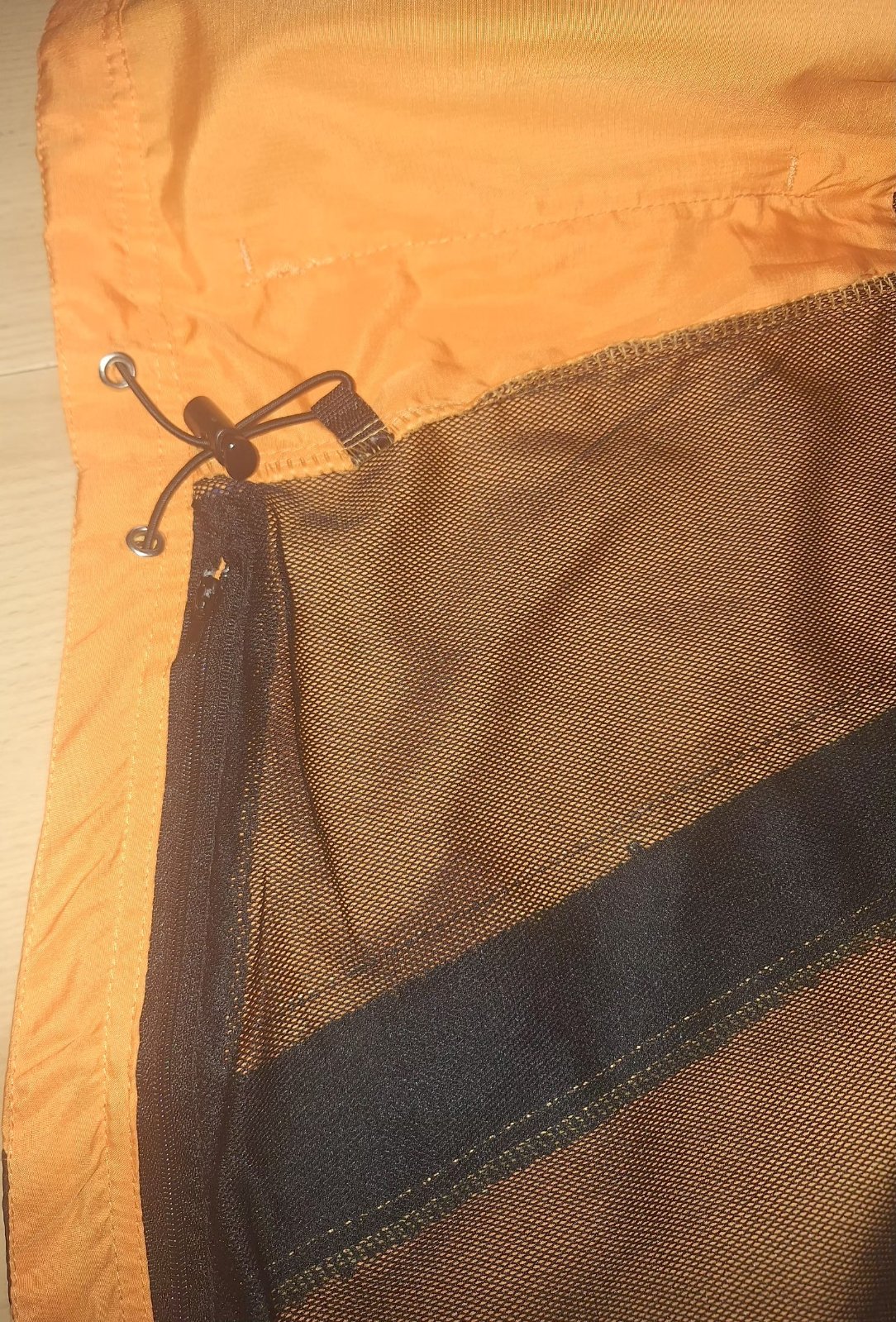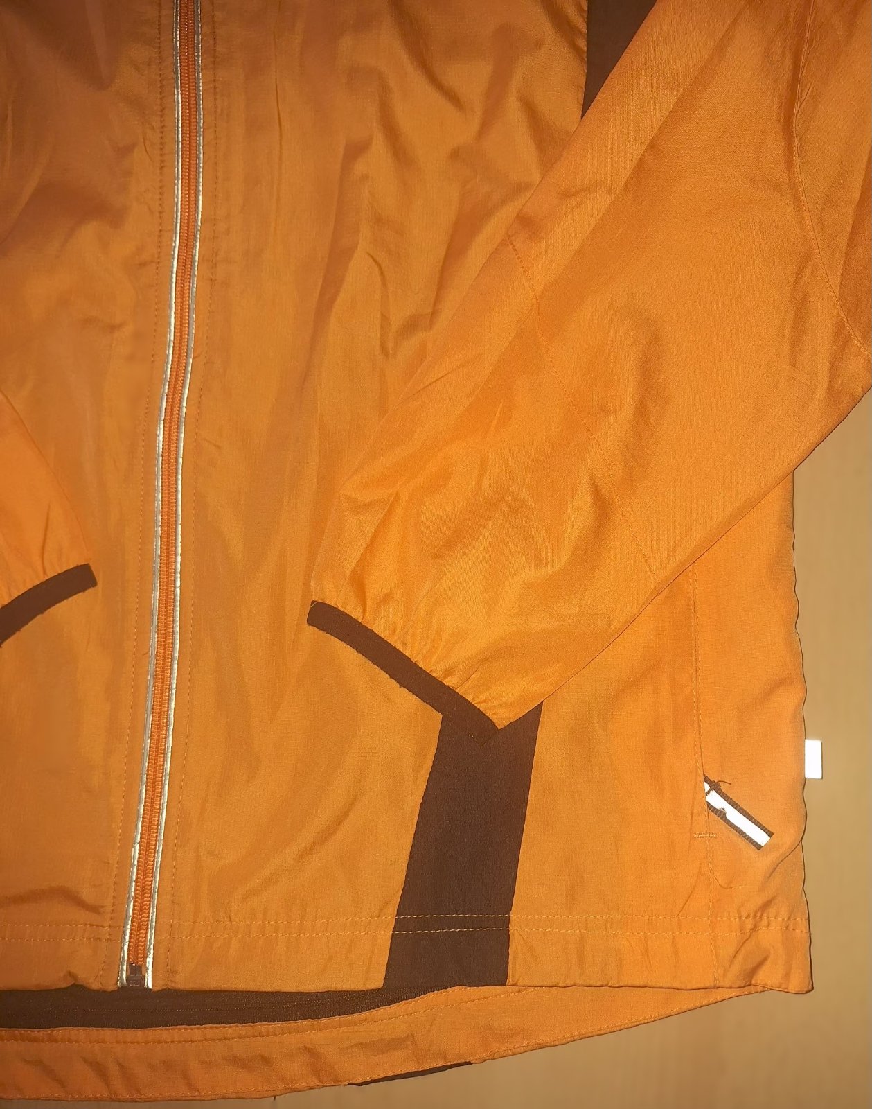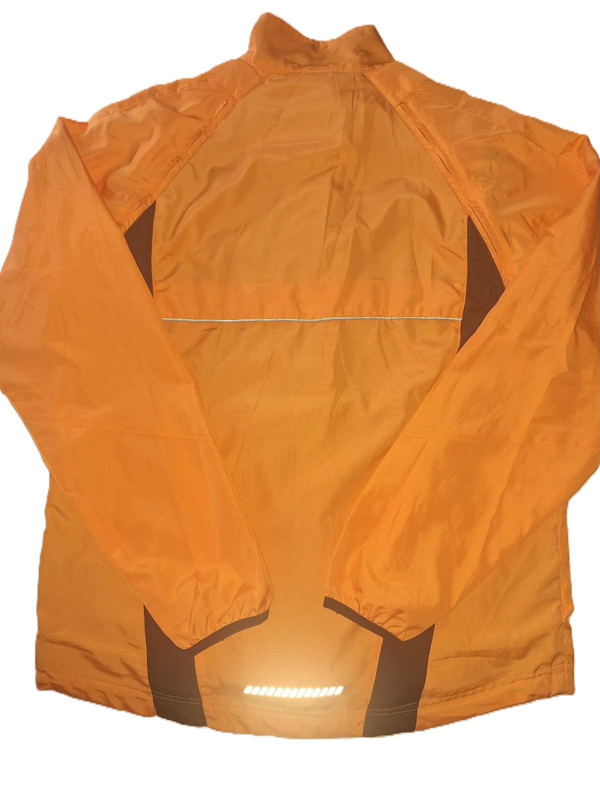 Má integrované odvetrávacie otvory alebo kapsy. Tieto prvky zyšujú komfort pri fyzickej aktivite tým, že pomáhajú regulovať teleesnú teplotu a odvádzať vlhkosť. V spodnej chrbtovej časti je reflexný pásik. Farba je výrazne oranžová, presný odtieň sa mi nepodarilo zachytiť. Materiál je jený – 100% polyester.