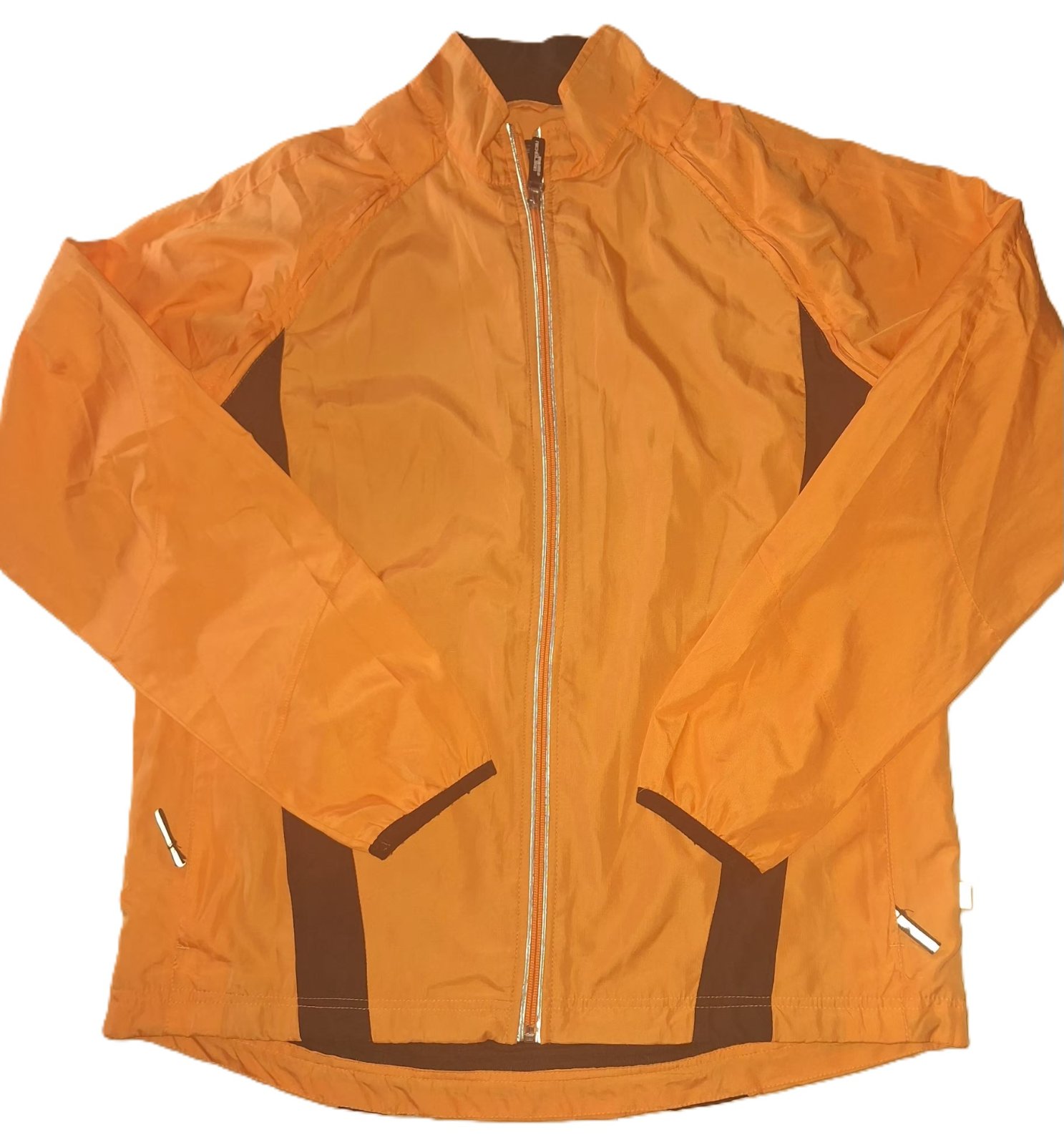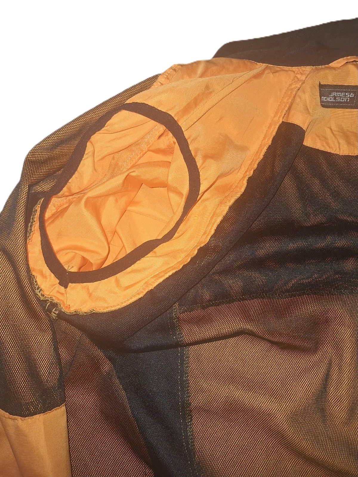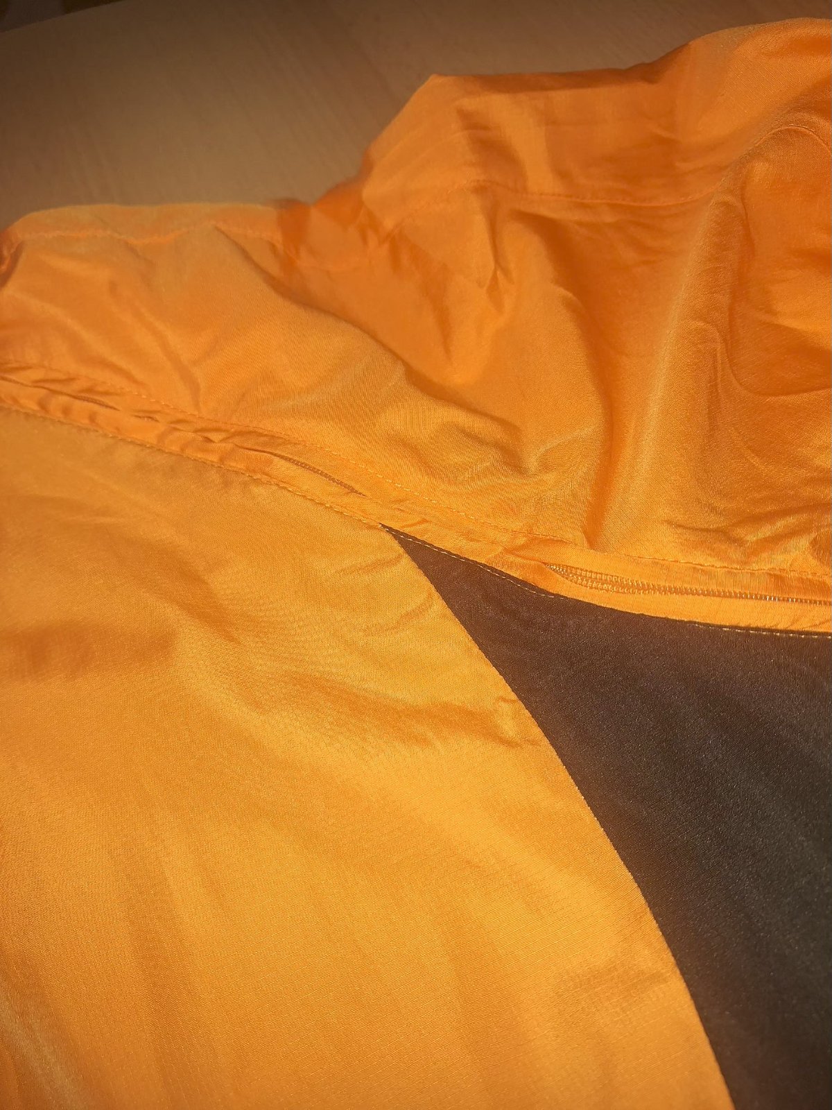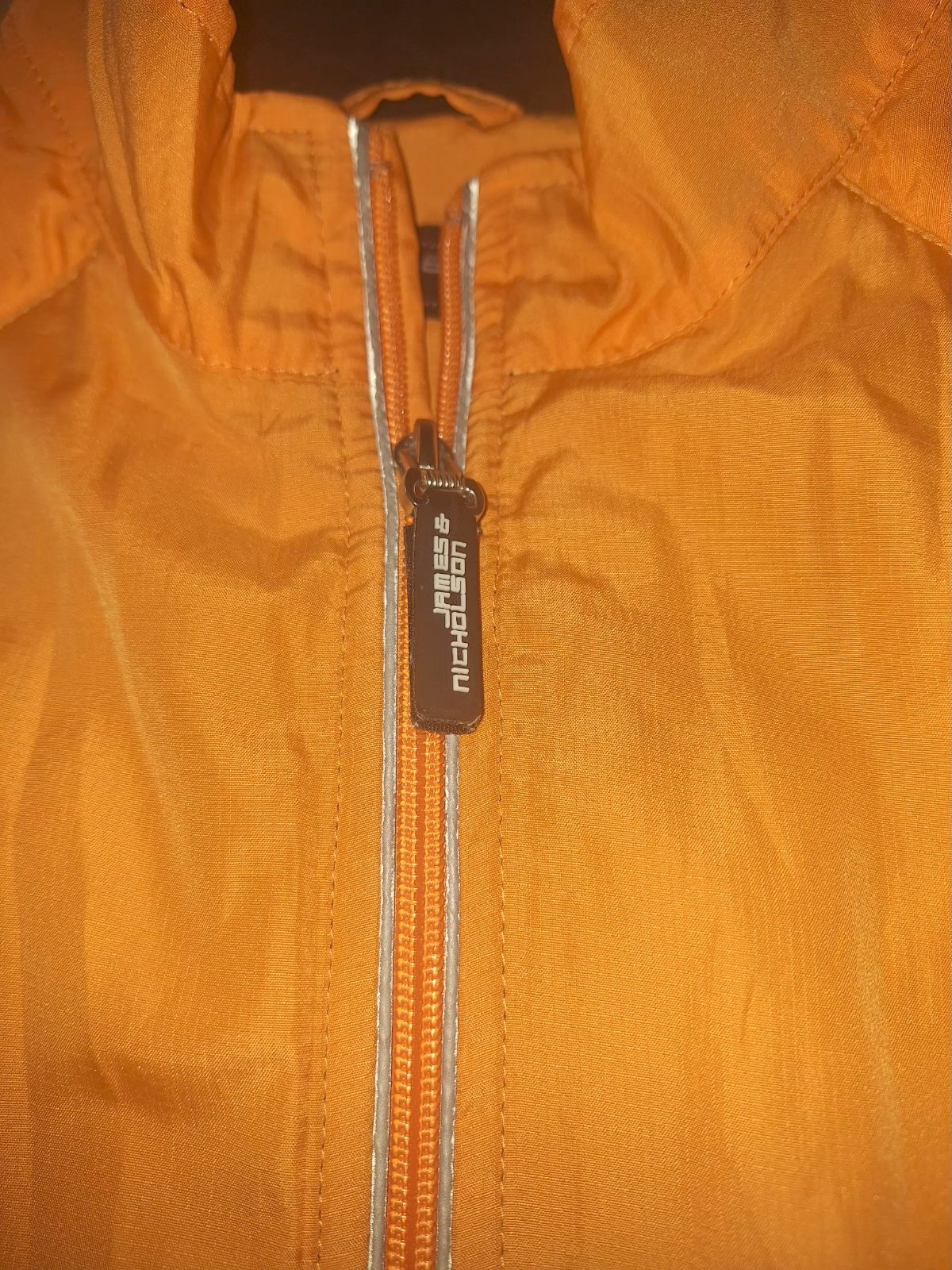 Má integrované odvetrávacie otvory alebo kapsy. Tieto prvky zyšujú komfort pri fyzickej aktivite tým, že pomáhajú regulovať teleesnú teplotu a odvádzať vlhkosť. V spodnej chrbtovej časti je reflexný pásik. Farba je výrazne oranžová, presný odtieň sa mi nepodarilo zachytiť. Materiál je jený – 100% polyester.