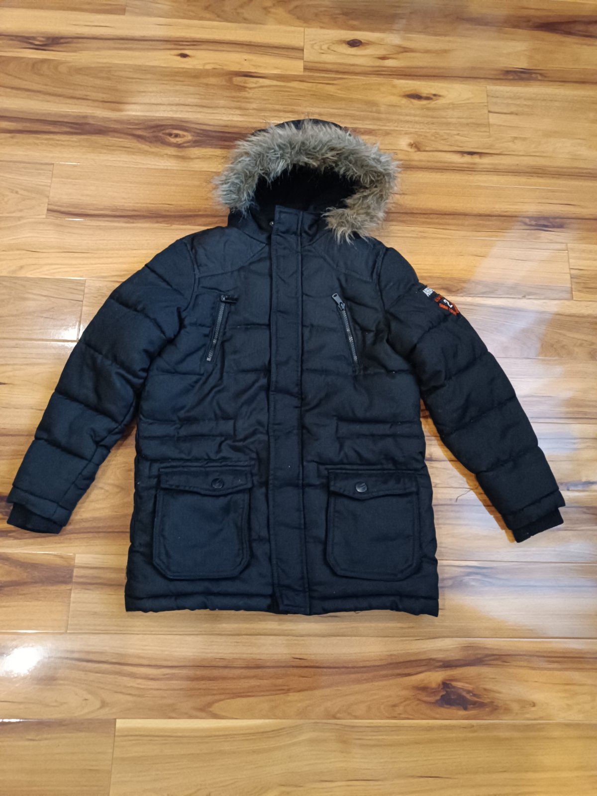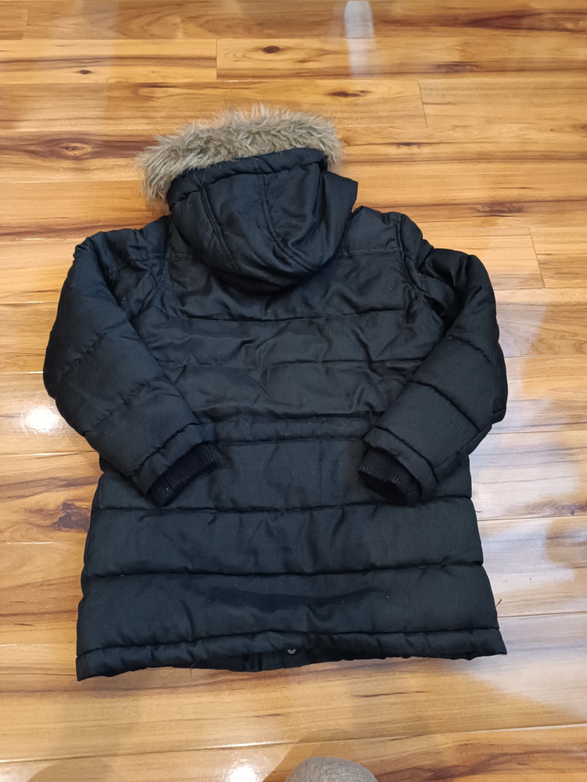 Praktická predĺžená bunda v dvojcisli, Takko. Kožušiny je umelá, dá sa odpútať cvokmi. Kapucňa napevno. V rukávoch sú patenty proti podfukovaniu. Bez poškodení.