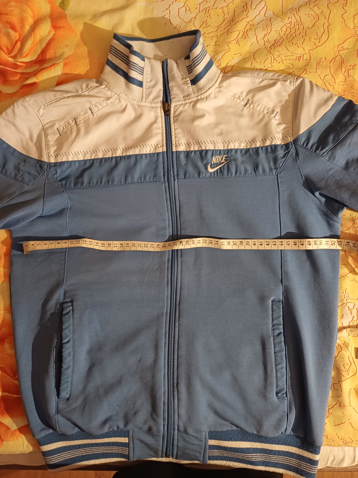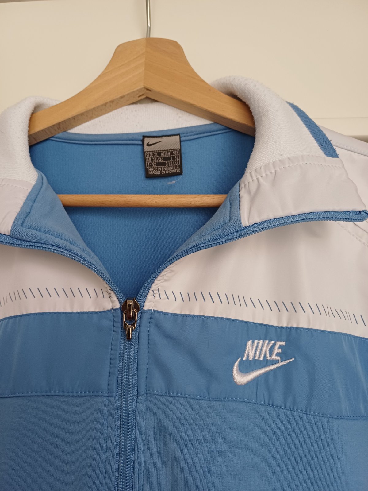 Bundička Nike z bavlny bledomodrej farby s bielou.Bunda má vačky.Veĺkosť je uvedená xl nezodpovedá tejto veľkosti.