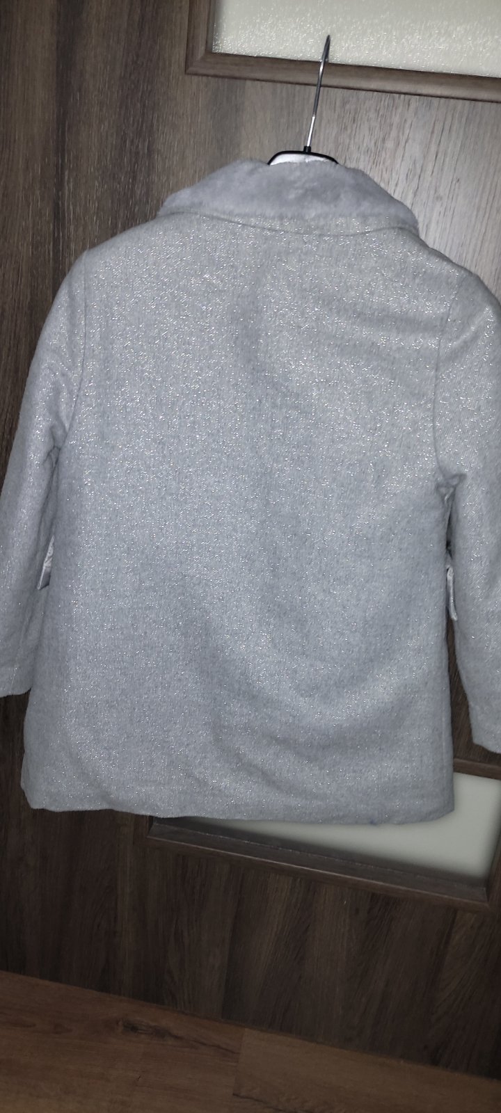 Pekny kabatik na jarne/jesenne pocasie. Dvojradove zapinanie na gombiky, farba svetlo seda, dlzka 62 cm.