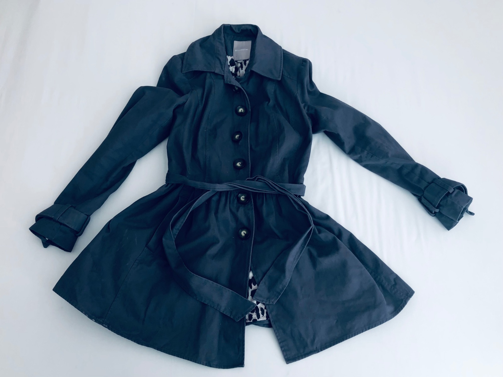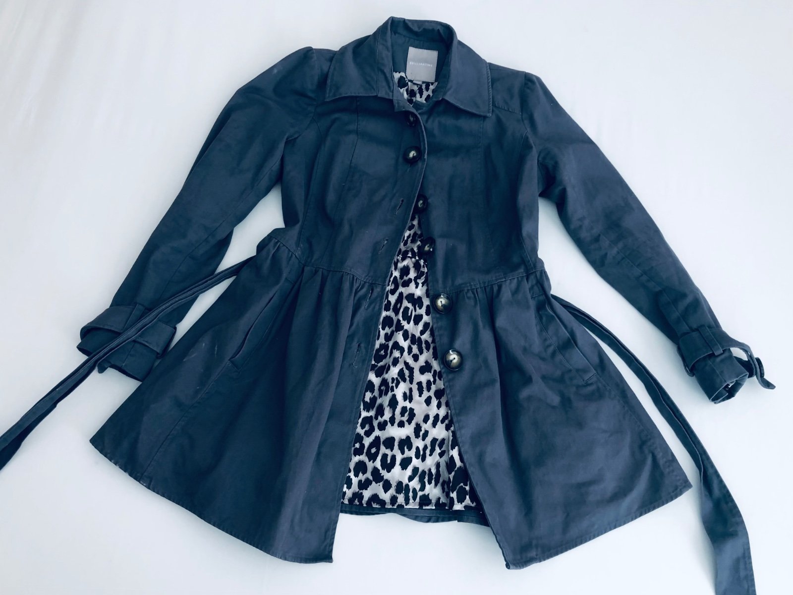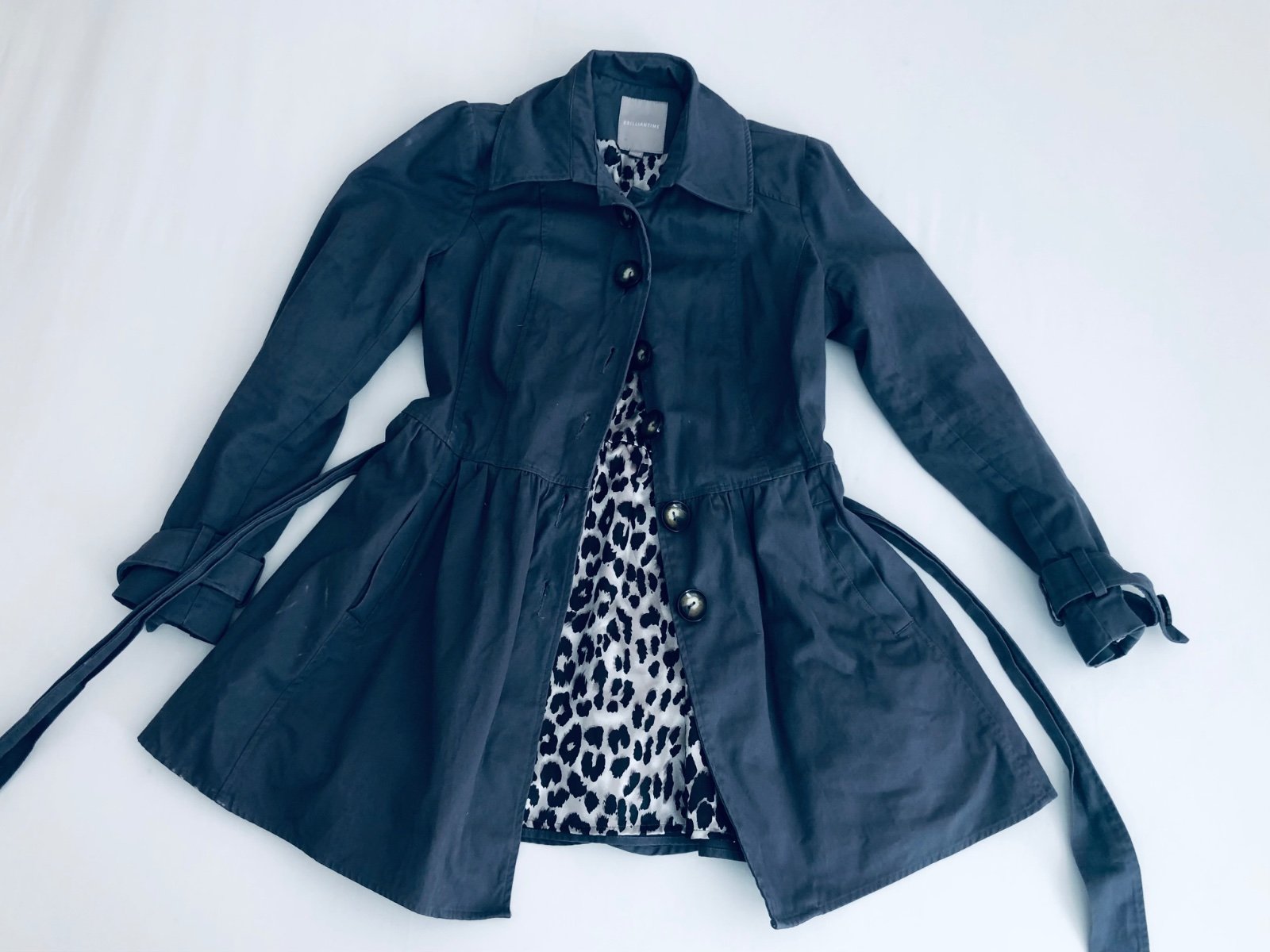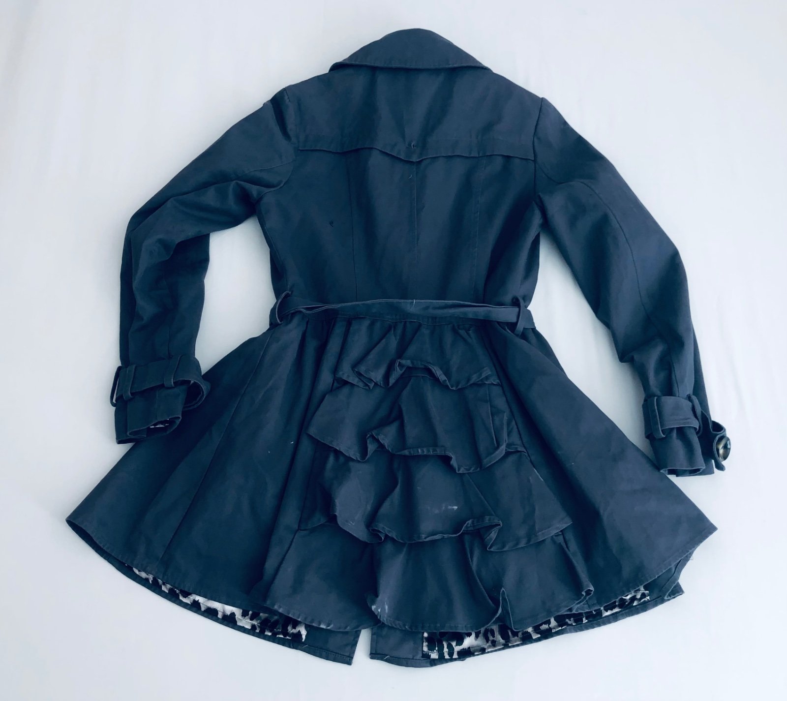 Tento kabátik má jedinečný strih, ktorý zvýrazňuje pás a rozširuje sa do sukne, s volánmi na zadnej strane pre hravý a elegantný vzhľad. Ideálny na prechodné obdobia – jar alebo jeseň.