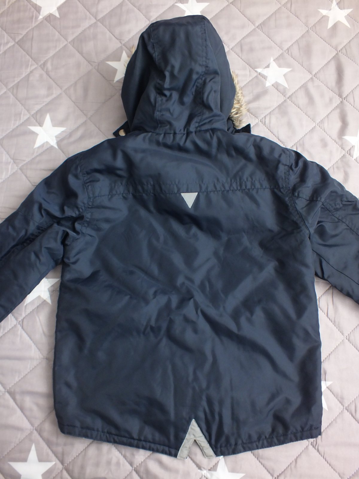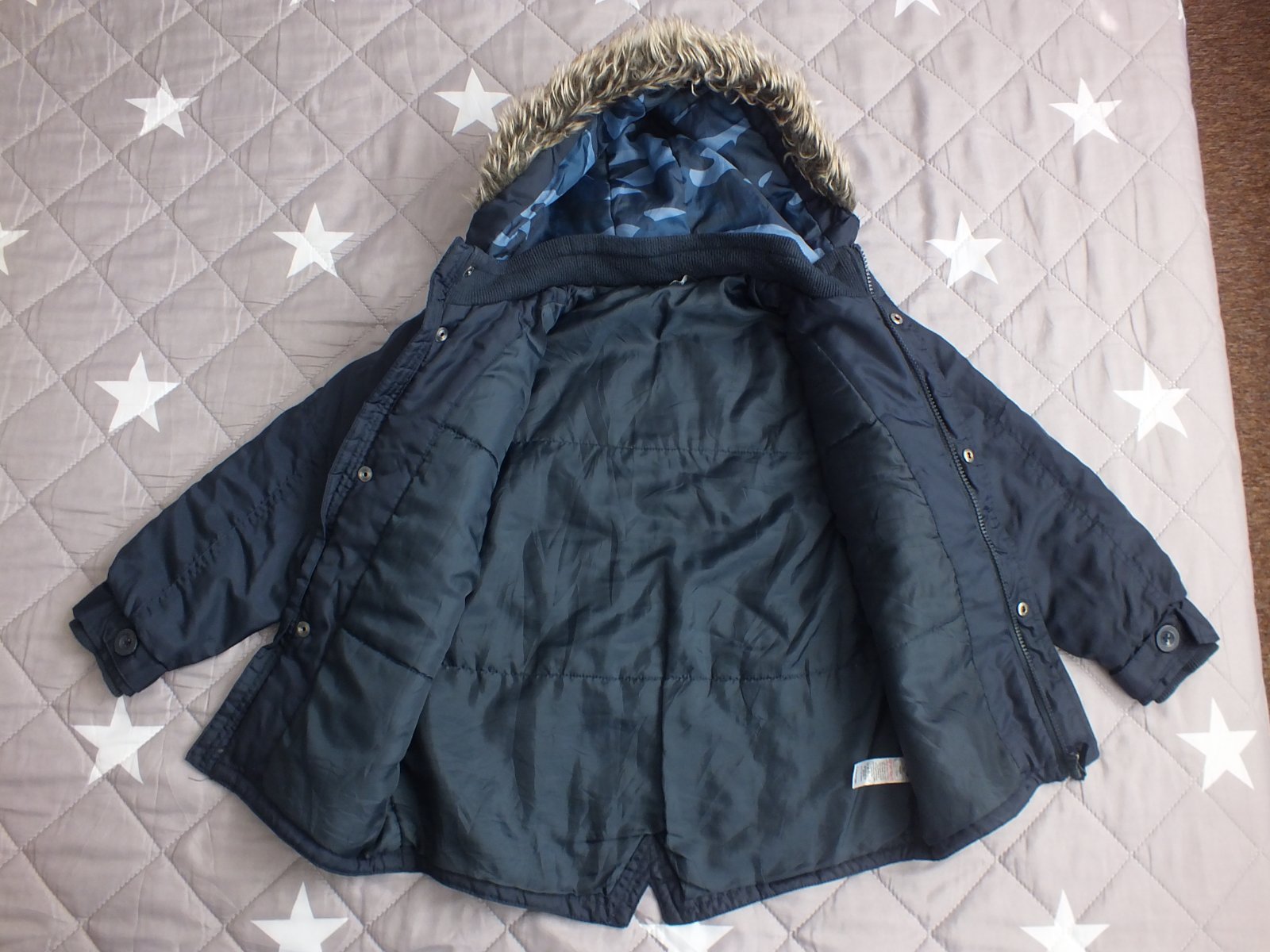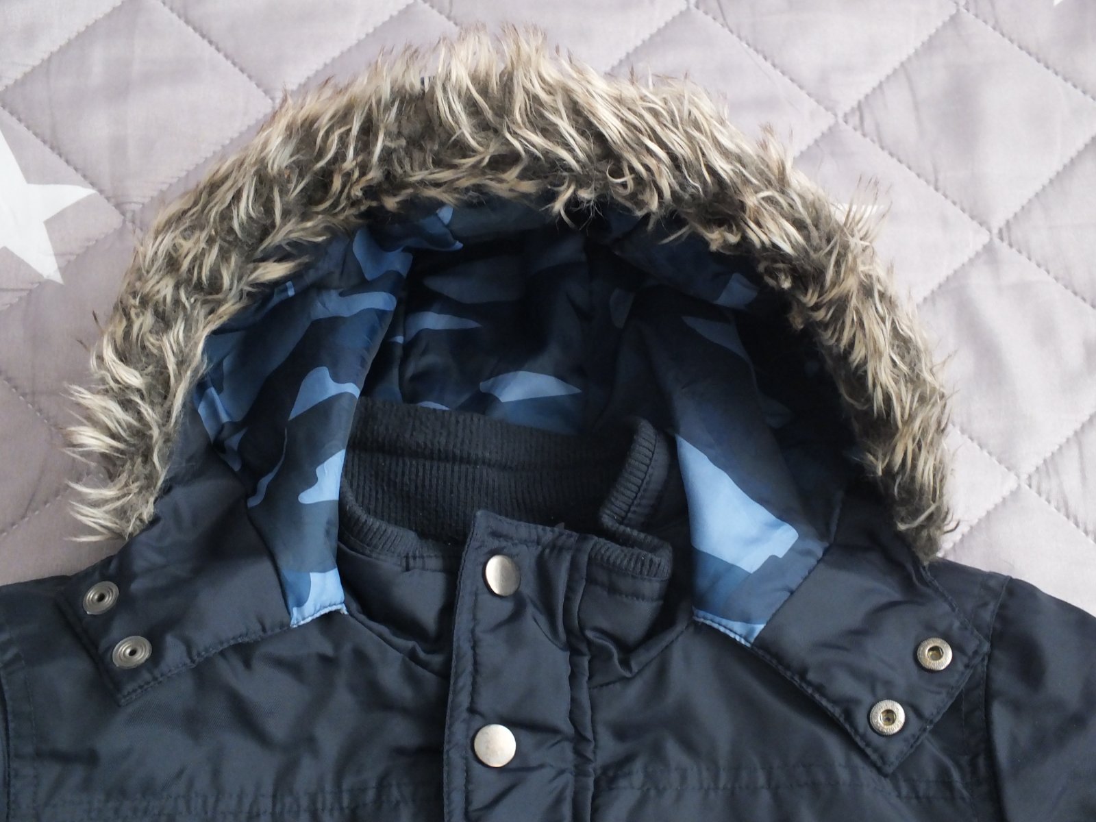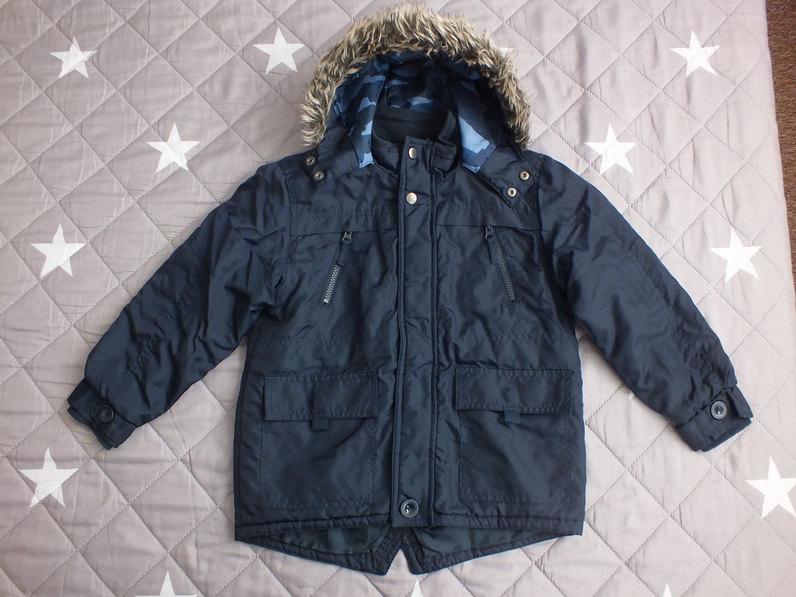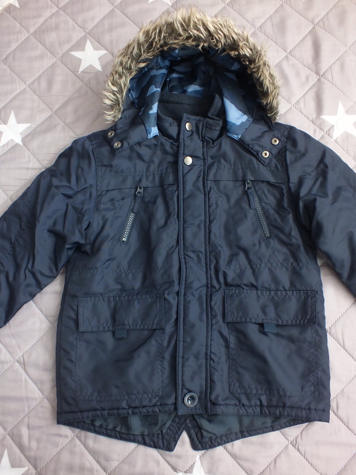 pekná chlapčenská bundička,farba pekná tmavomodrá,nevyblednutá,kapucňa zvnútra maskáčová,na rukávoch patent,aj okolo krku patent,na chladnejšiu jeseň a miernejšiu zimu,veľkosť 122/128,nosená málo,bez poškodenia,
