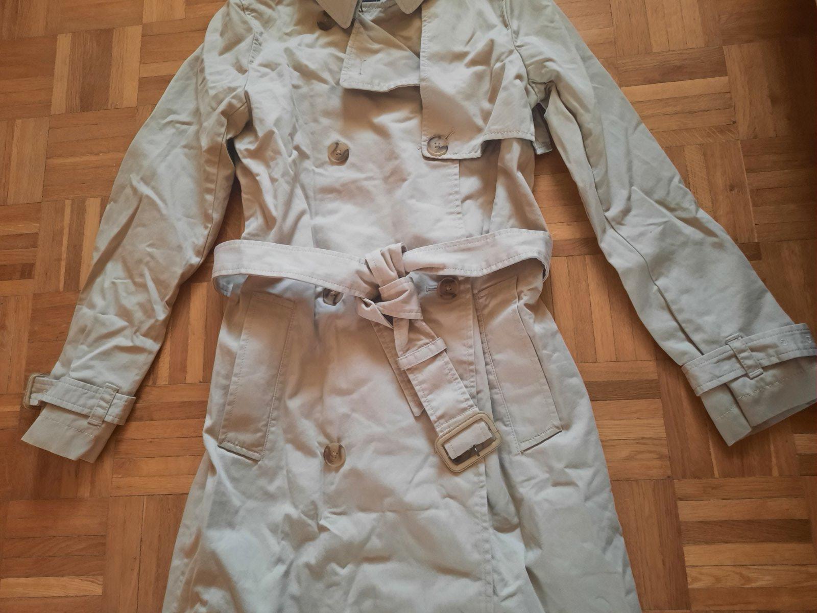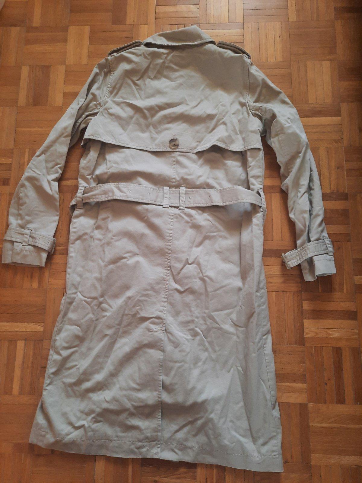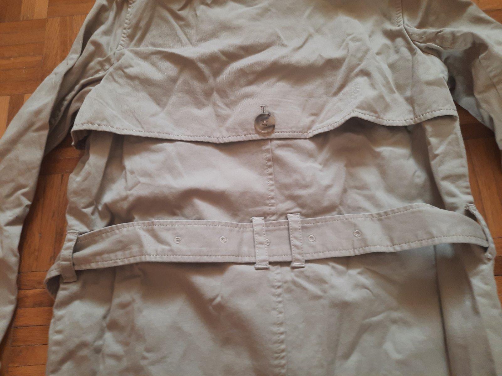 Krásny dlhý skoro nový dámsky trenčkot s opaskom. Je podšitý, detailne vypravovaný. Vačky sú vpredu, vzadu je rázporok. Bol oblečený iba na chvíľku.
