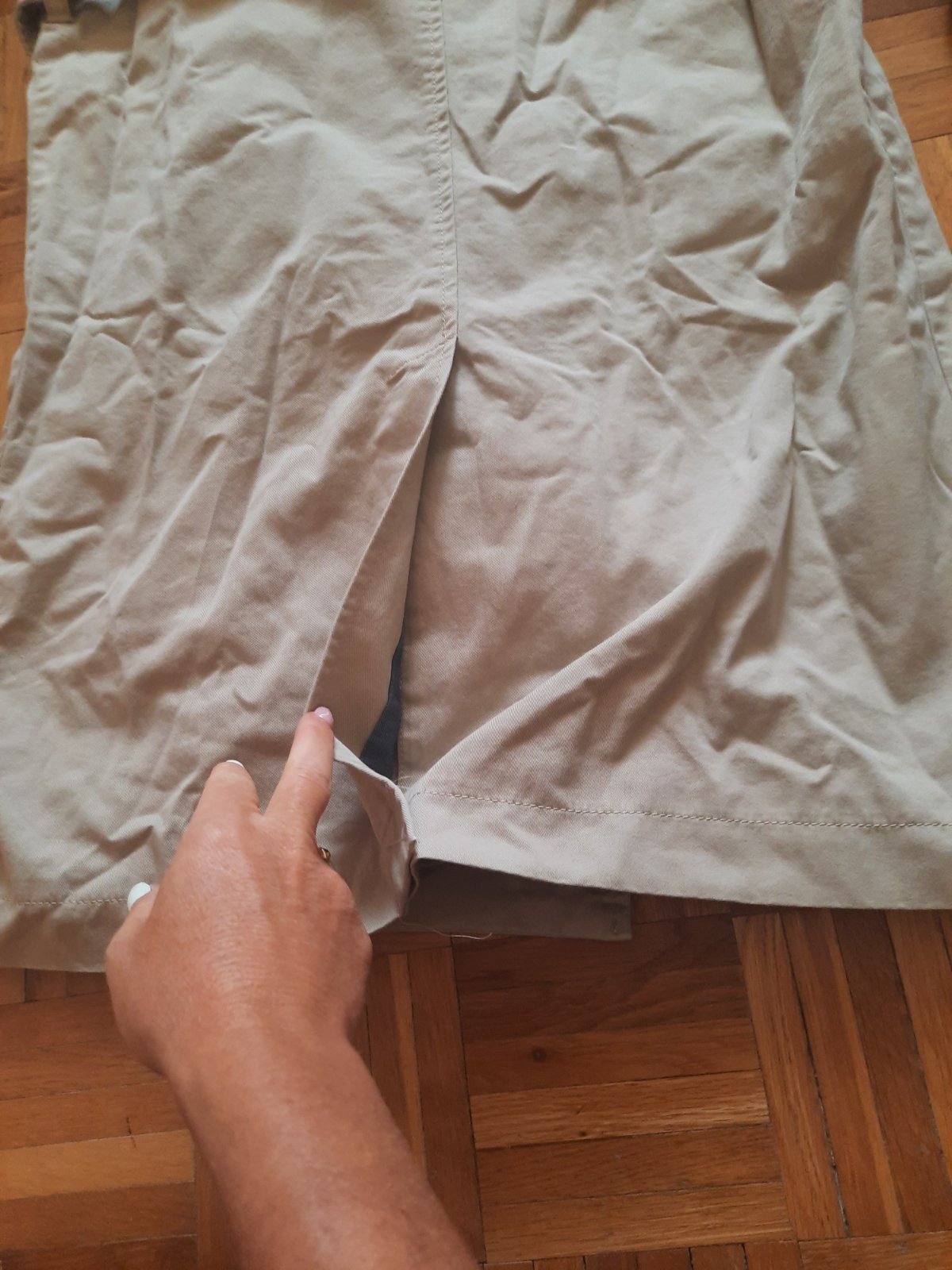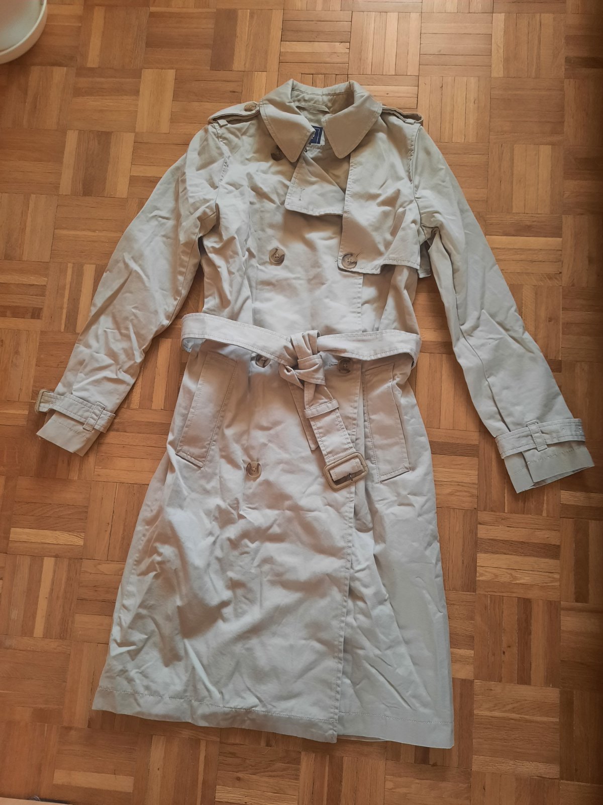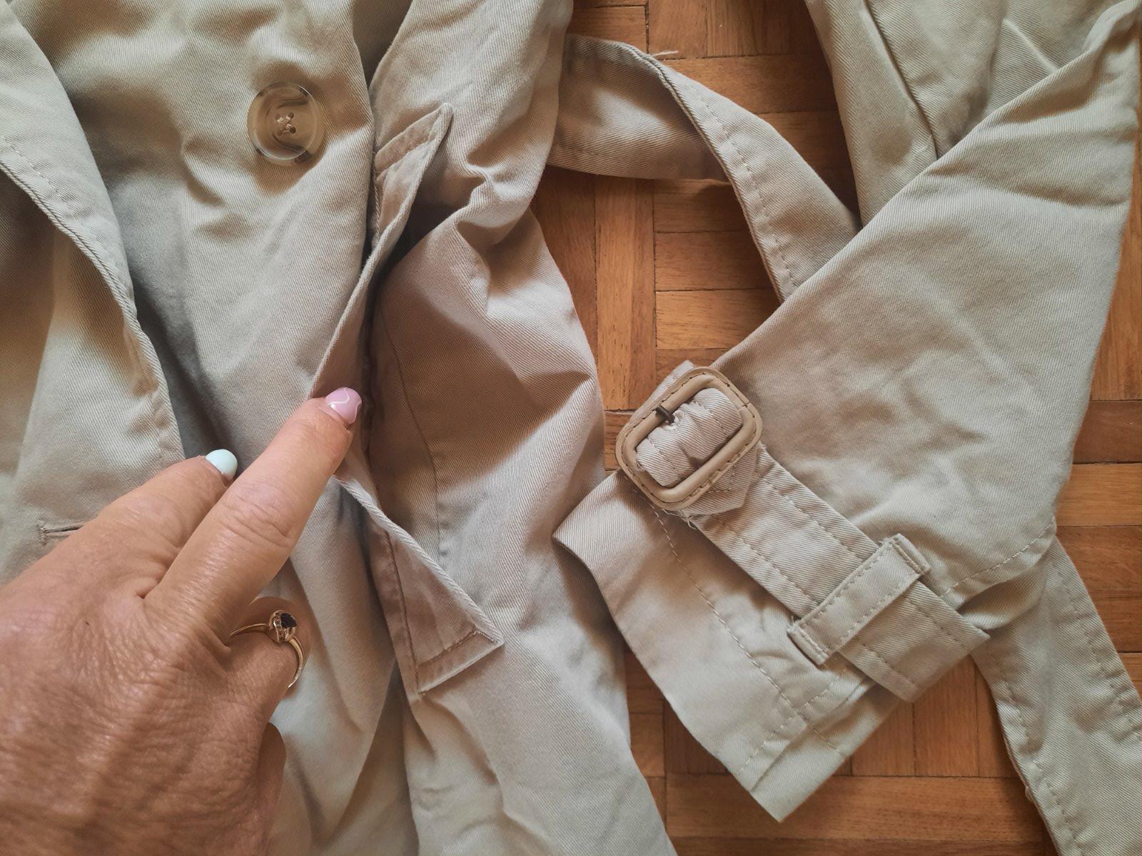 Krásny dlhý skoro nový dámsky trenčkot s opaskom. Je podšitý, detailne vypravovaný. Vačky sú vpredu, vzadu je rázporok. Bol oblečený iba na chvíľku.