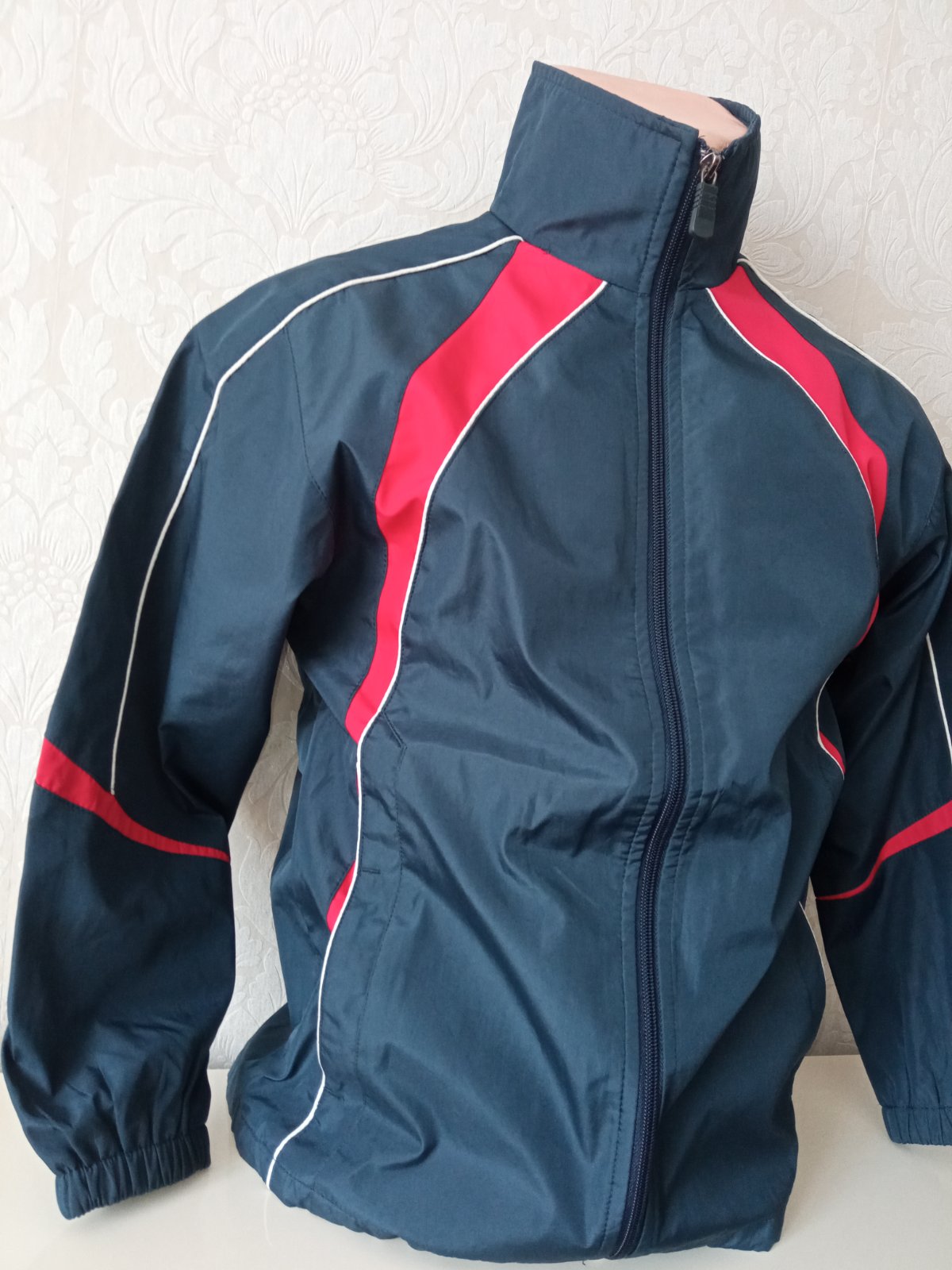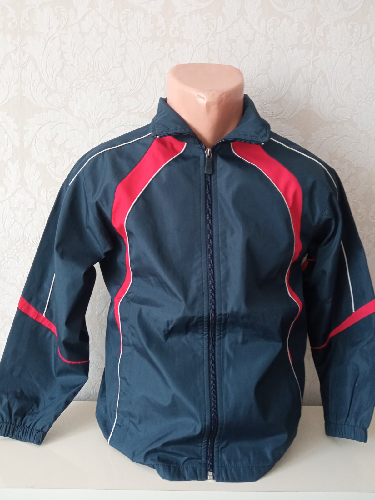 Chlapčenská tmavomodrá tenká vetrovka. Zapínanie na zips. Dve bočné vrecká.