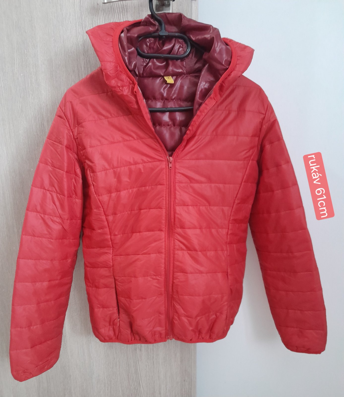Ľahká vatovaná bunda krásnej červenej farby, vhodná aj na miernejšiu zimu. Dĺžka bundy 56 cm, dĺžka rukáva od pleca 63 cm, šírka v páse 42 cm, pod pazuchami 45 cm.