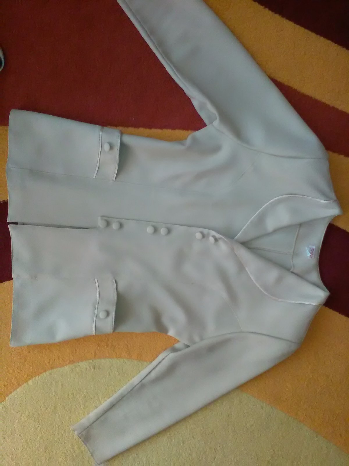 Kabatik na prechod s dvojradovym zapinanim akurat mu chyba jeden gombik na ramene inak bez poskodenia