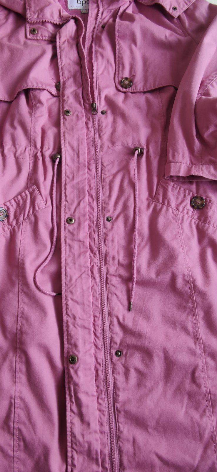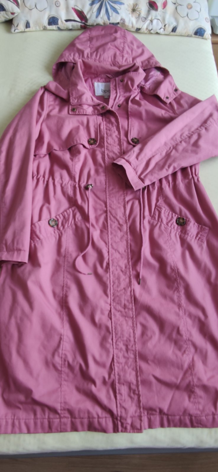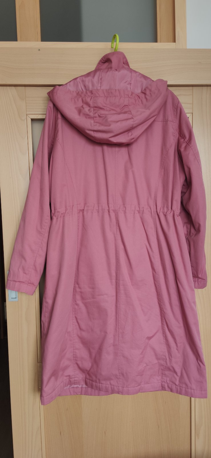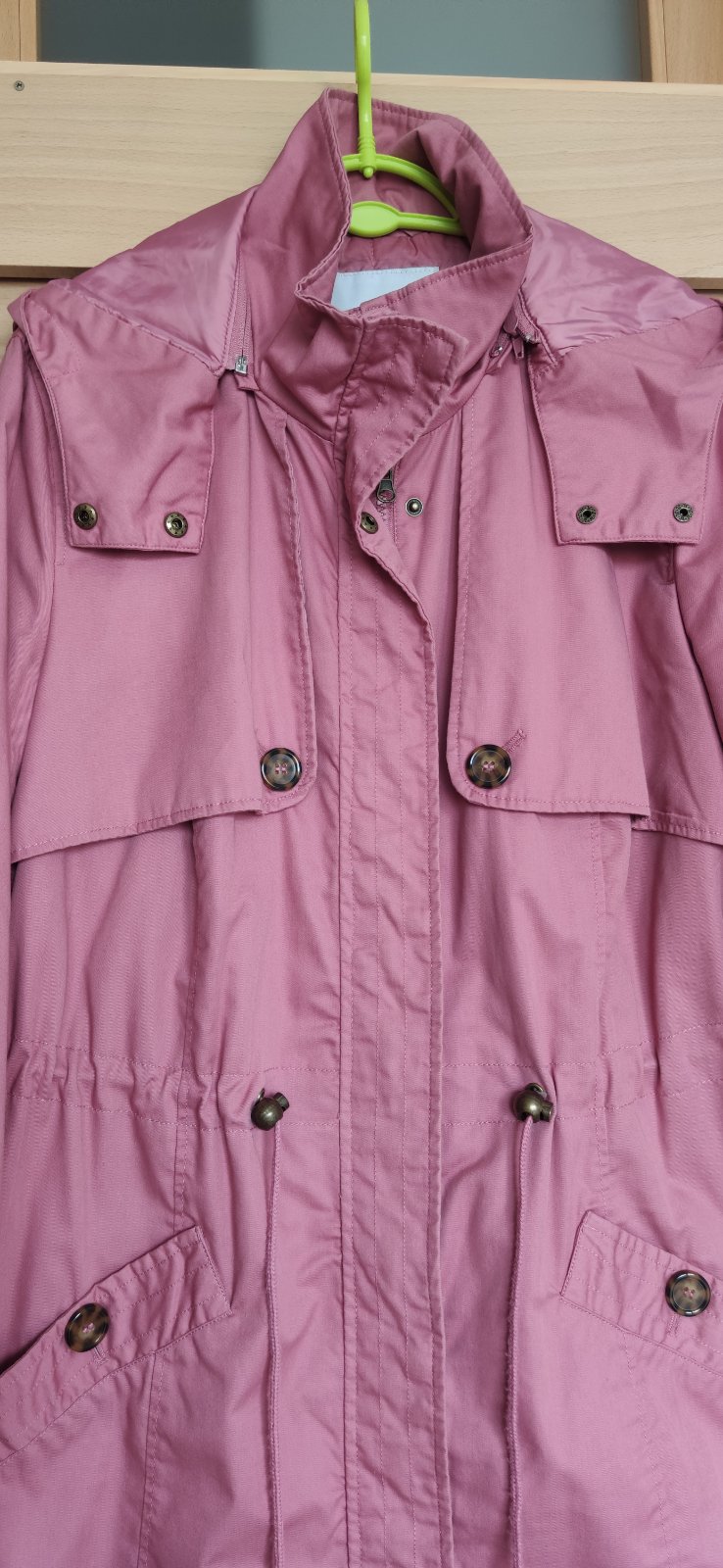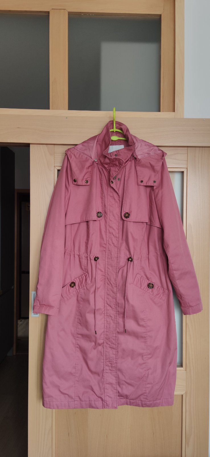 Predám málo používaný dámsky kabát. Je kvalitný, pekne šitý. Zapínanie na obojstranný zips a cvoky. Kabát má dve vrecká, kapucňu, ktorá sa dá odopnúť a tunelíkové sťahovanie v páse. Je podšitý, dĺžka pri výške 170 cm siaha pod kolená. Pranie v práčke. Vhodný na prechodné obdobie.