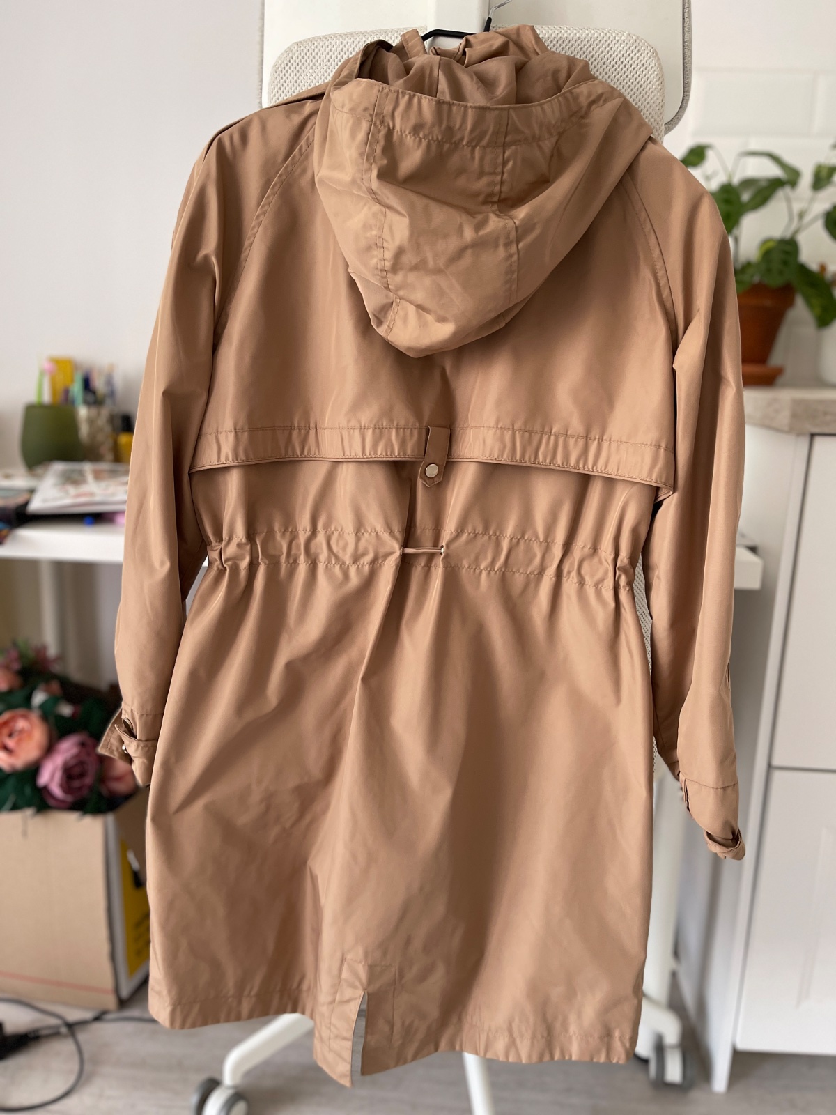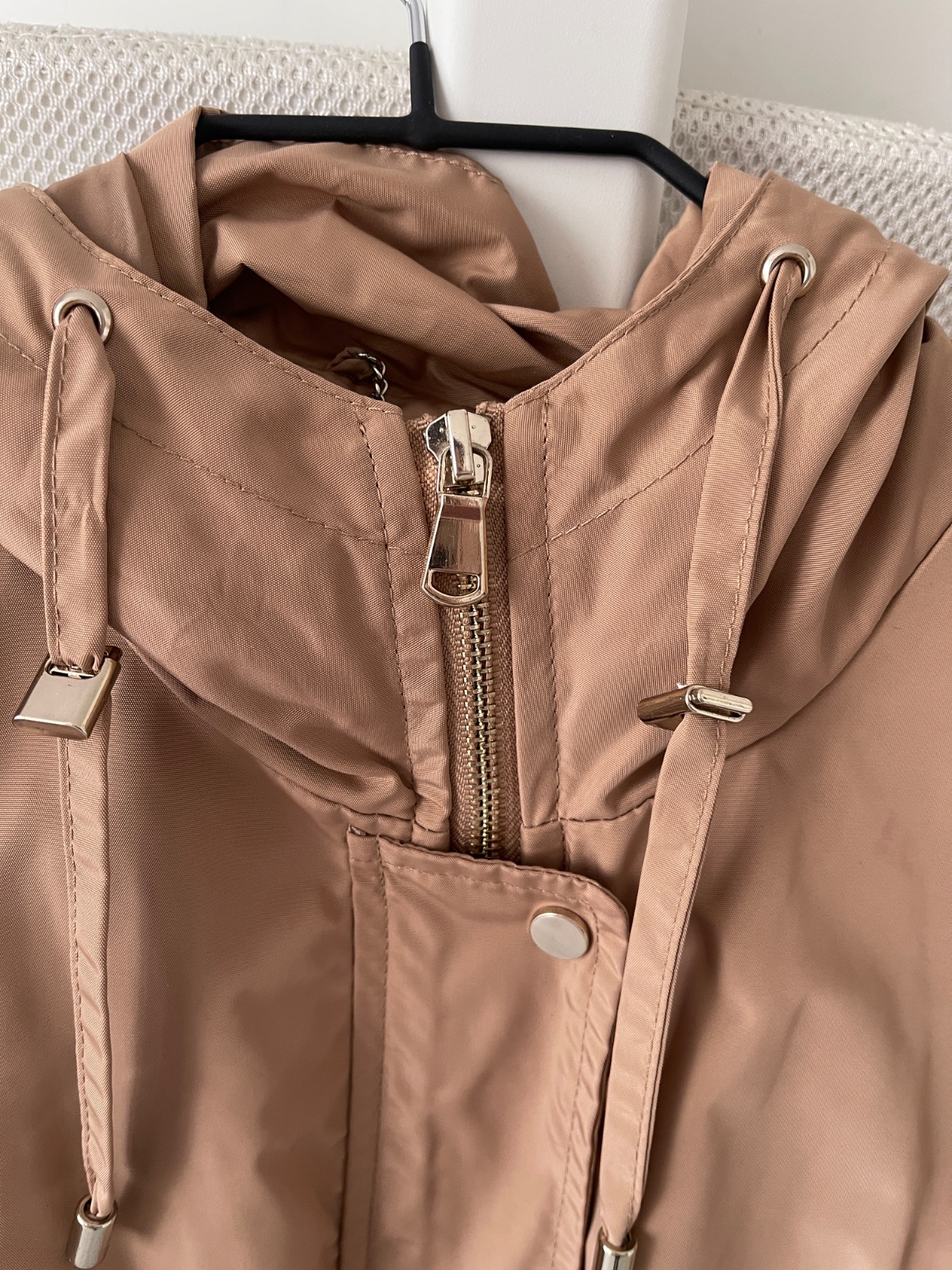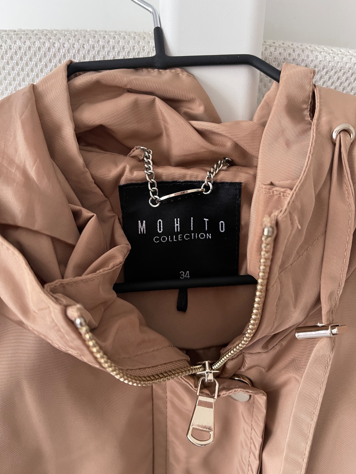 Nosená, bez poškodení. Bundička je podšitá, dá sa stiahnuť v páse. Má kapucňu, zlaté komponenty. Veľkosť 34, ale sedí aj na 36