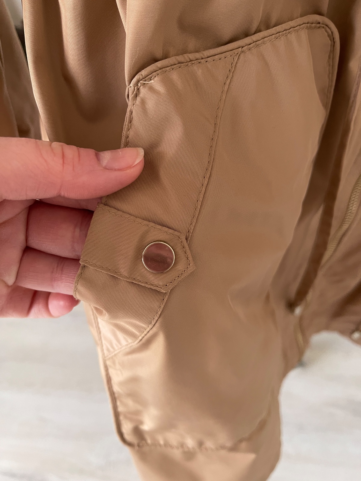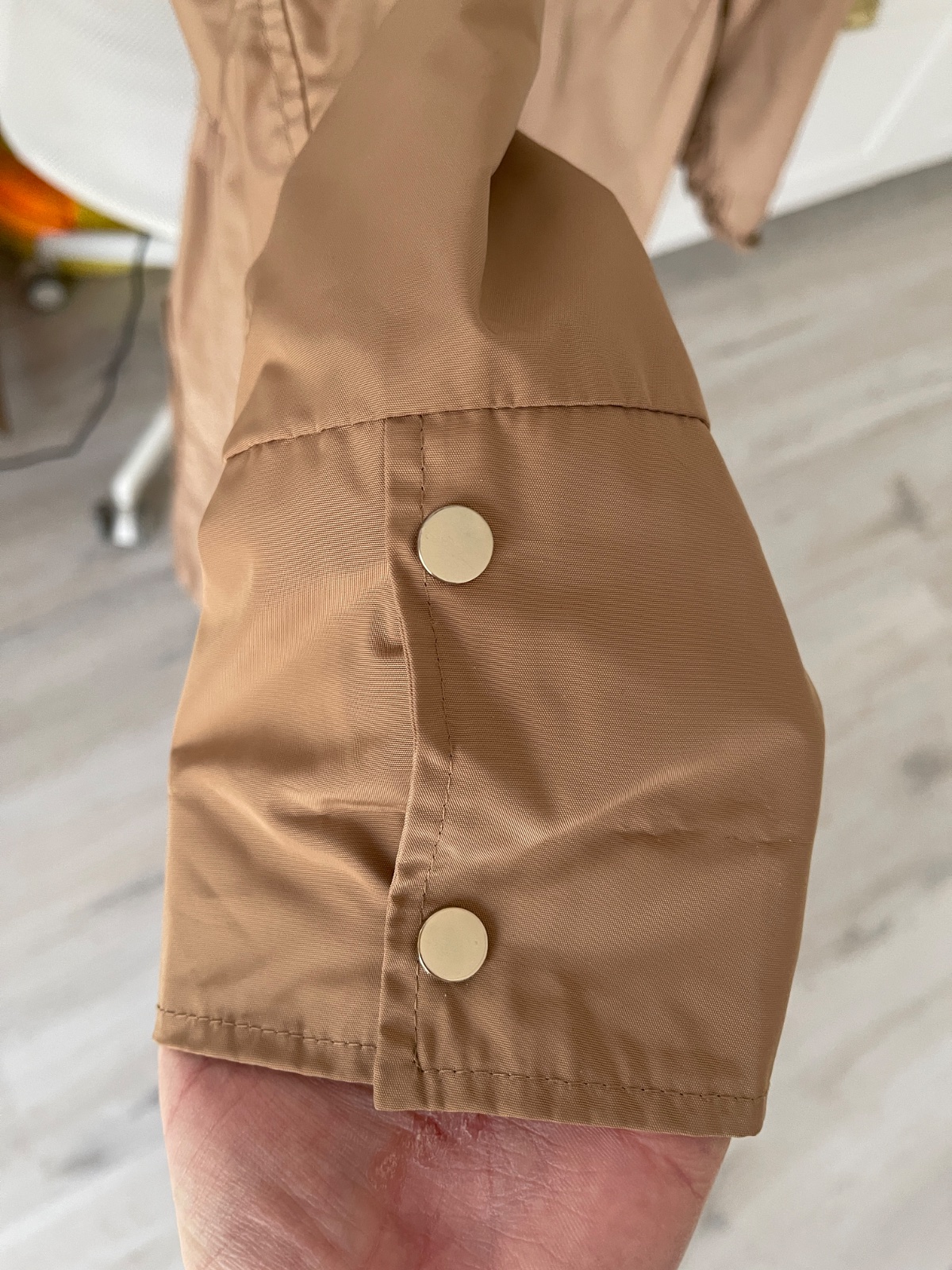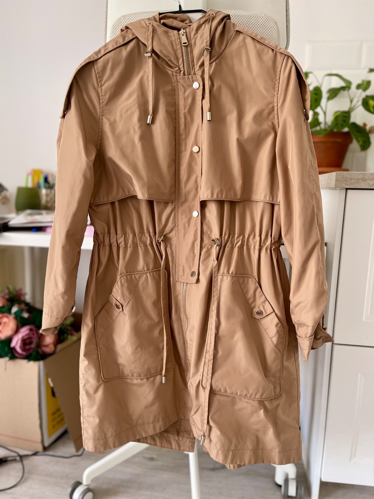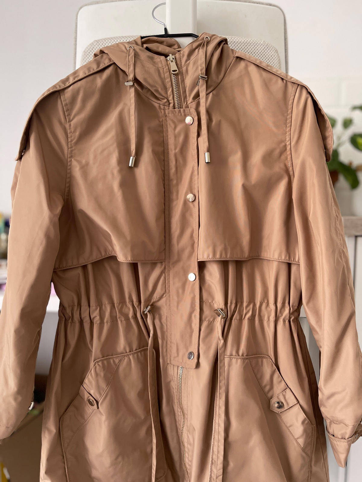 Nosená, bez poškodení. Bundička je podšitá, dá sa stiahnuť v páse. Má kapucňu, zlaté komponenty. Veľkosť 34, ale sedí aj na 36