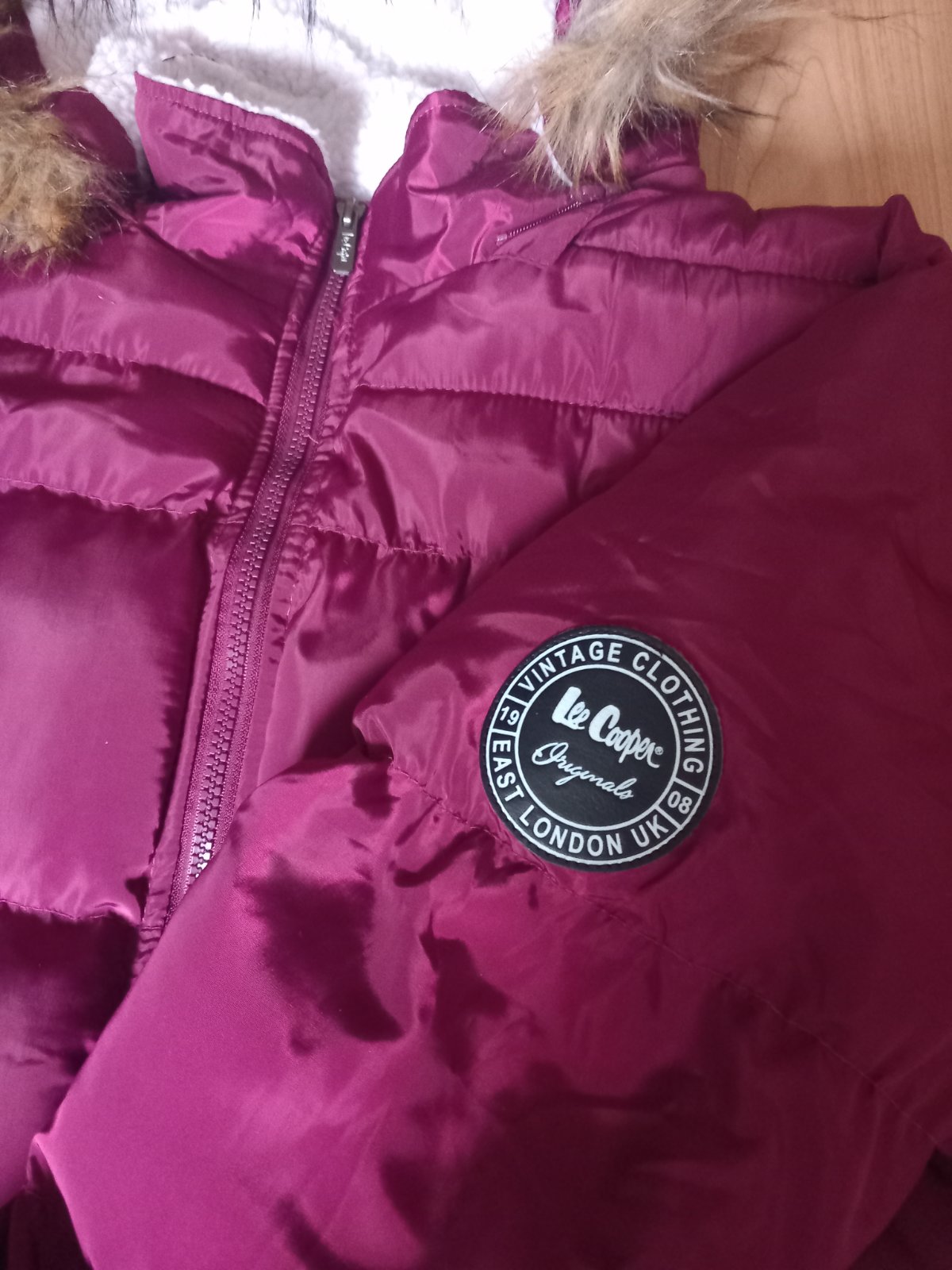 Teplá zimná bunda bordovej farby.