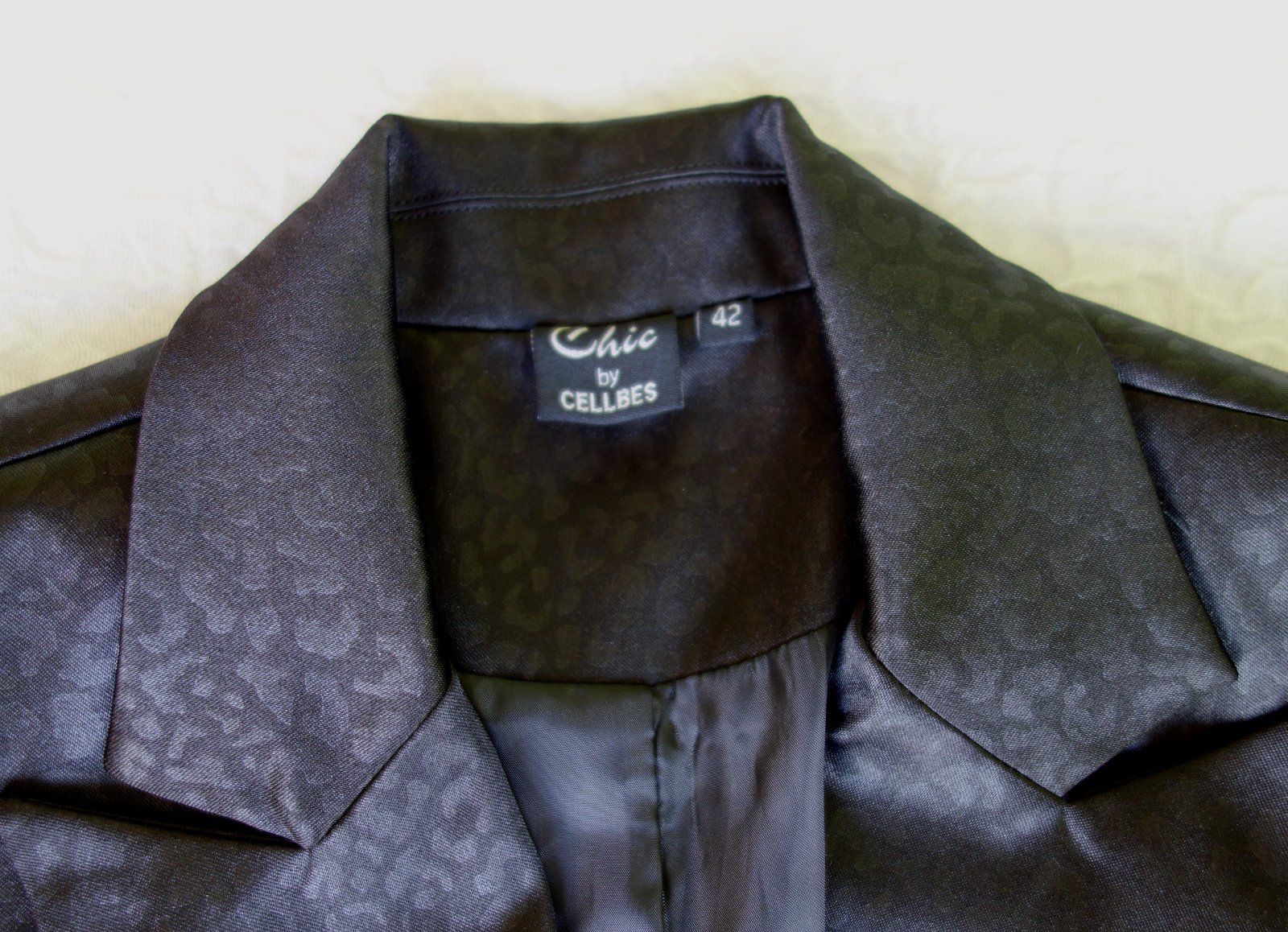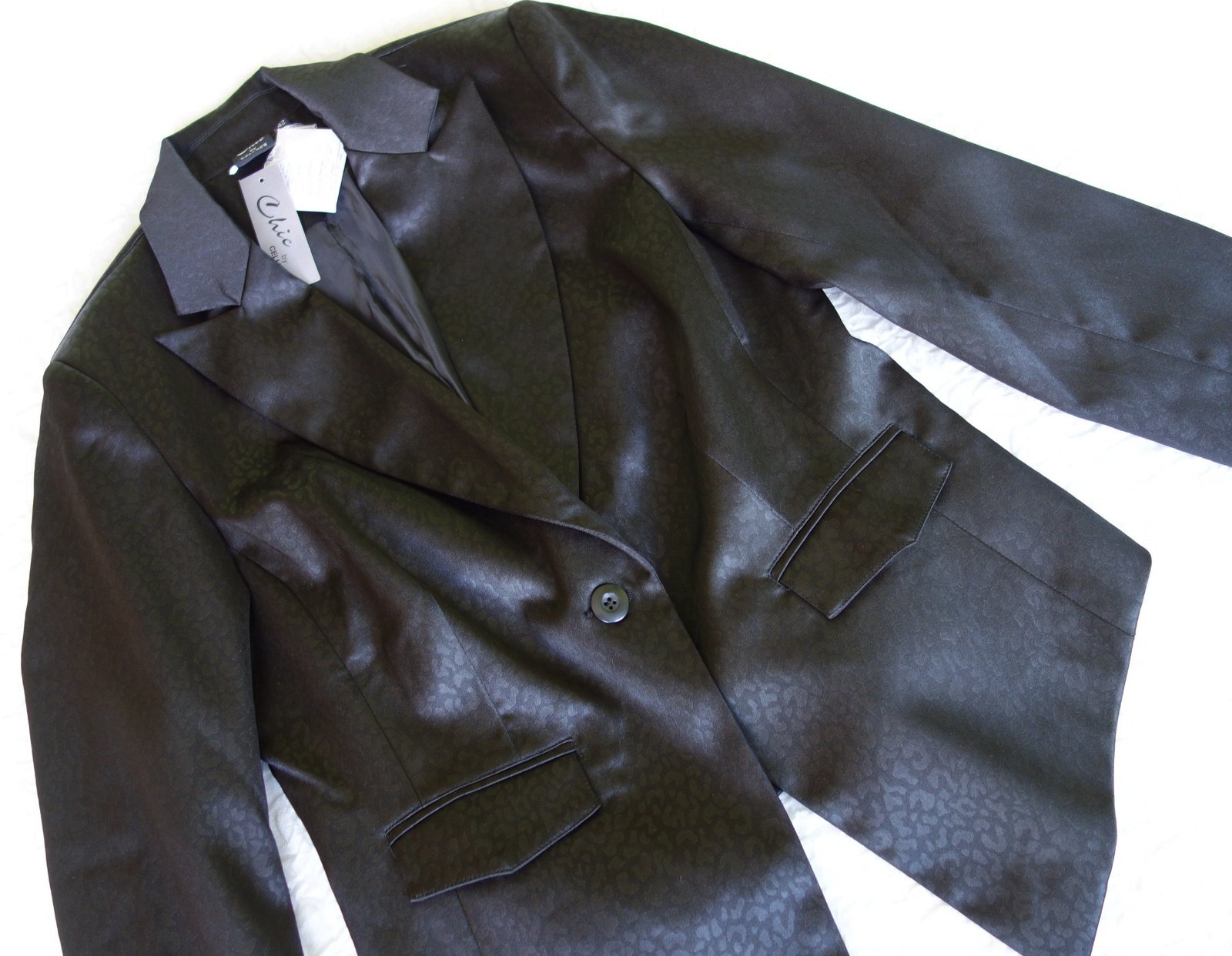 Sako je čierne, v látke čierny jemný vzor. Zapínanie na jeden gombík, fazónka - podšité. Je oveľa krajšie ako na fotkách.