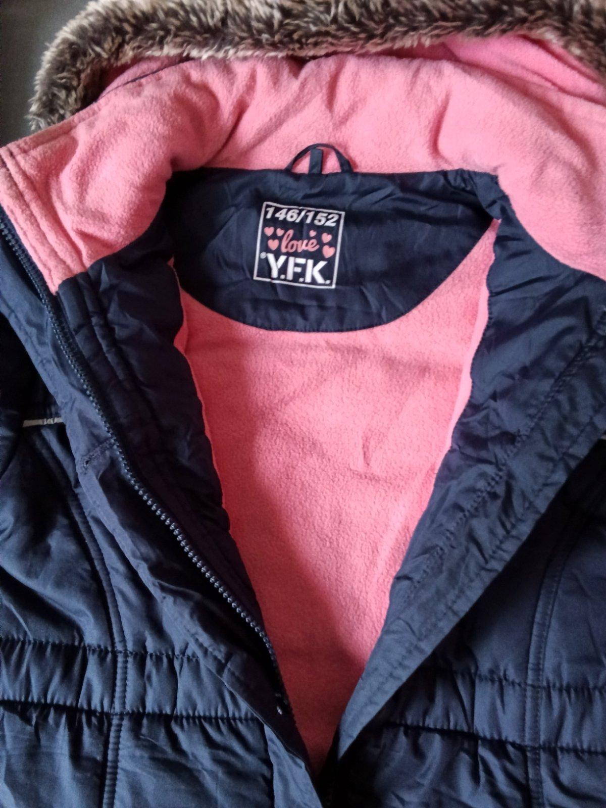 Ponúkam na striedačku nosenú predĺženú zimnú bundu/kabátik 146/152. Značka YFK. Pekný nosený stav, poškodenia som nenašla. Farba zodpovedá poslednej foto.