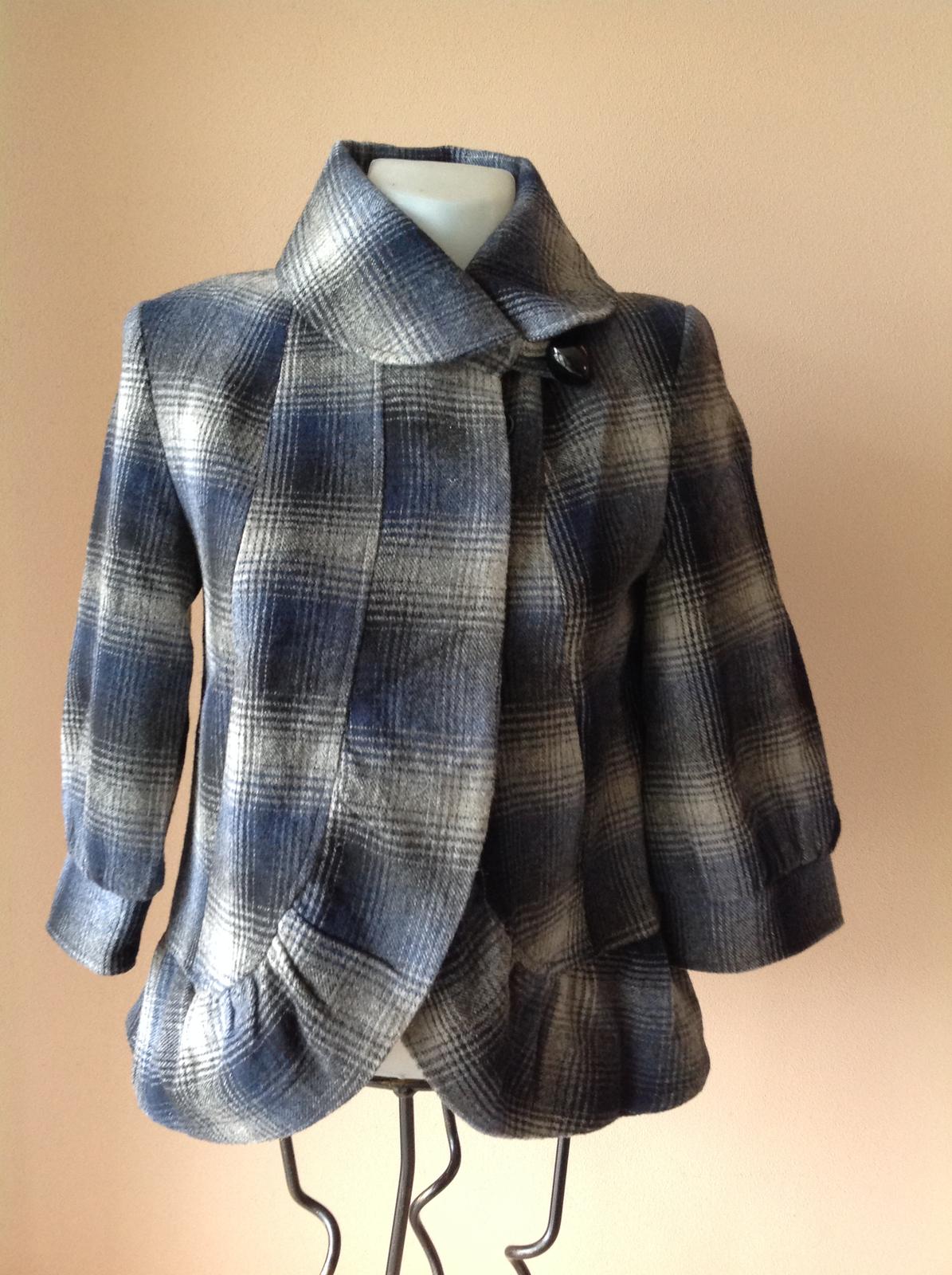 D-59cm,r-42cm od pleca,pazuchy do 45cm,má skryté zapínanie a pod golierom veľký gombík,zlozenie,vlna,acryl,polyester,polyamid