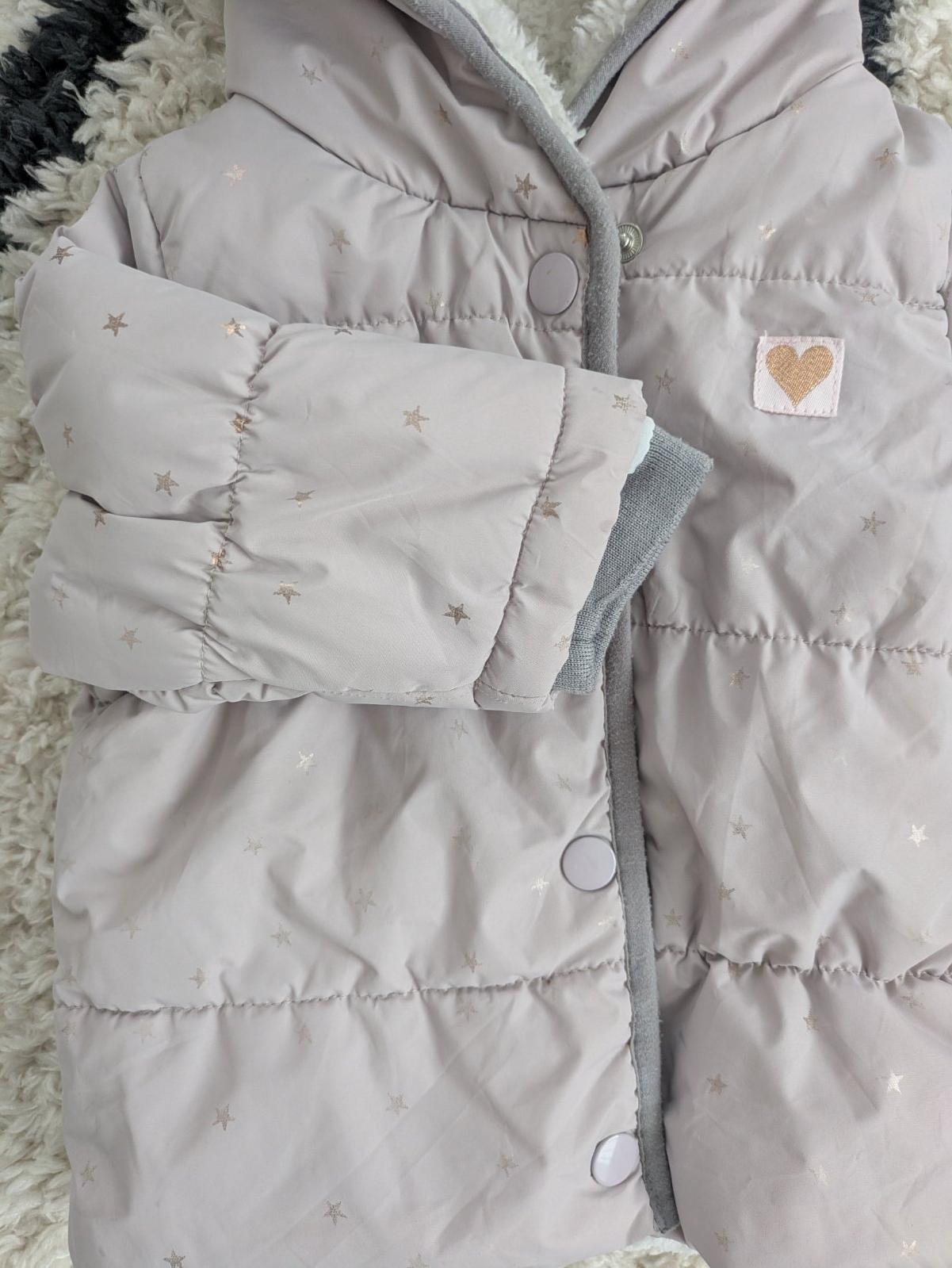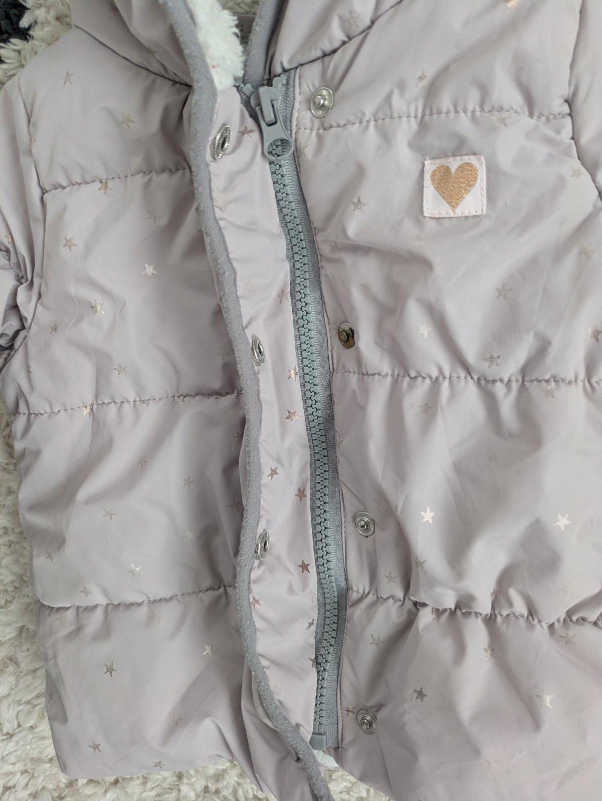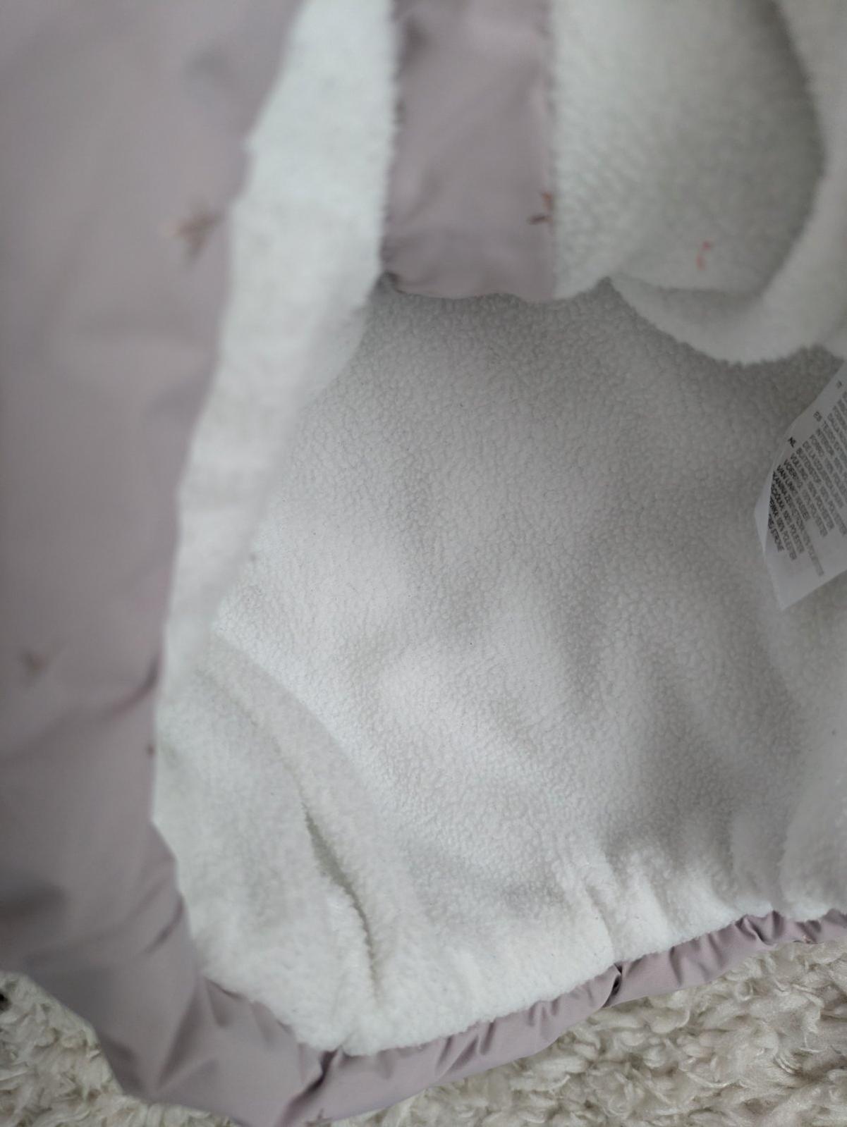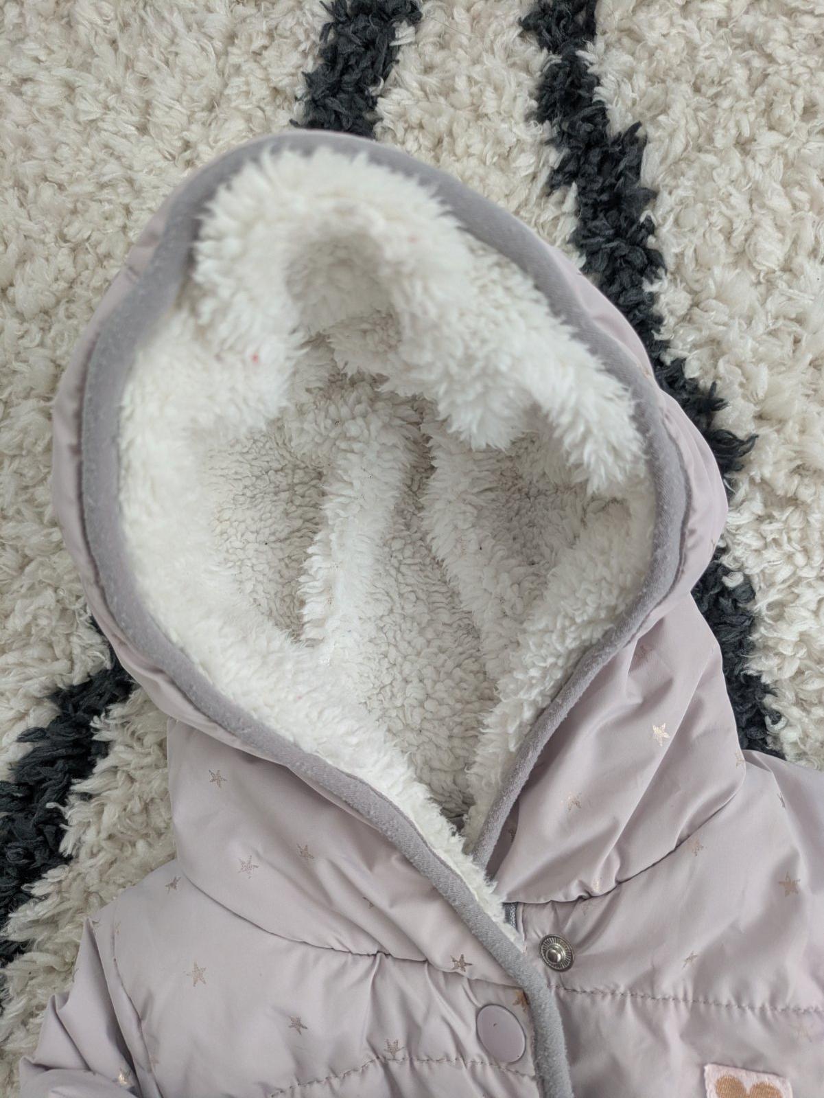 bledá fialová farba, kapucňa na pevno, zapínanie na cvoky, vnútro kapucne mini žmolky, dobrý stav veľkosť: 9-12 mesiacov materiál: bavlna, polyester rozmery: dĺžka od pleca dole 36 cm, šírka pod pa...