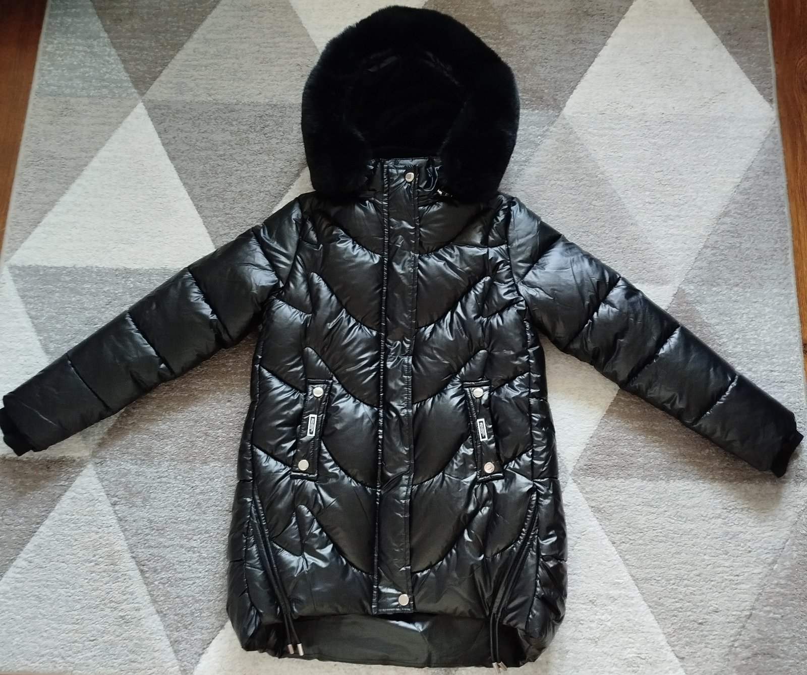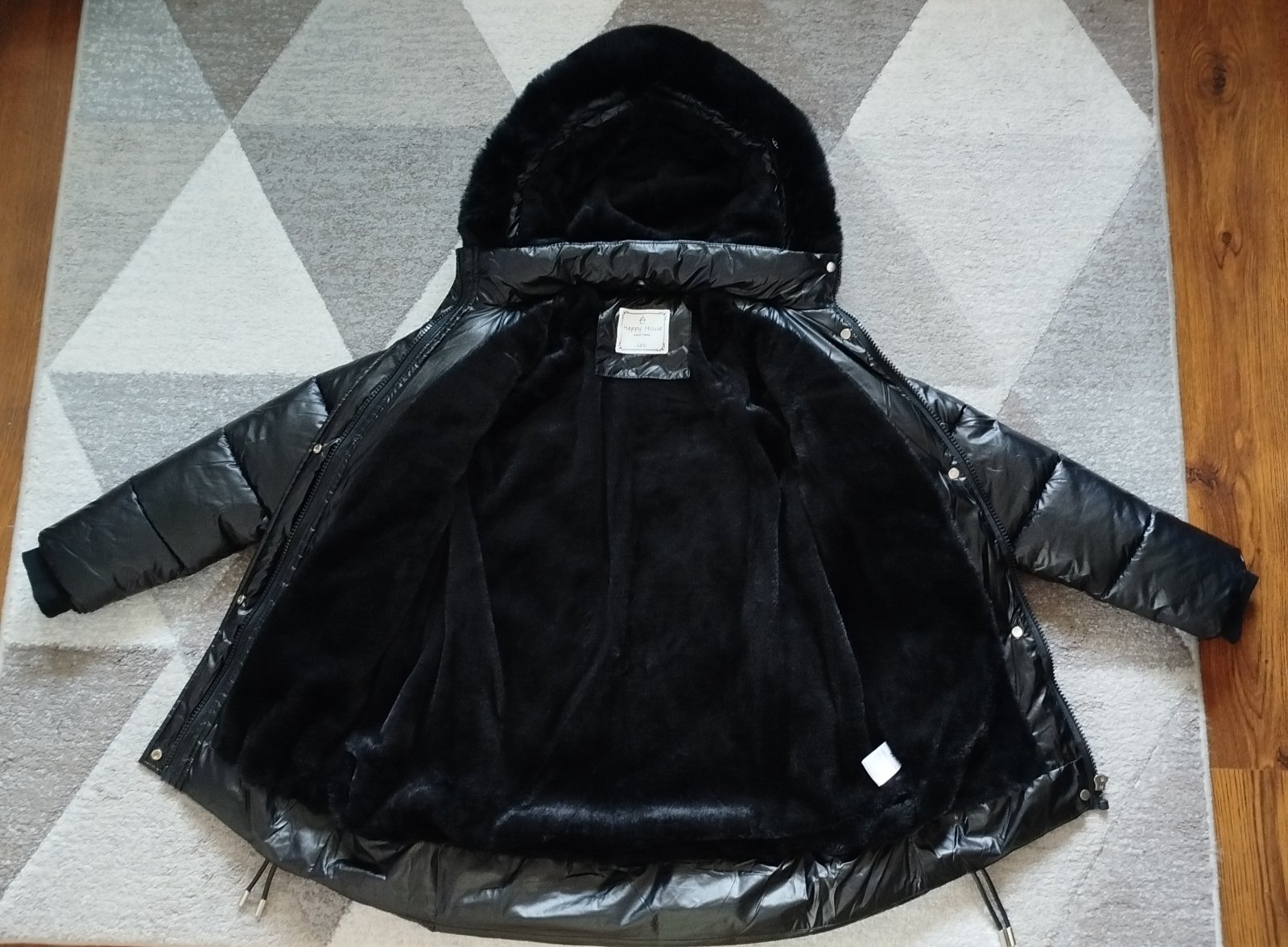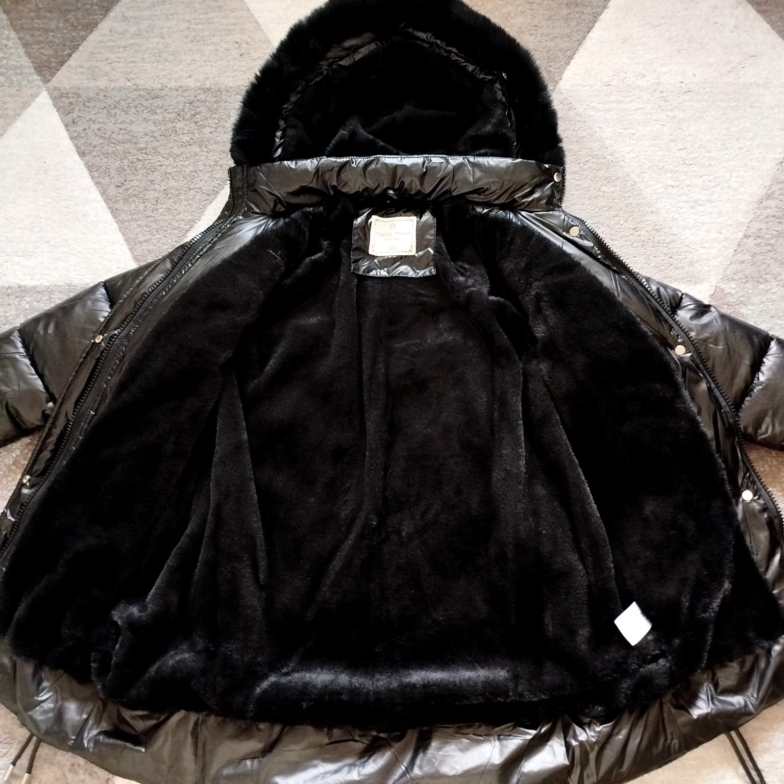 Nádherná teplá bundička Happy House, top stav. Použitá pár krát, dcérke bola od začiatku už malá. Veľkosť písaná na 14 rokov, ale je to 158ka, riaďte sa rozmermi. Dĺžka 76cm, prsia 47cm, rukáv od krku 71cm, rukáv od pleca 62cm. Bundička má zvnútra hebunkú teplú kožušinku, ktorá je aj vo vreckách a zahreje ruky. Kožušinka na kapucke sa dá dať dole a pomocou zipsu sa dá dať dole aj celá kapucka. Na spodku sú ozdobné šnúrky, farba je tmavo čierna, jemne lesklá ale nie metalická. Pôvodná cena bola 50€. Cena + pošta.