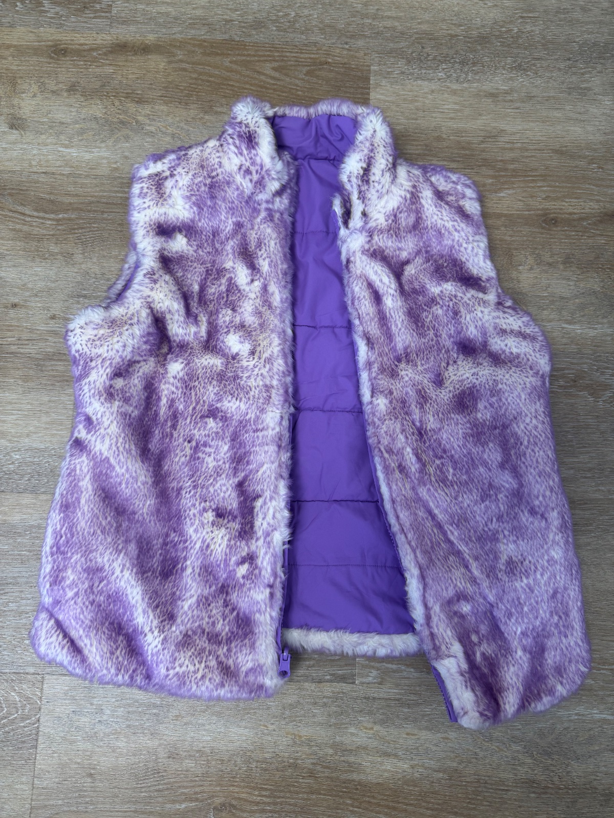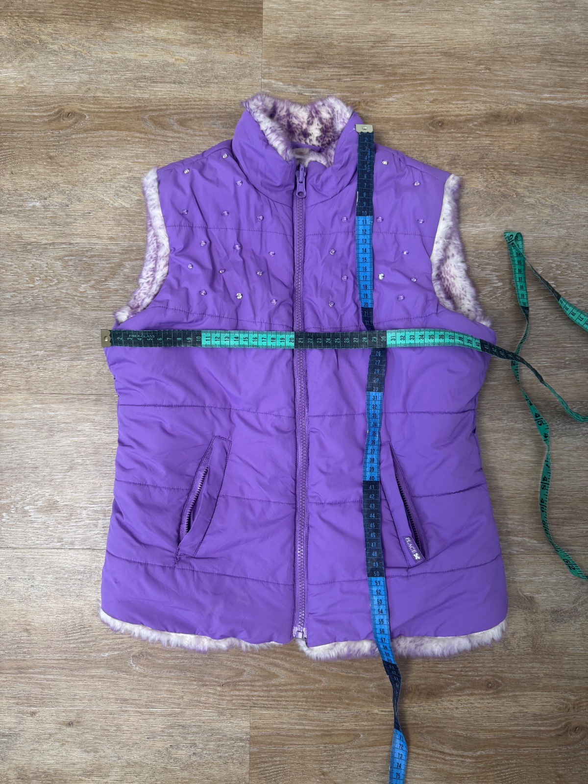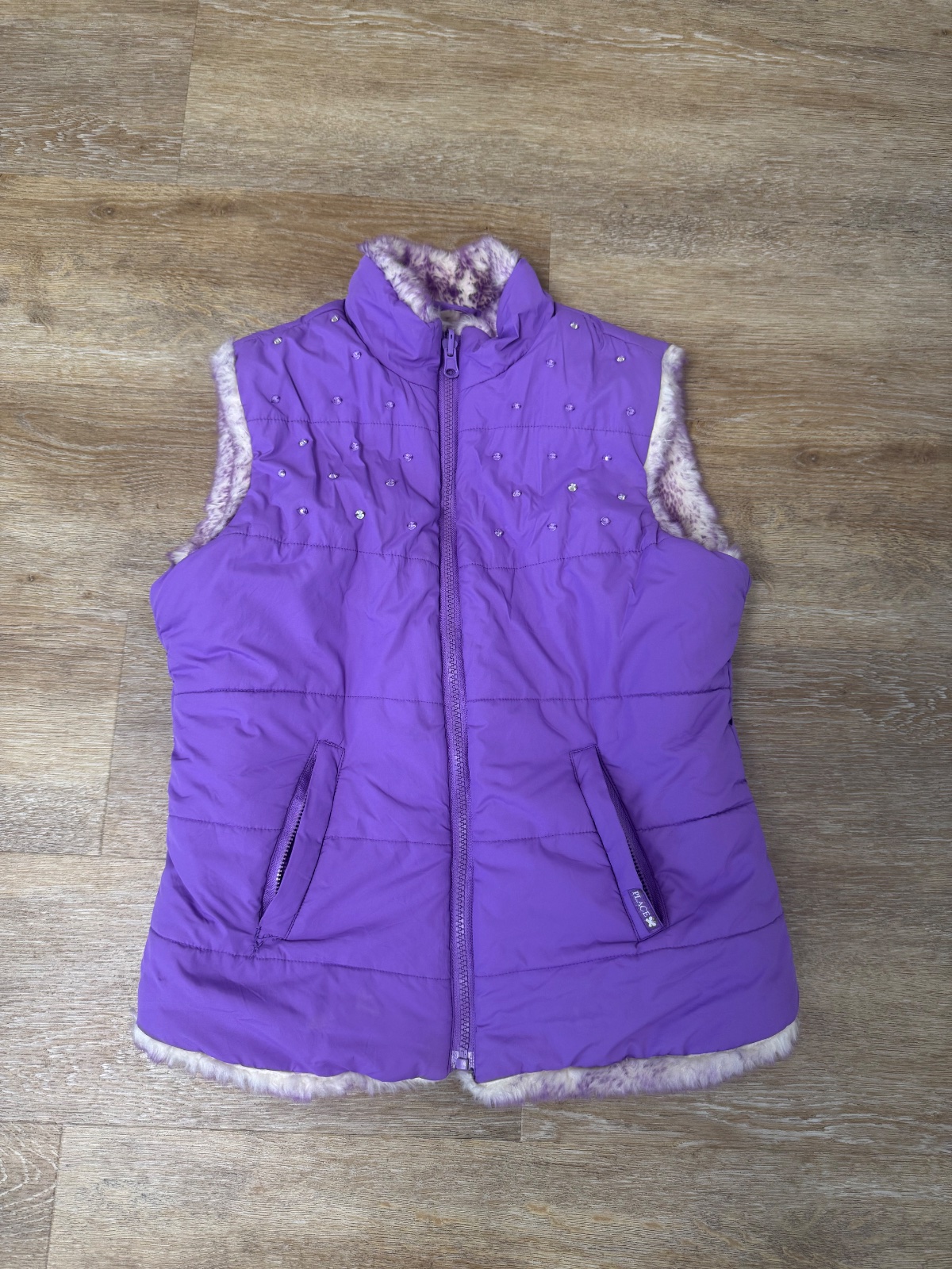 Ponúkam peknú fialovú dievčenskú vestu na zips, ktorá sa dá nosiť obojstranne. Jedna strana fialová hore s flitríkmi a z druhej strany huňatá. Veľkosť uvedená L na 10-12 rokov, ale prikladám aj rozmery. Bola nosená málinko, naďalej je vo veľmi peknom stave. Značka The Children’s Place. Poštovné podľa taríf.